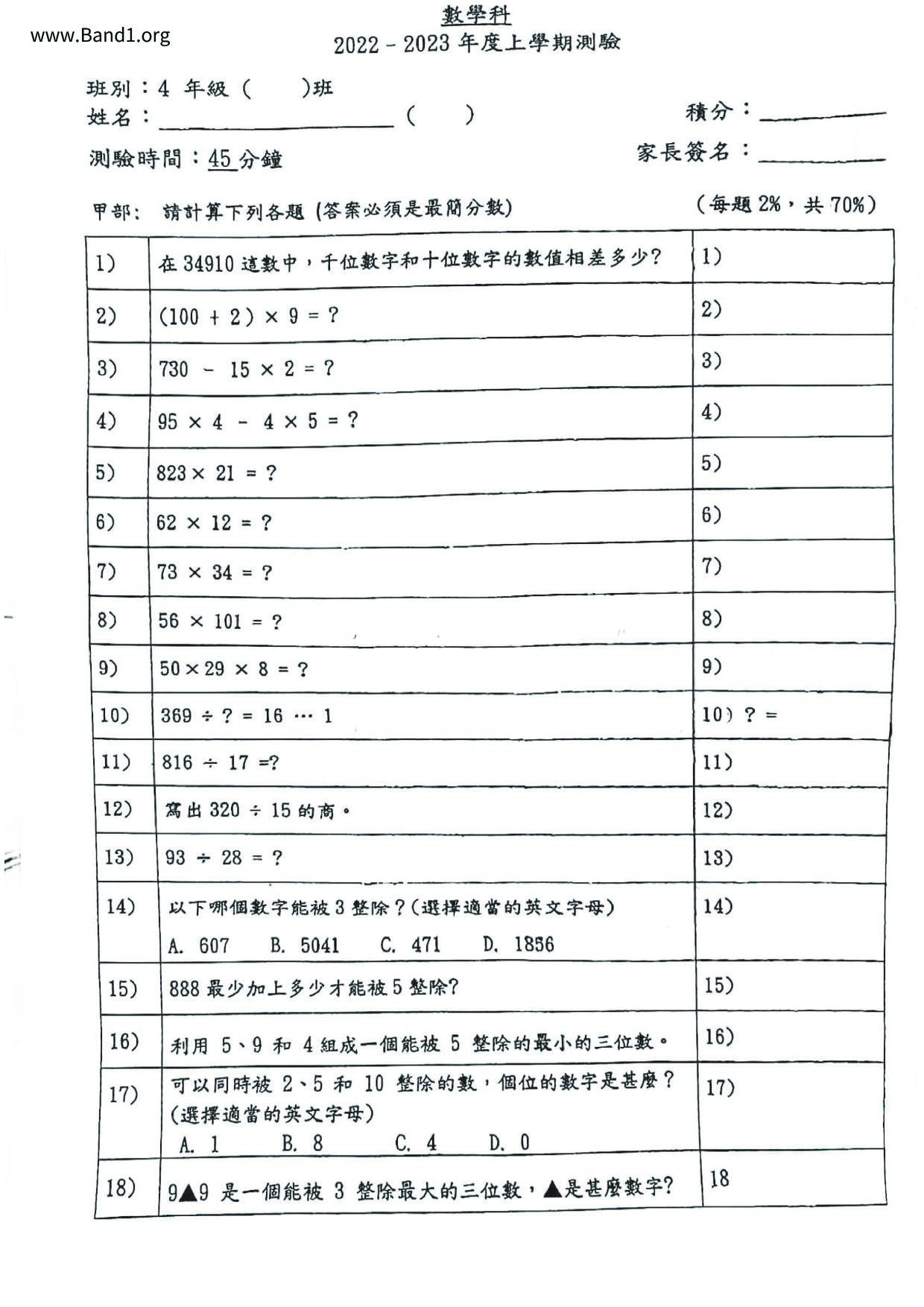 小四 數學 (P4 Maths)