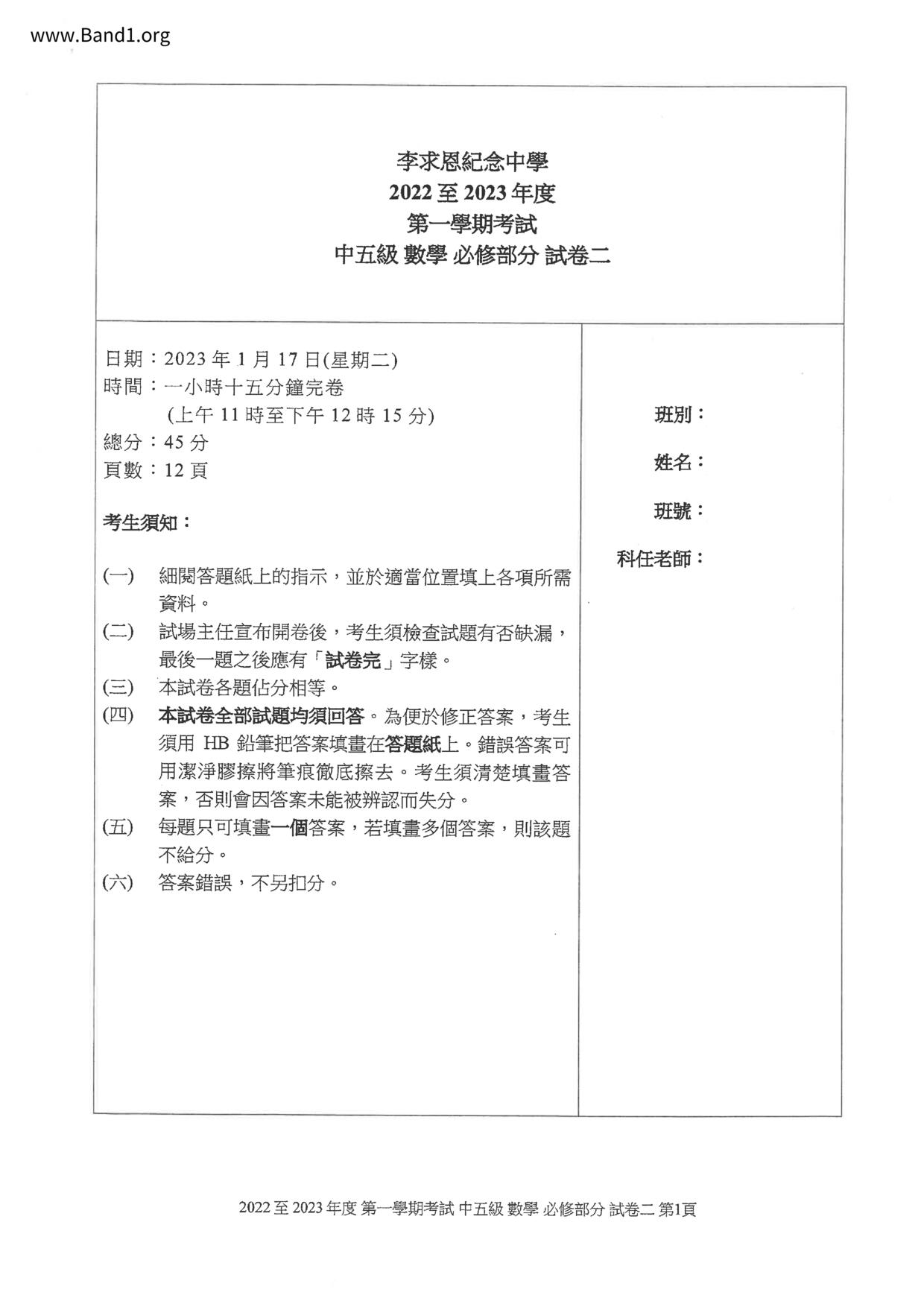 中五 數學 李求恩紀念中學