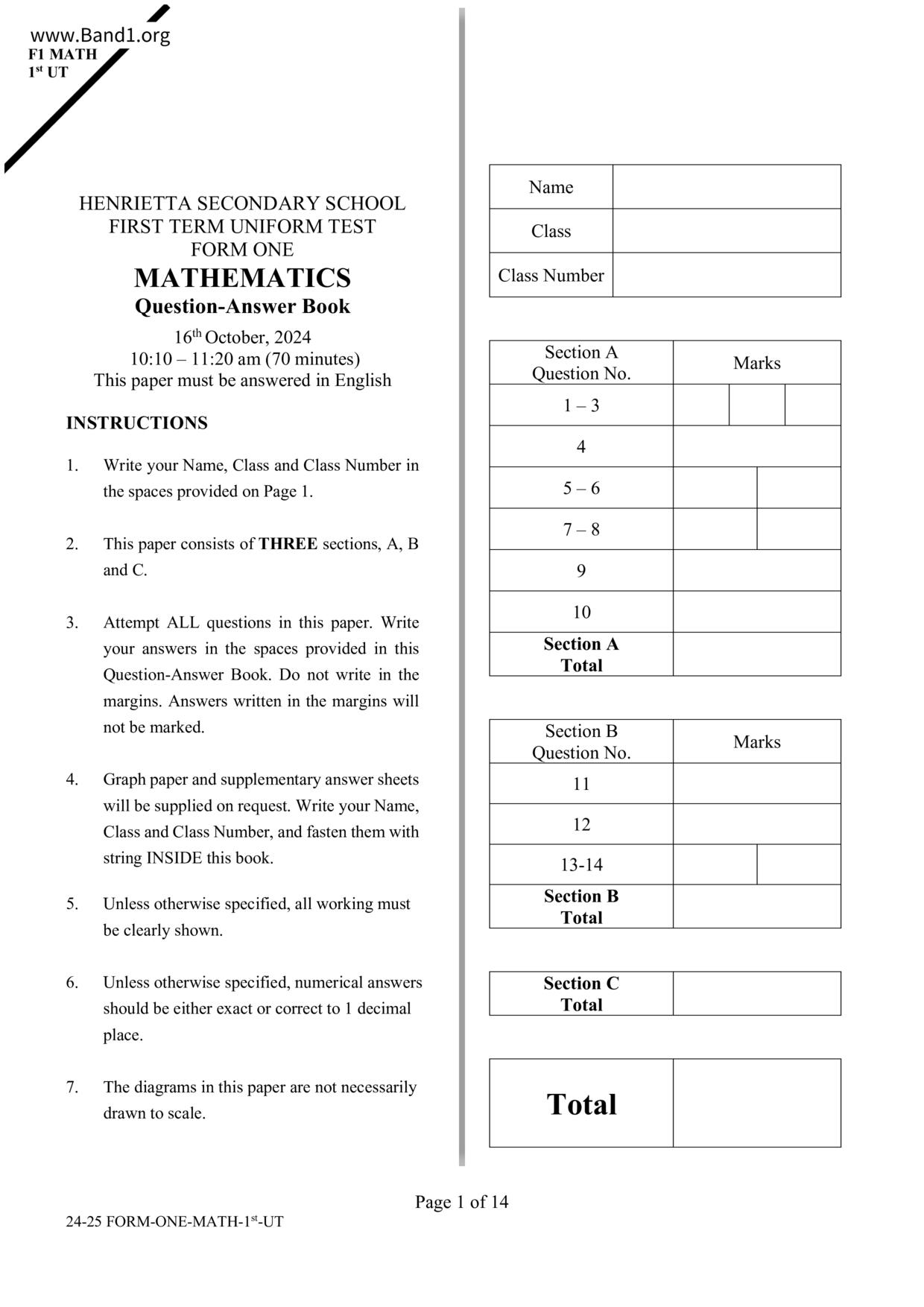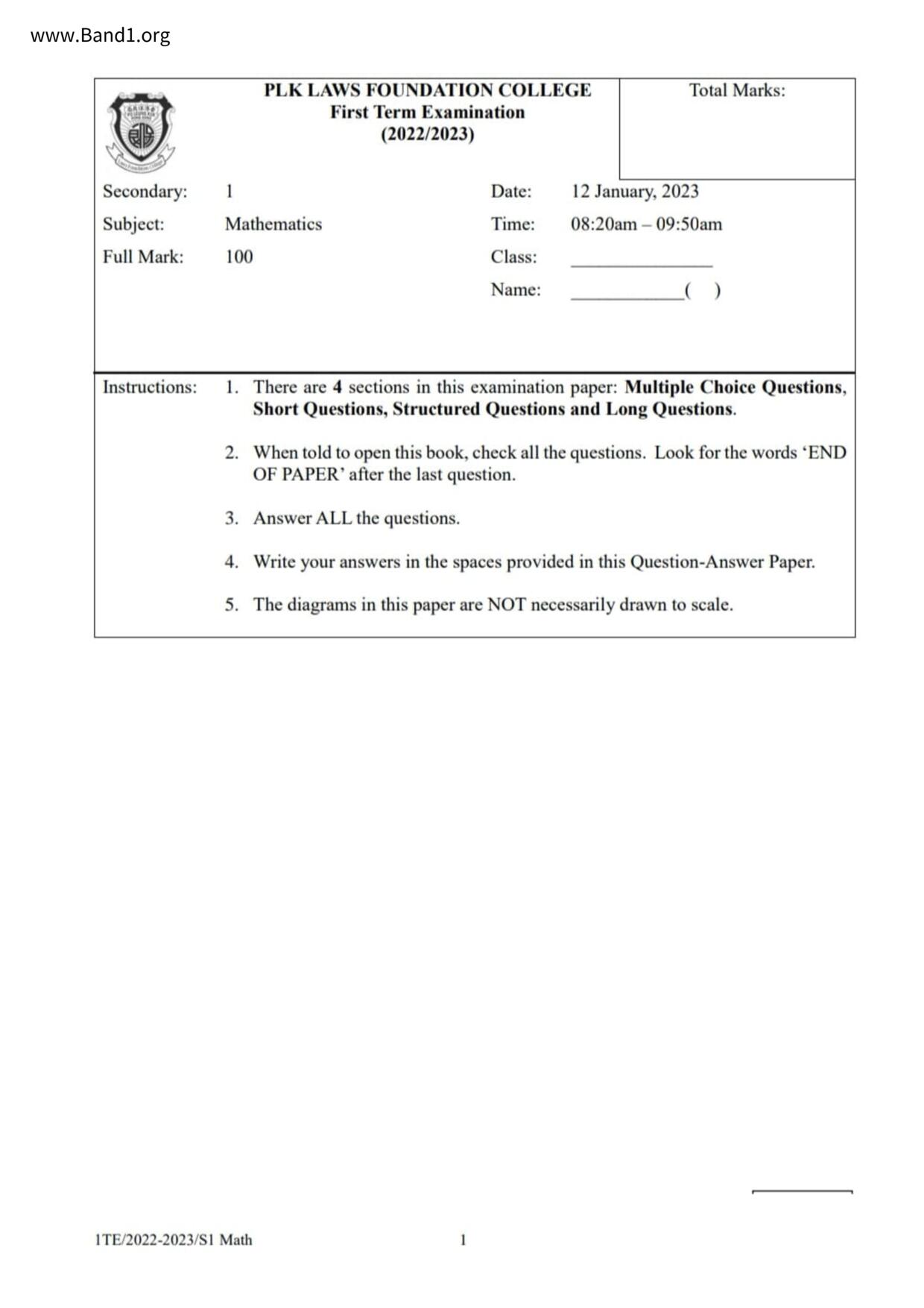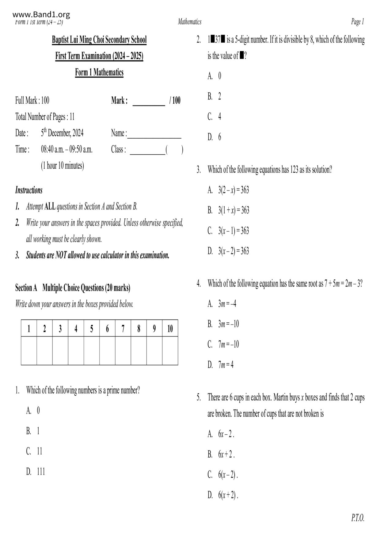 中一 數學 浸信會呂明才中學