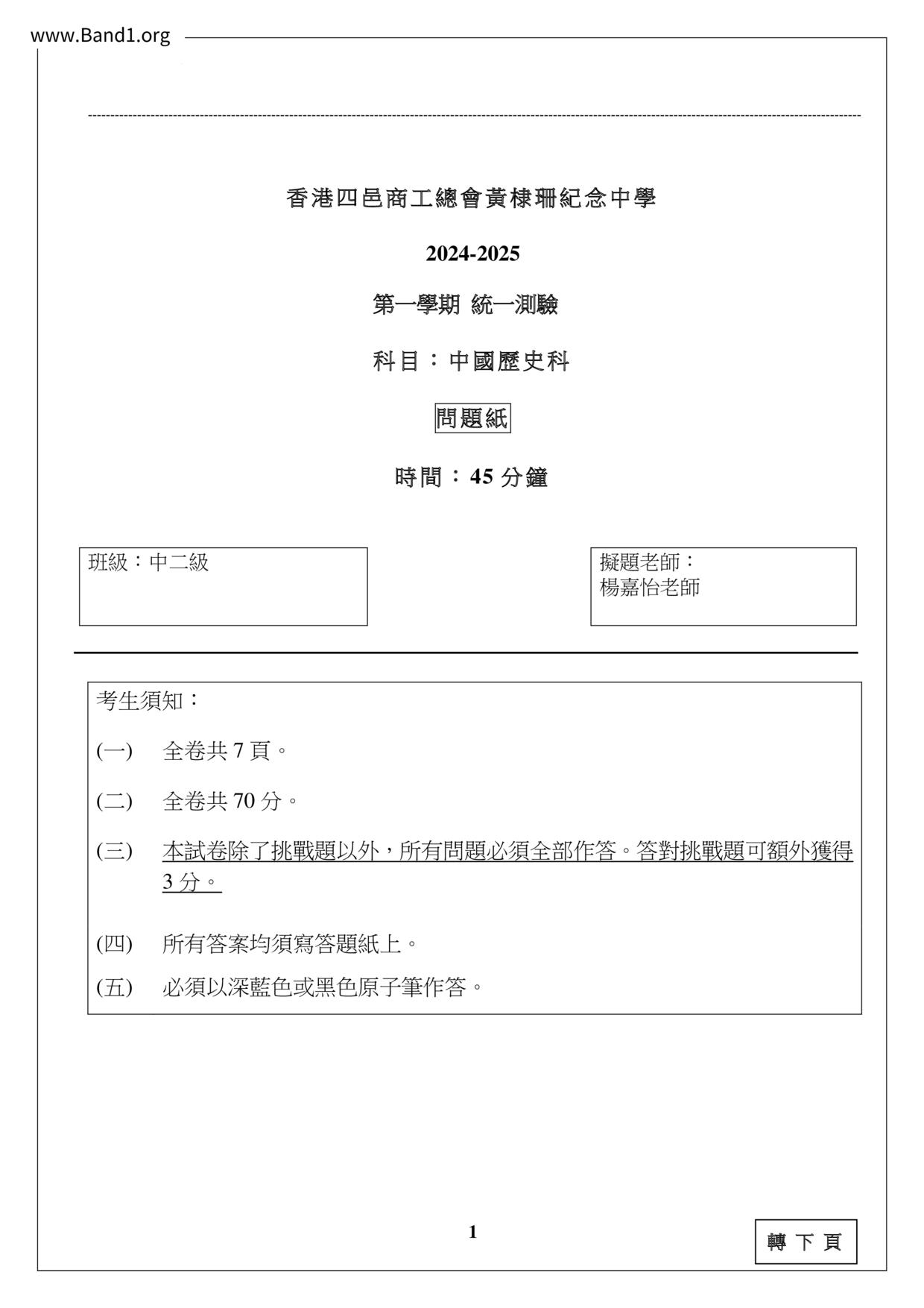 中二 中史 香港四邑商工總會黃棣珊紀念中學