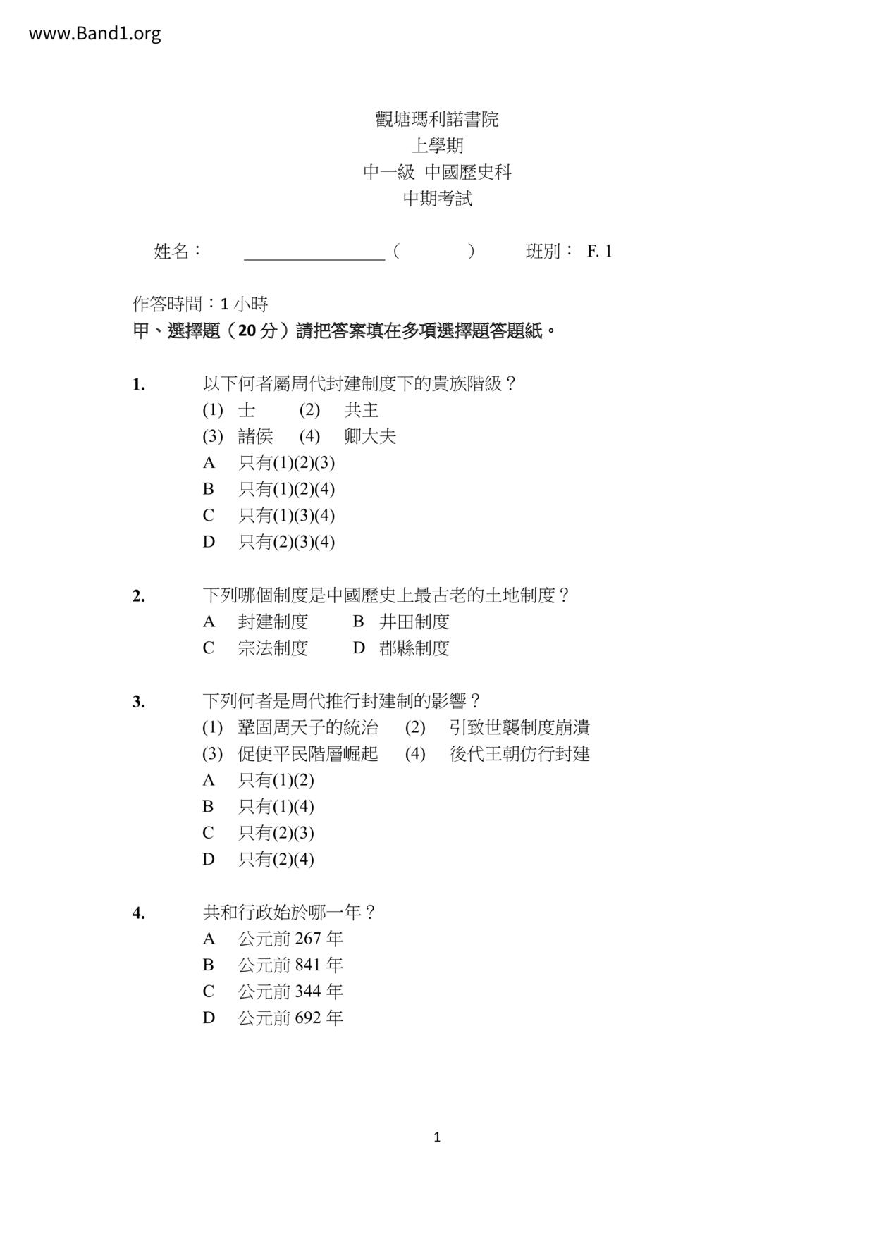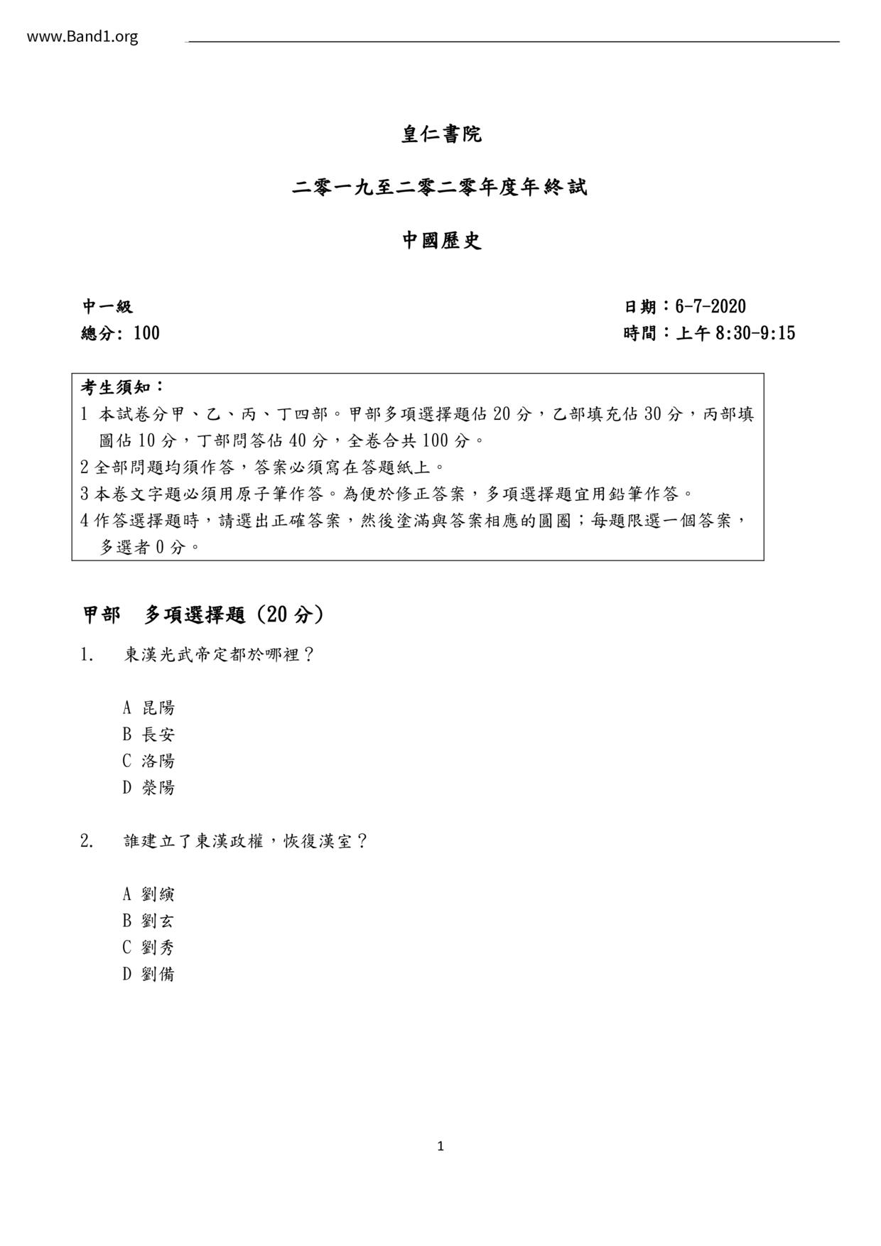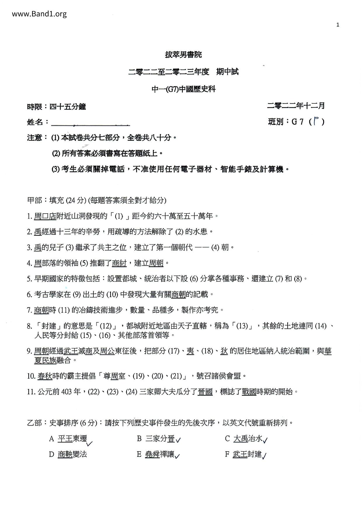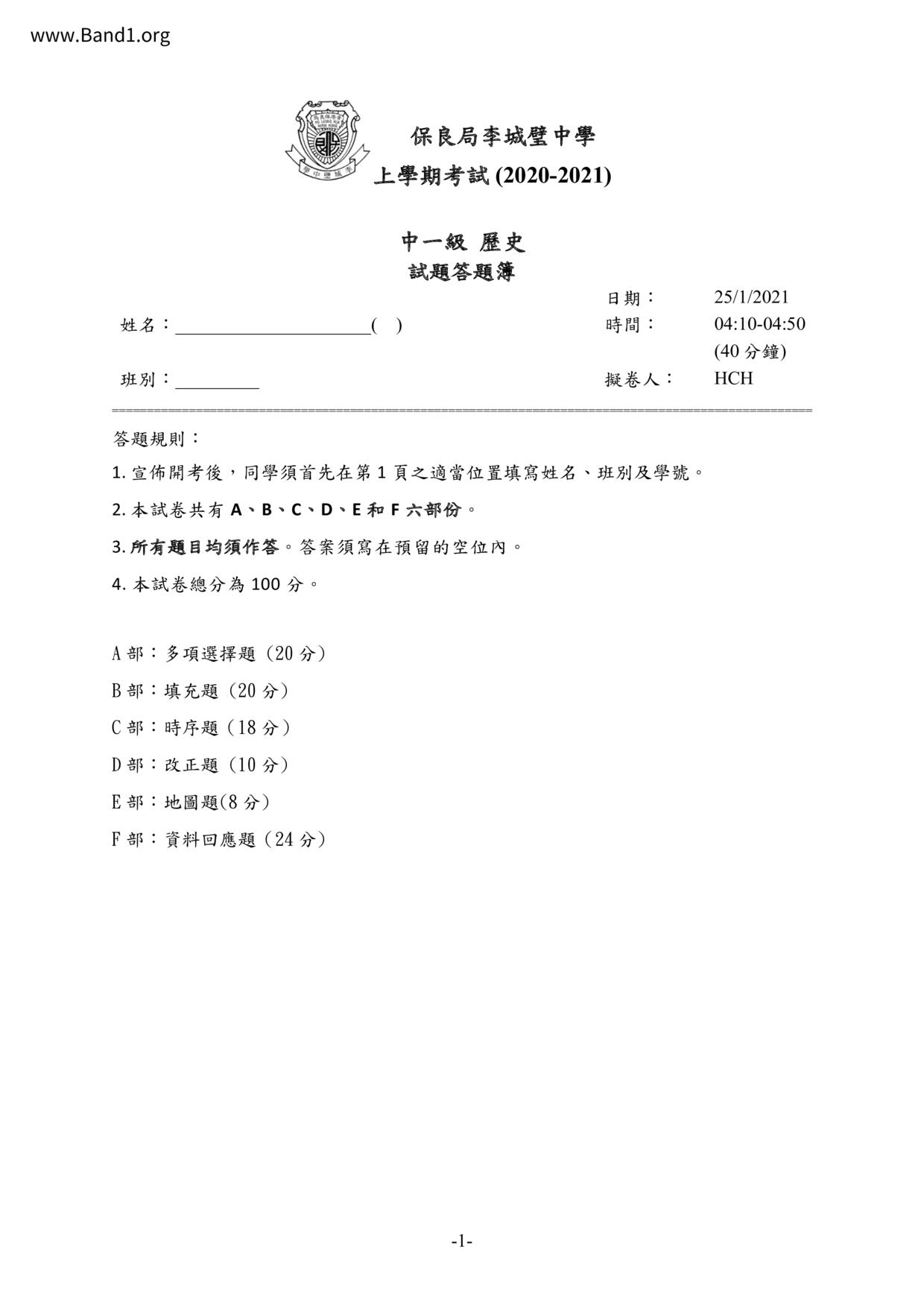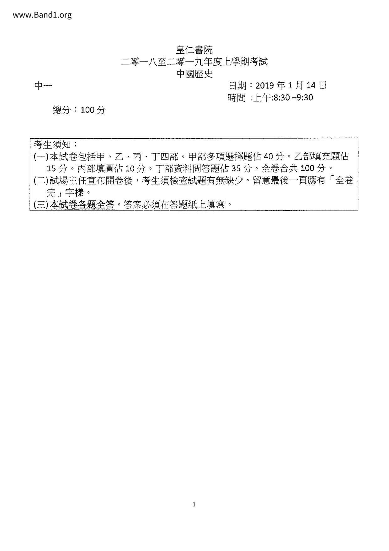 中一 中史 香港四邑商工總會黃棣珊紀念中學