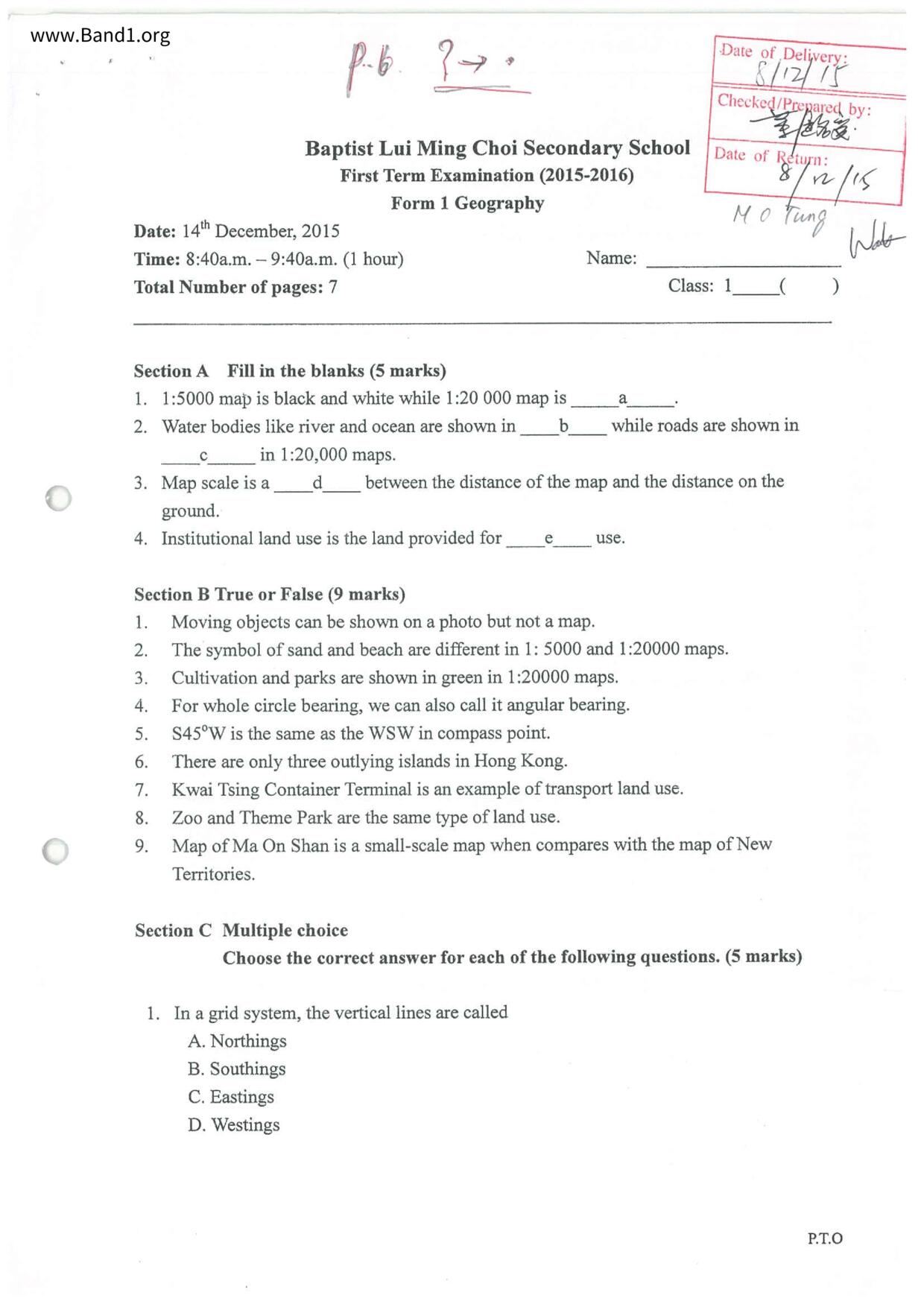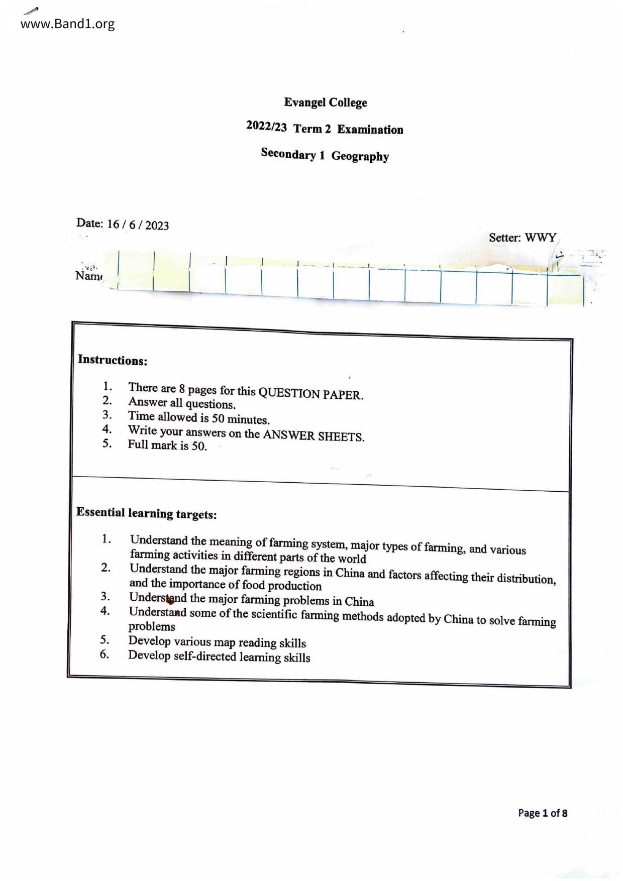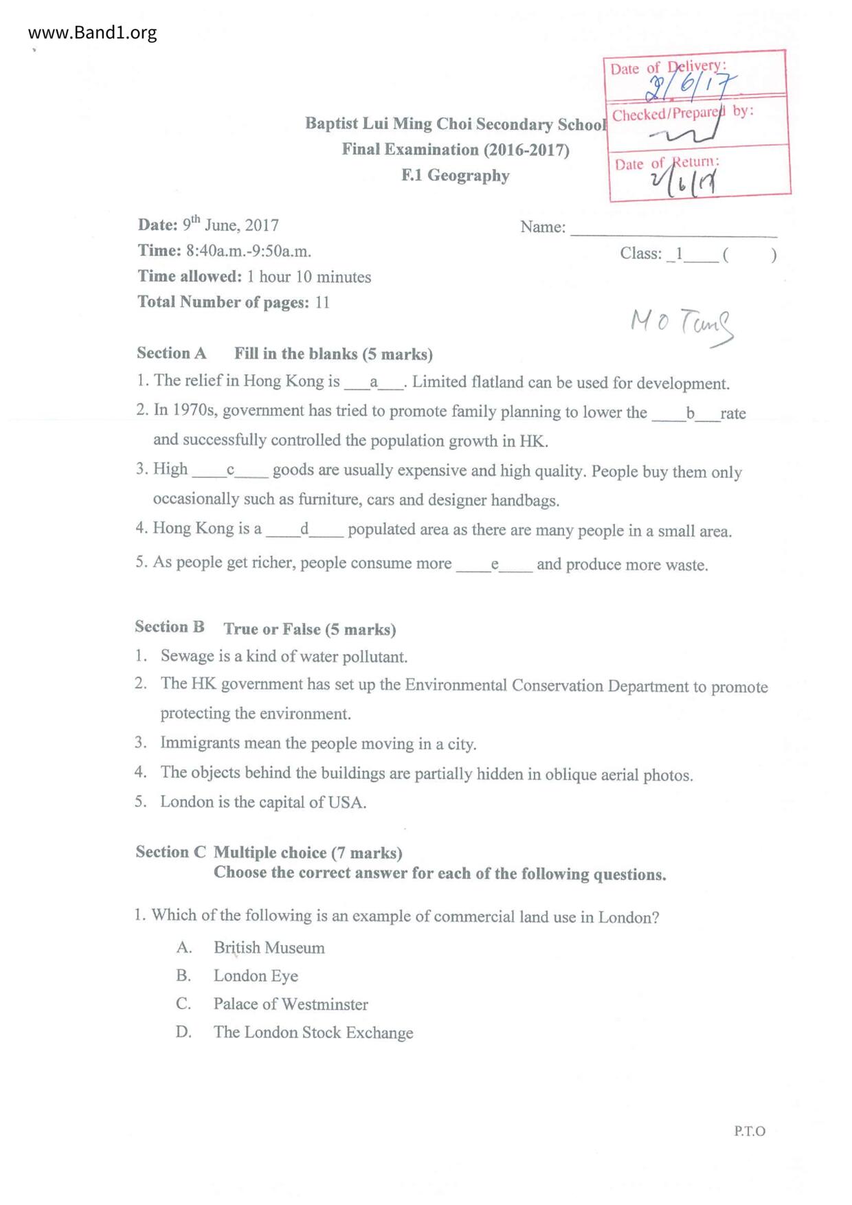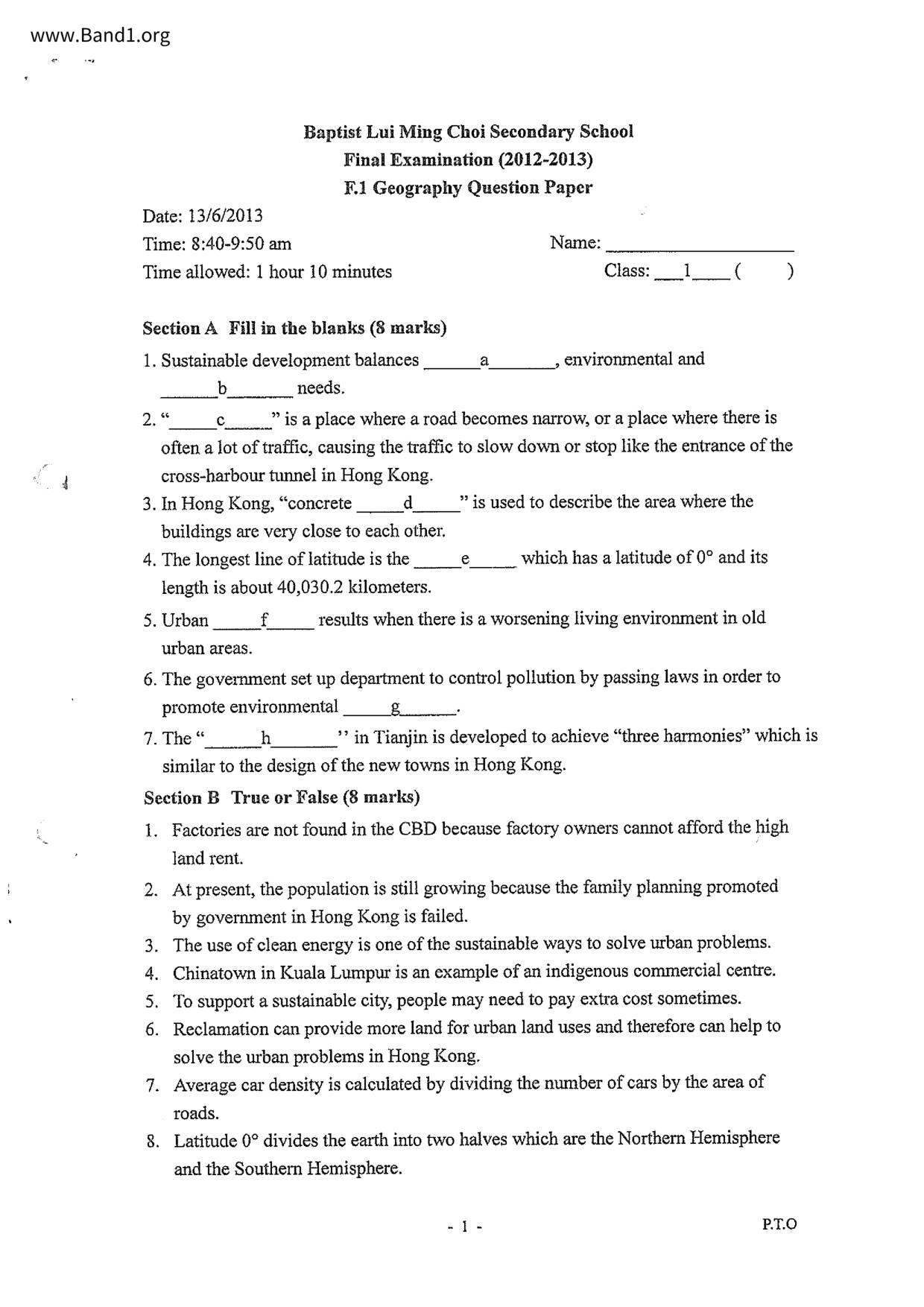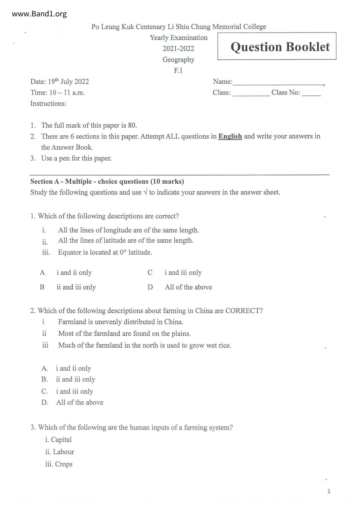 中一 地理 香港四邑商工總會黃棣珊紀念中學