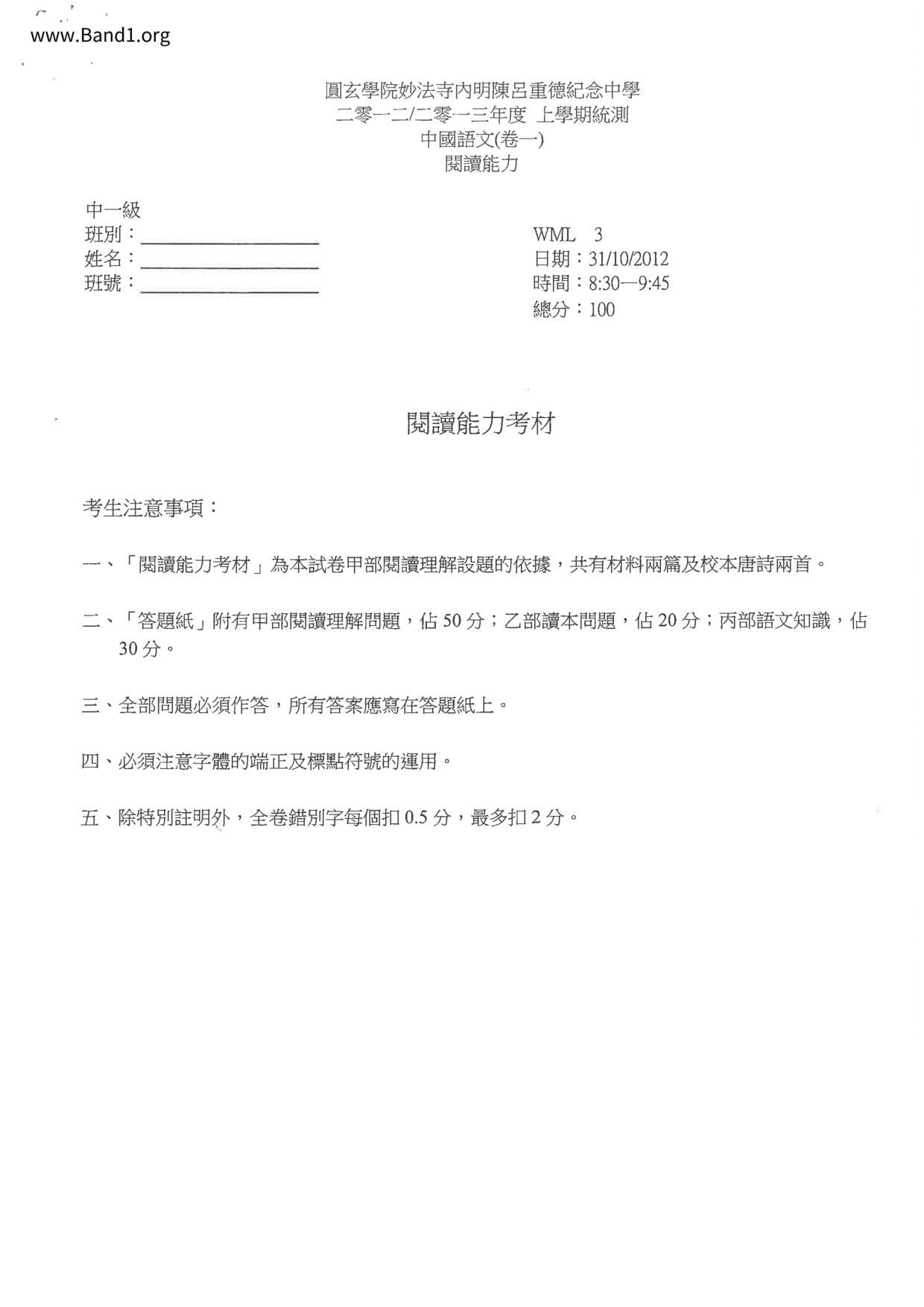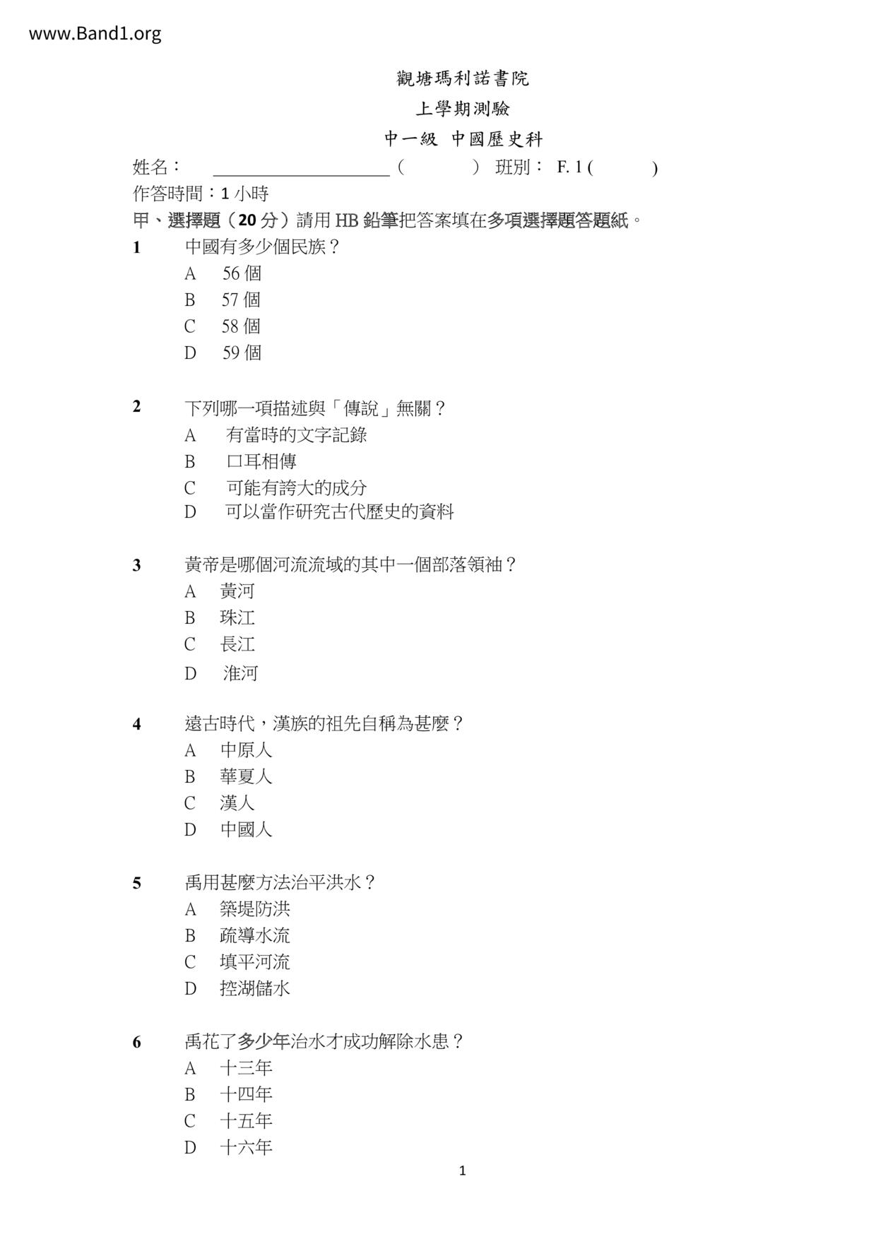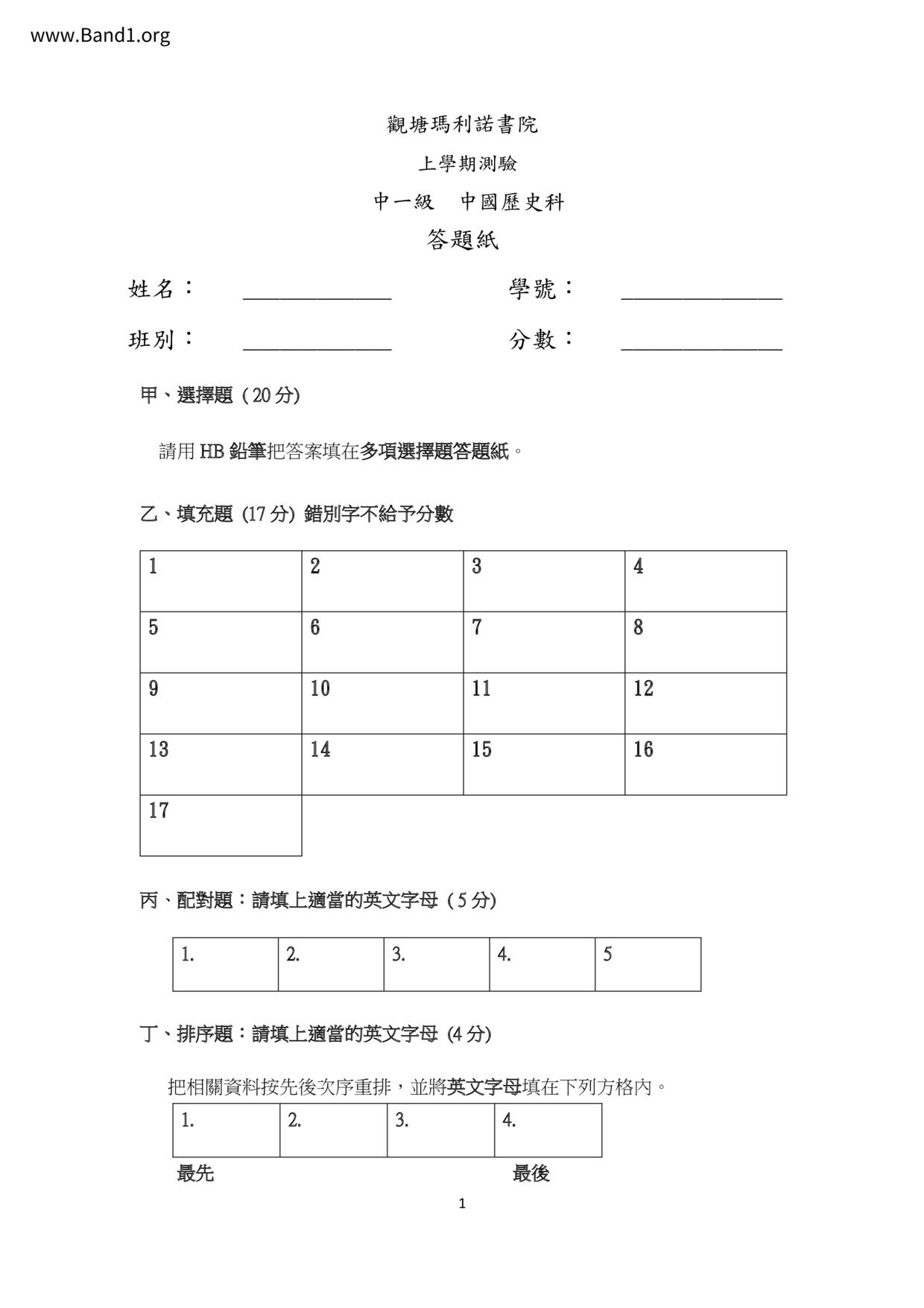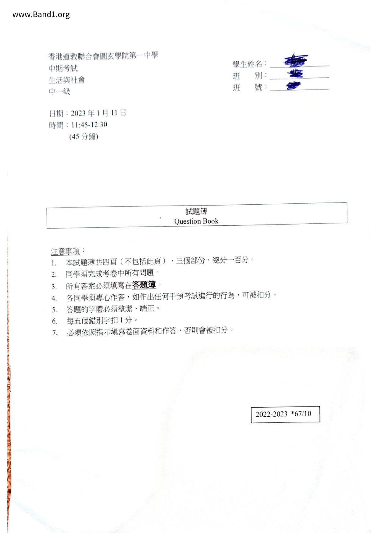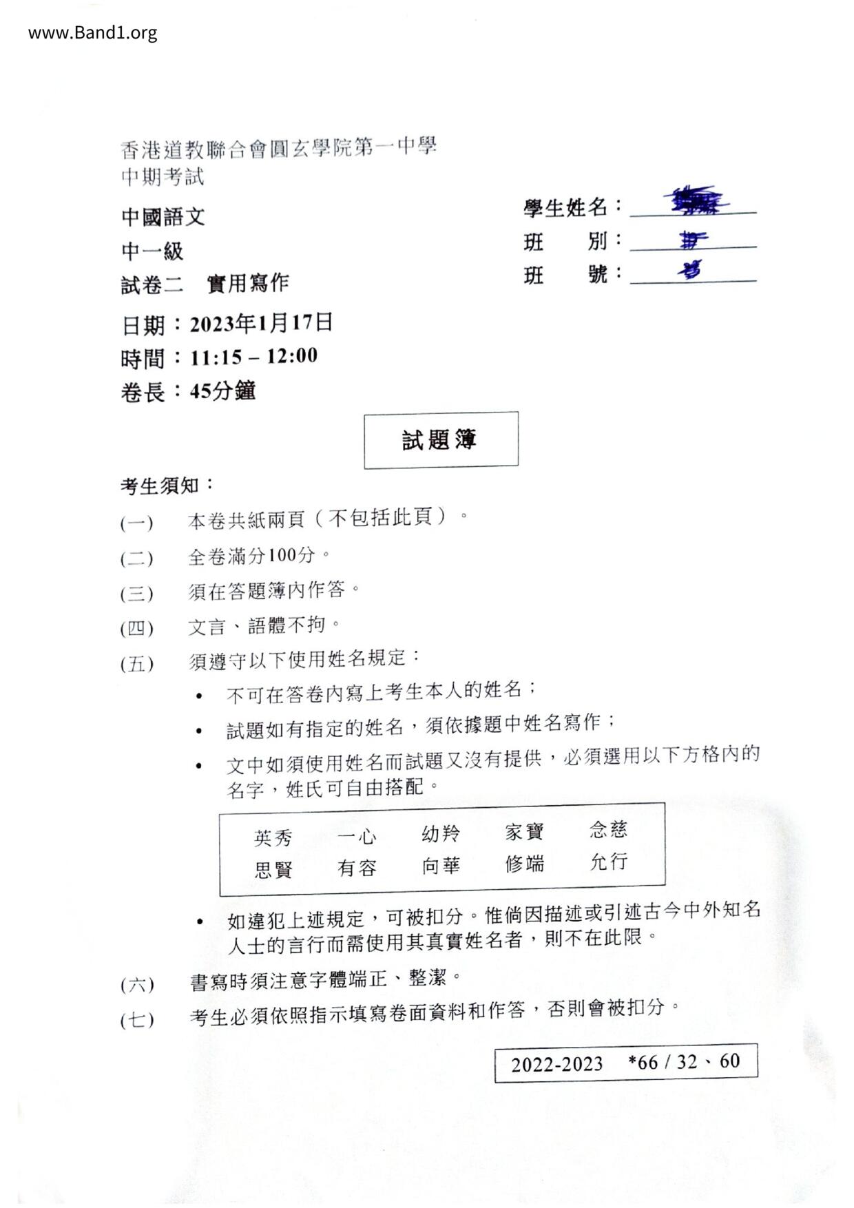 中一 其他科目 香港道教聯合會圓玄學院第一中學