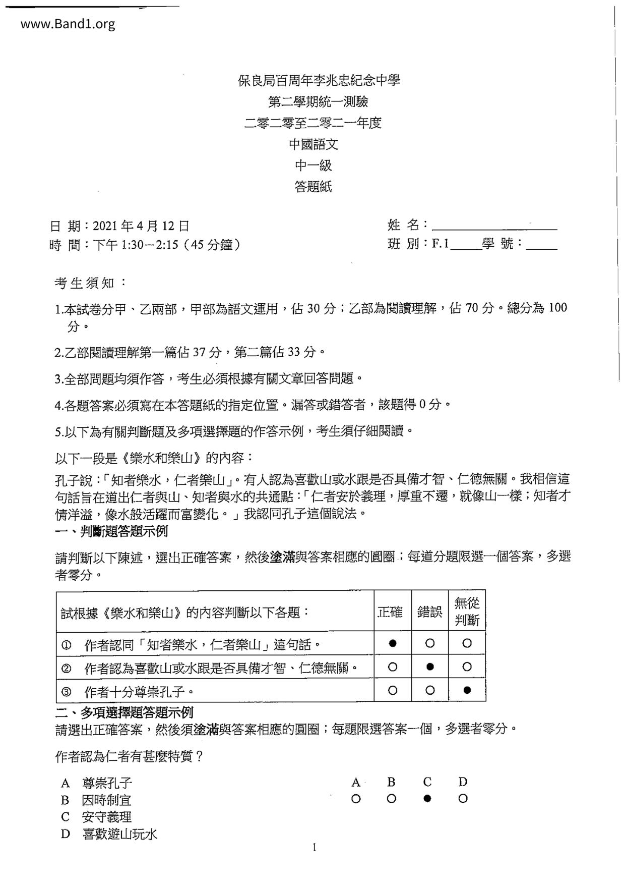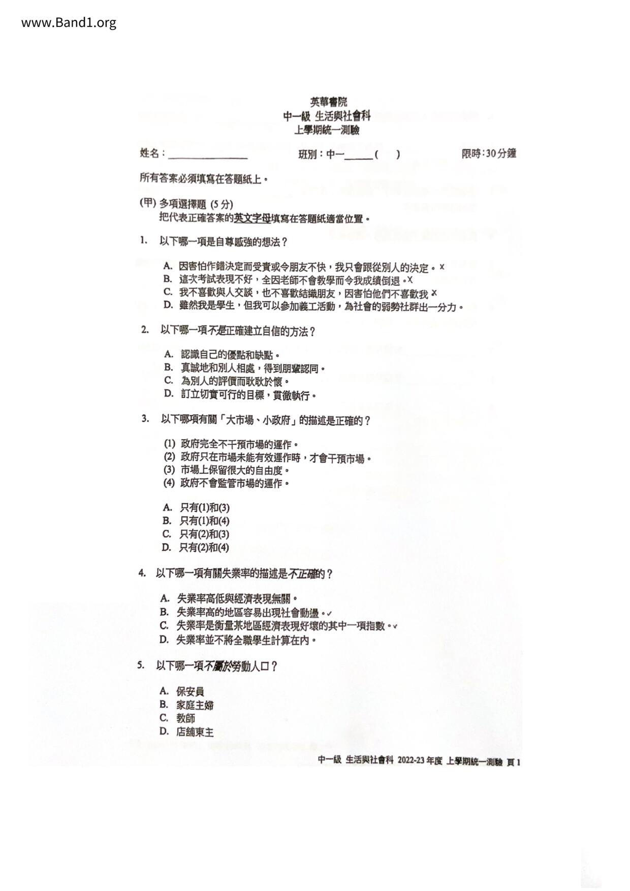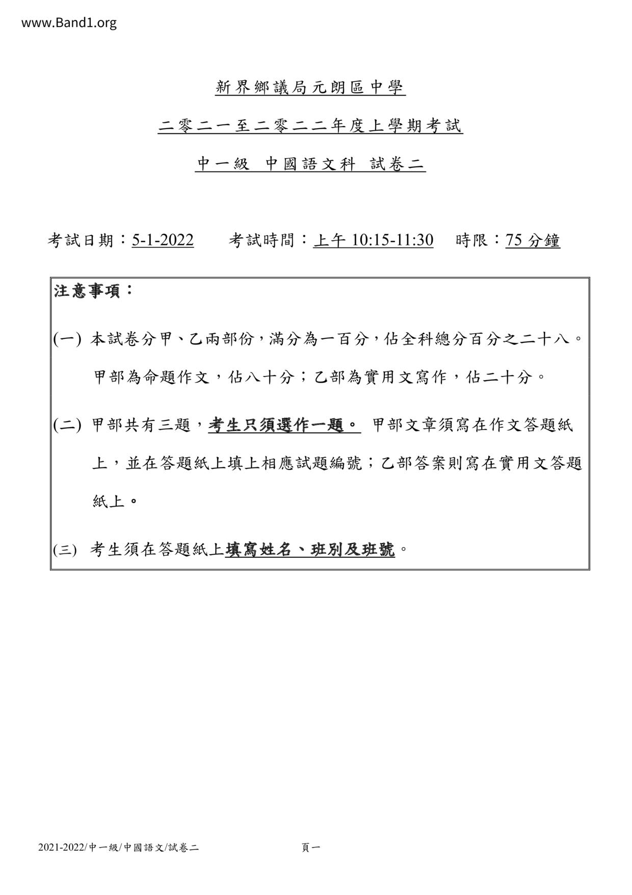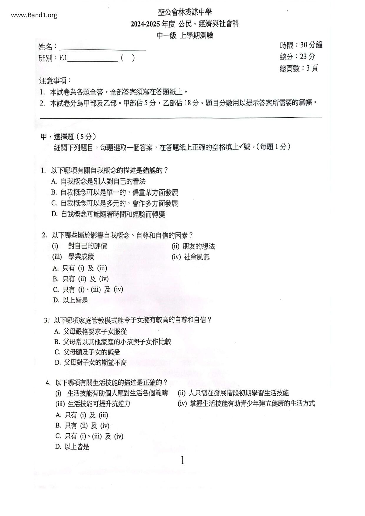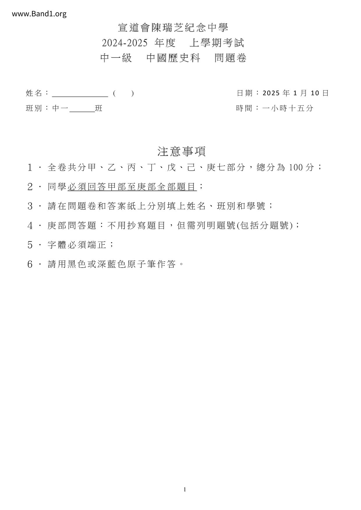 中一 其他科目 香港道教聯合會圓玄學院第一中學