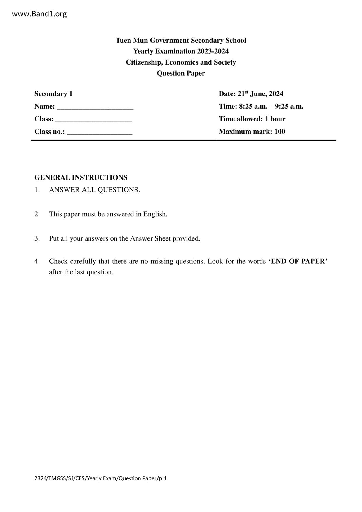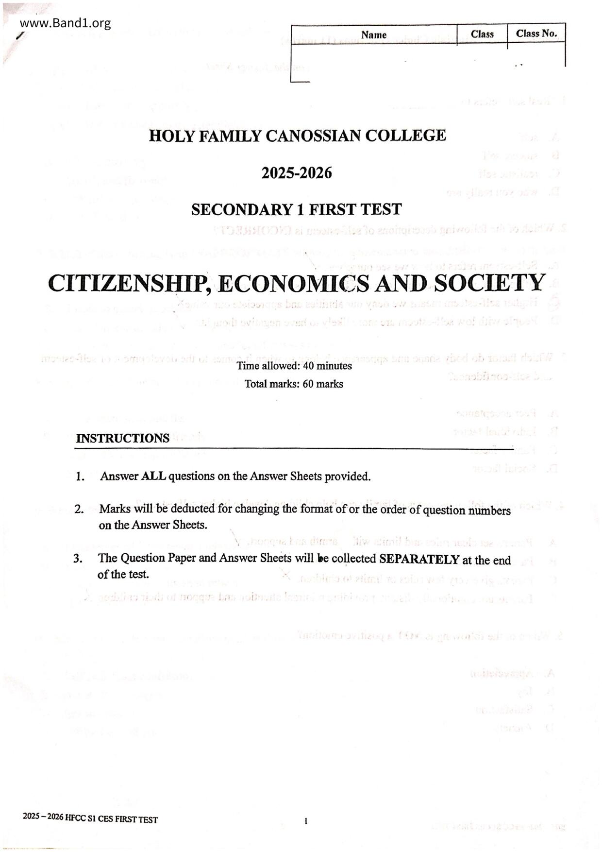 香港 中一 各科 (HK F1) 試卷 pdf