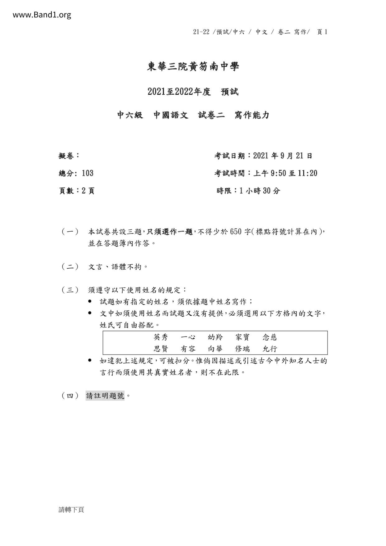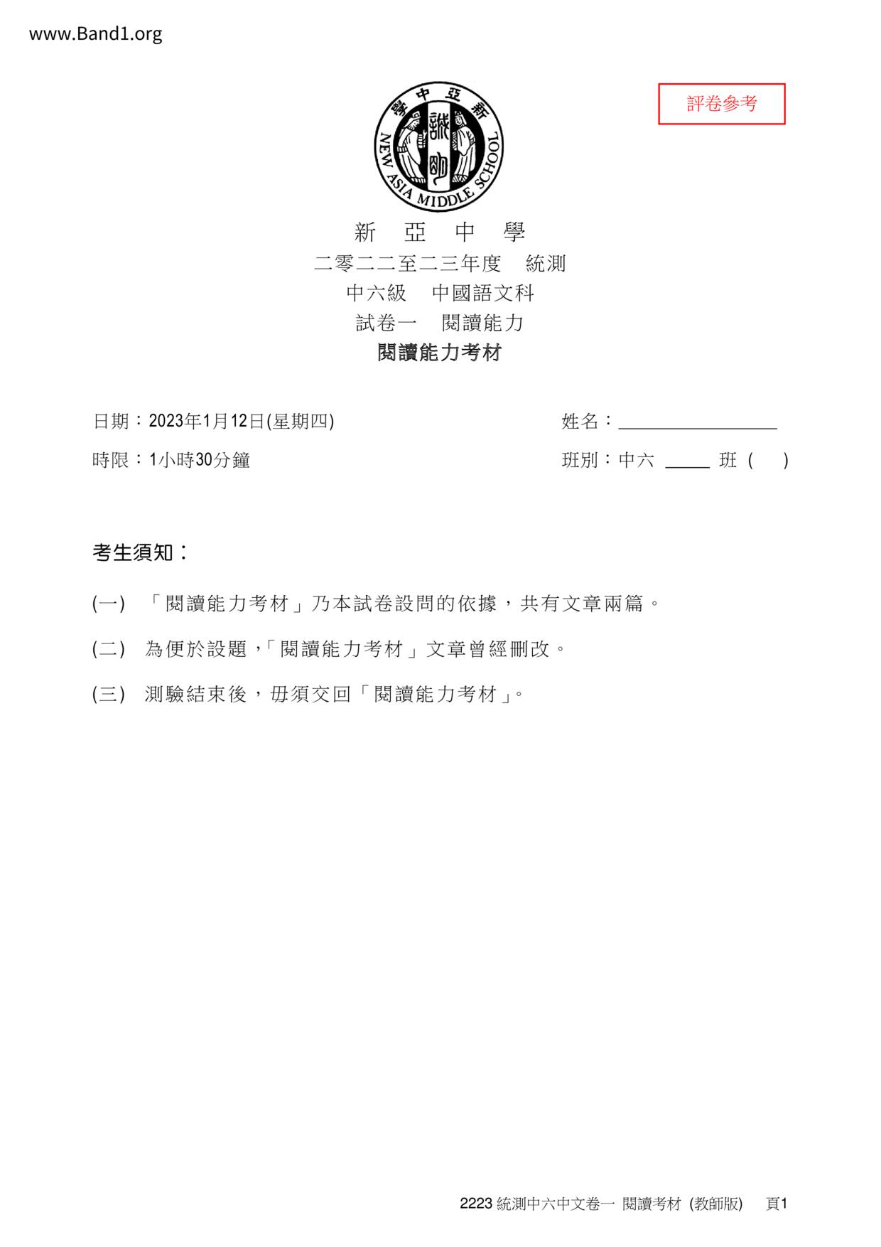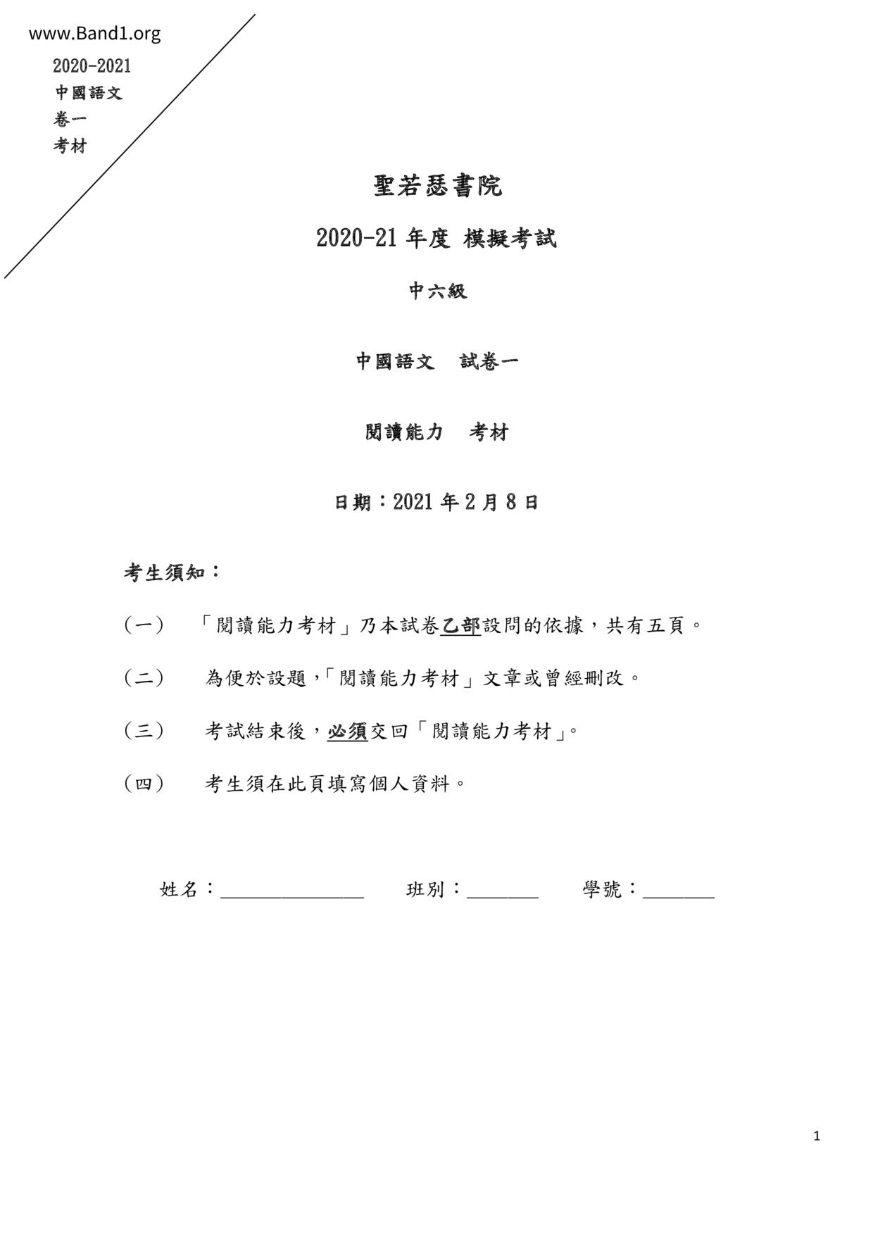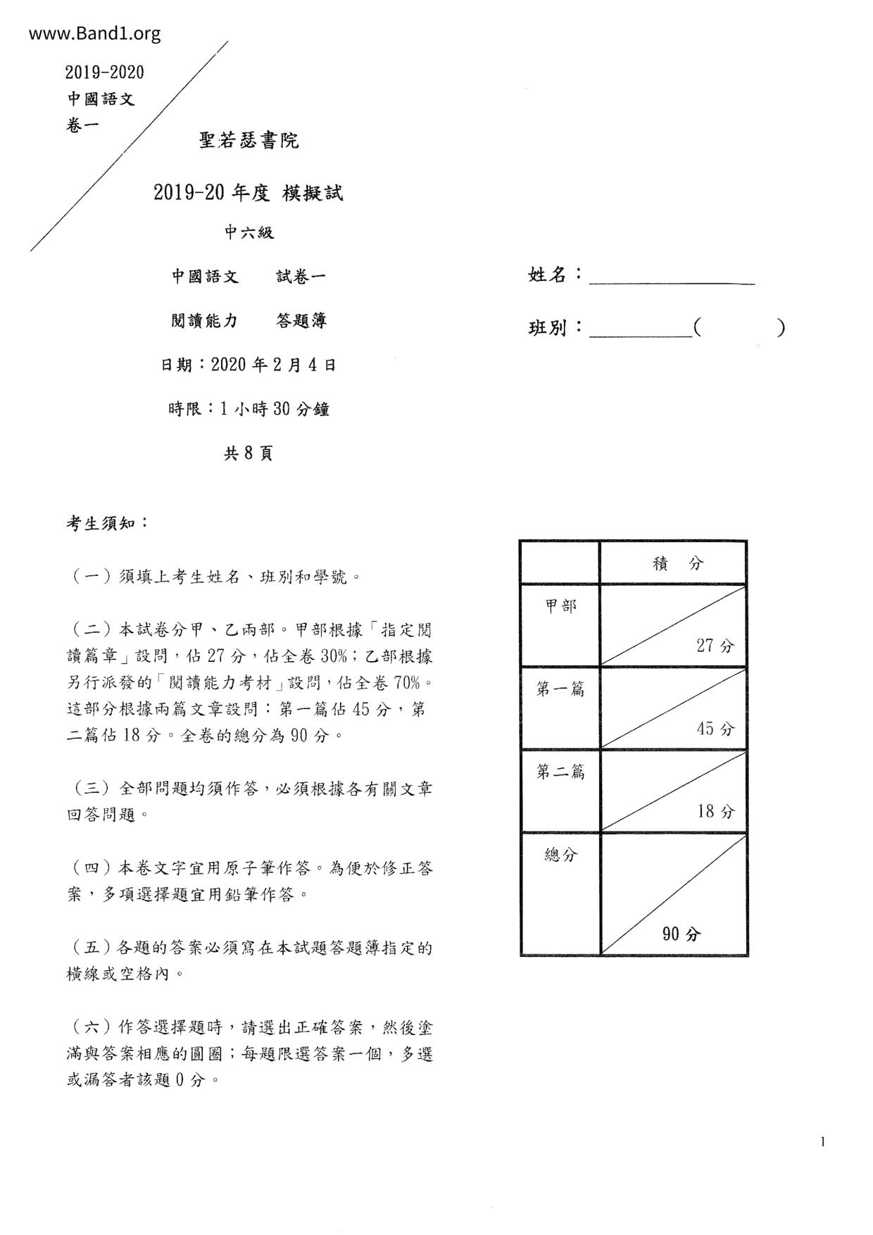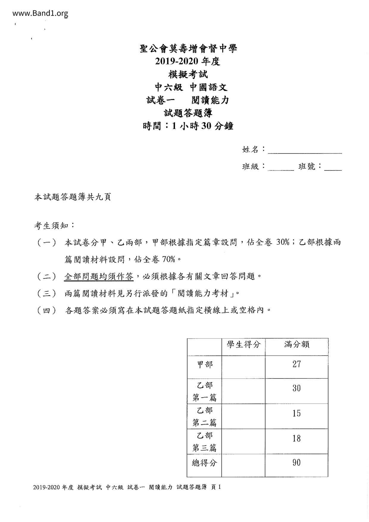 中六 中文 嗇色園主辦可譽中學暨可譽小學