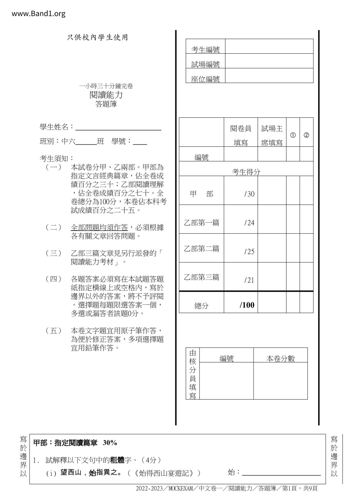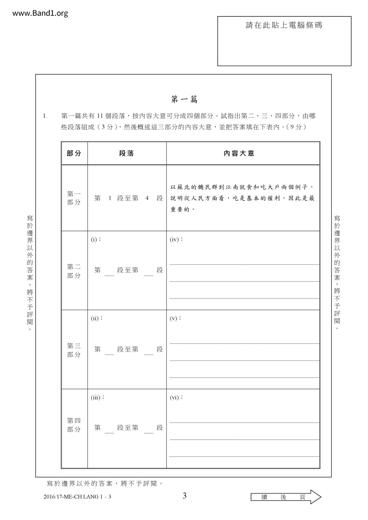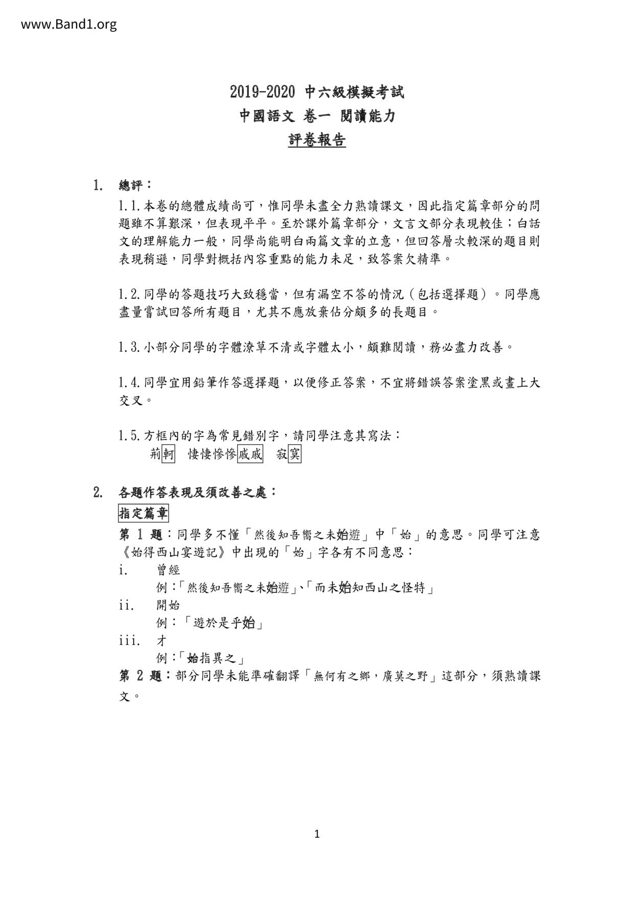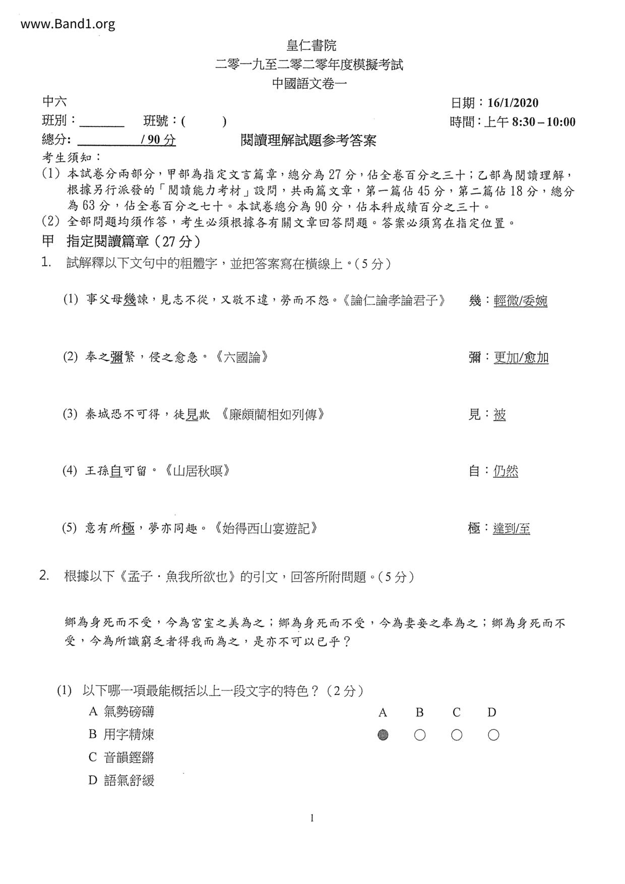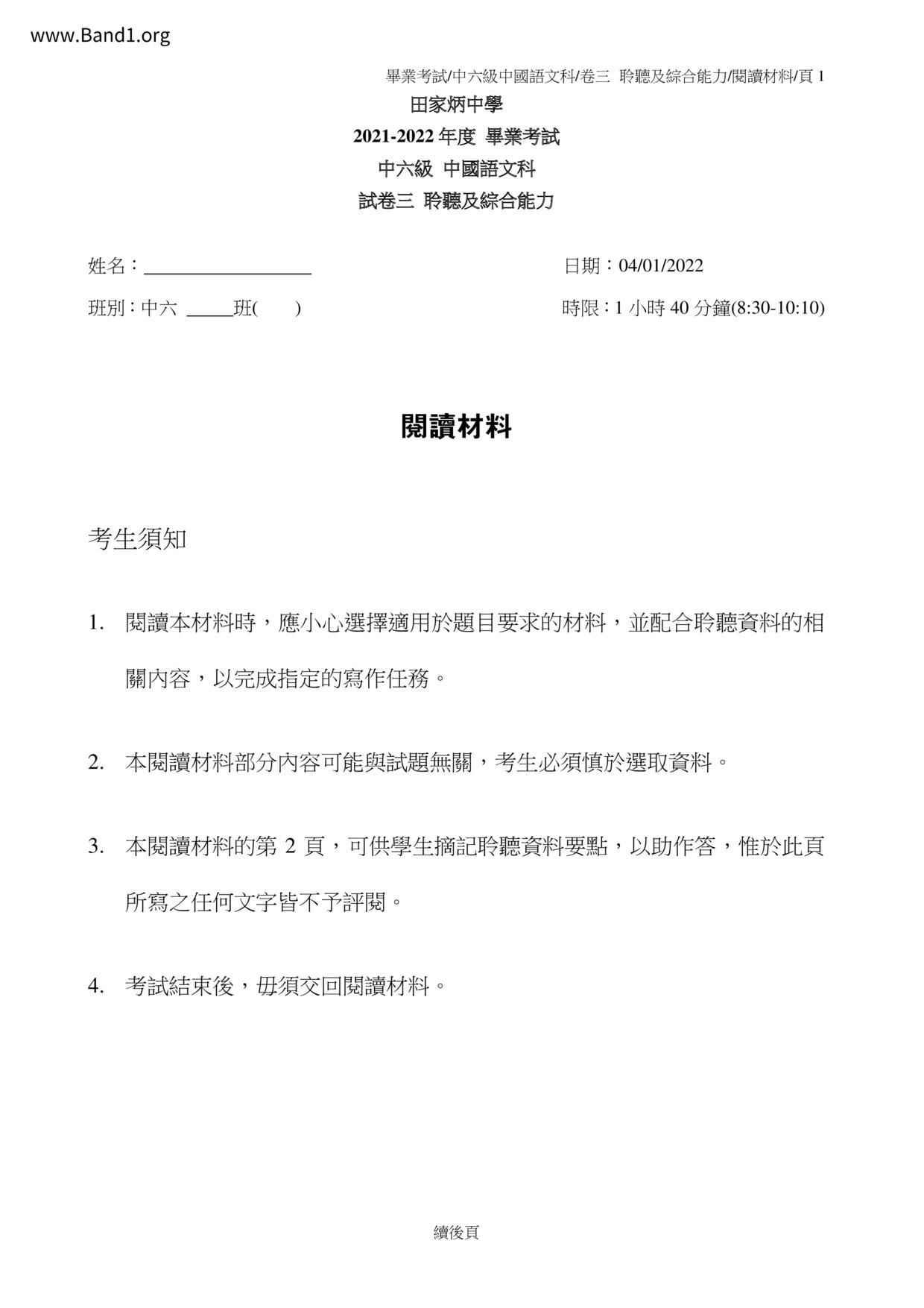 中六 中文 嗇色園主辦可譽中學暨可譽小學