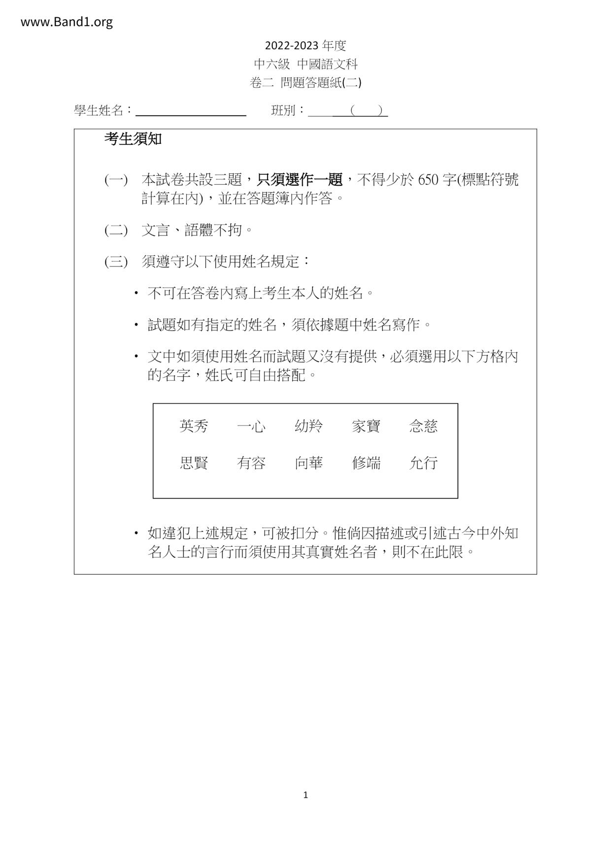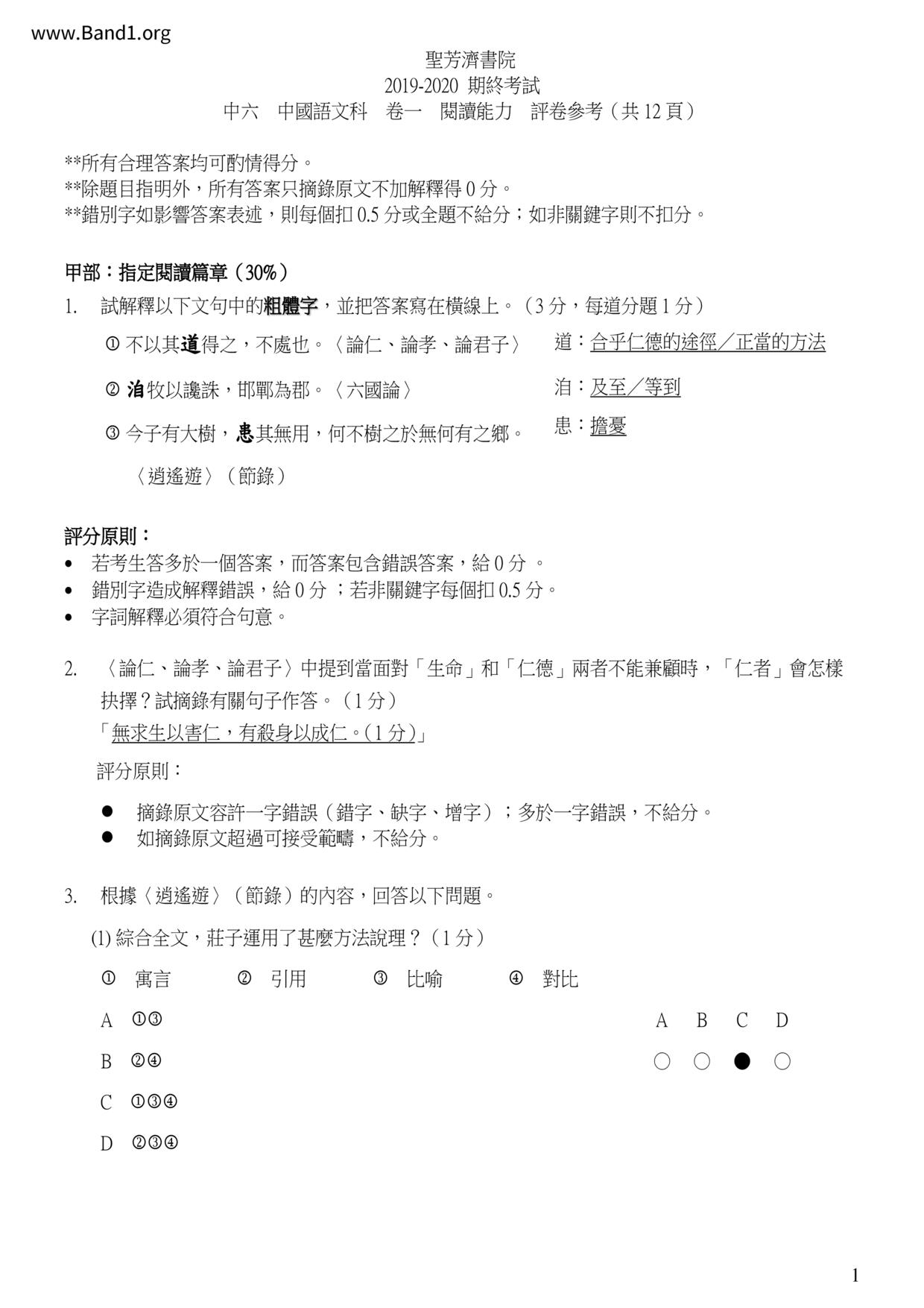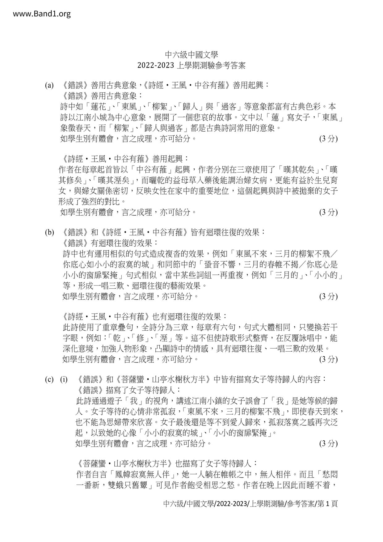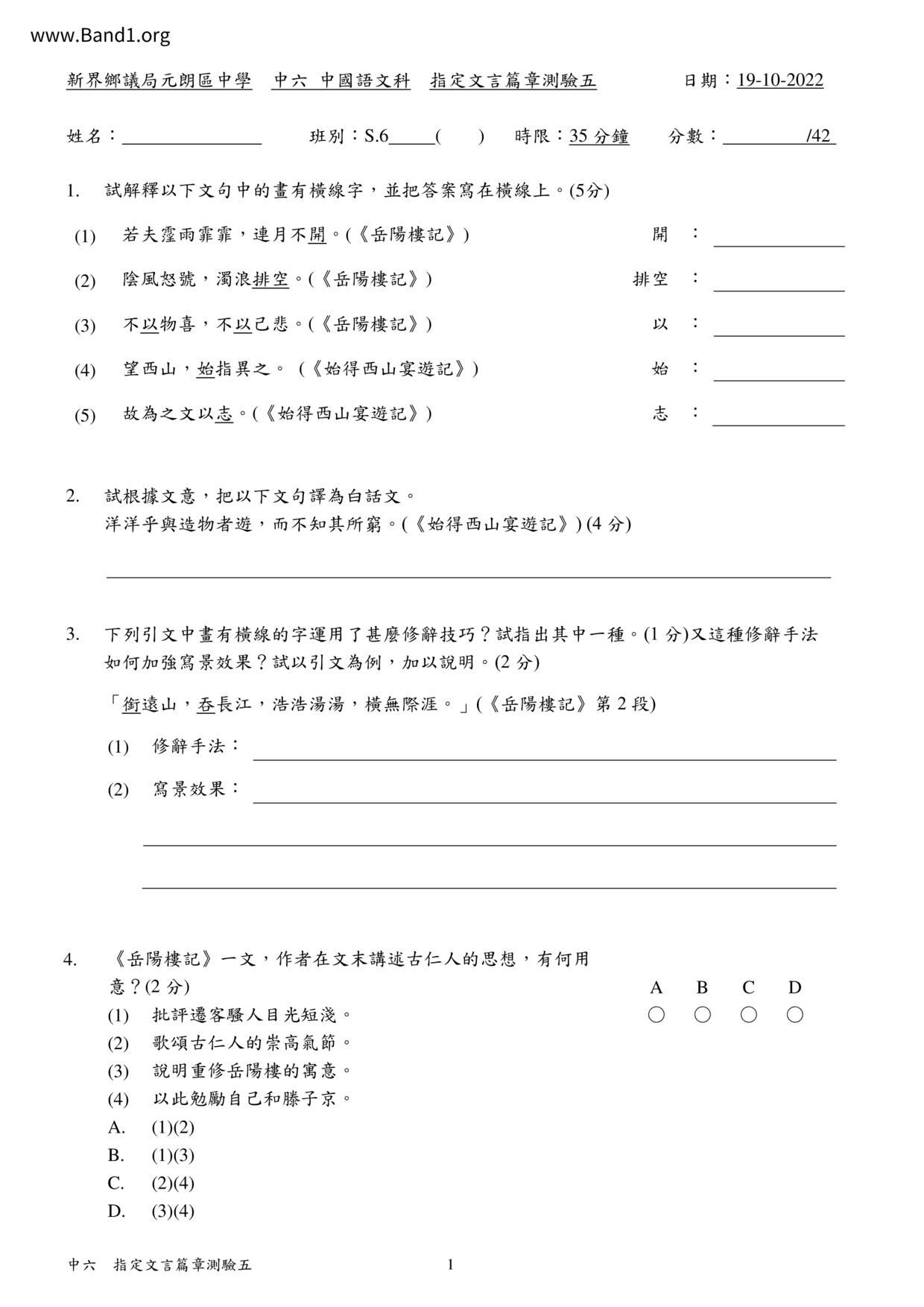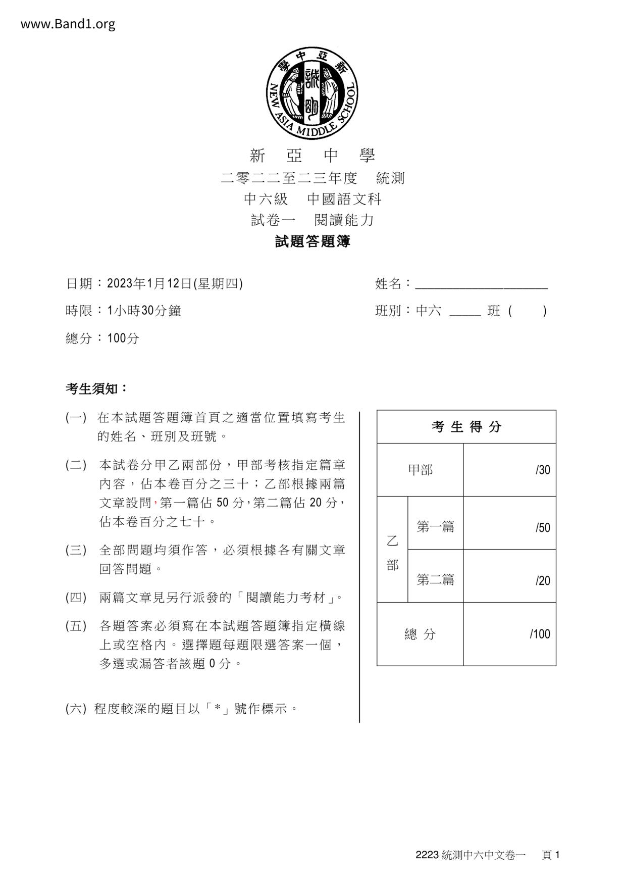 中六 中文 嗇色園主辦可譽中學暨可譽小學