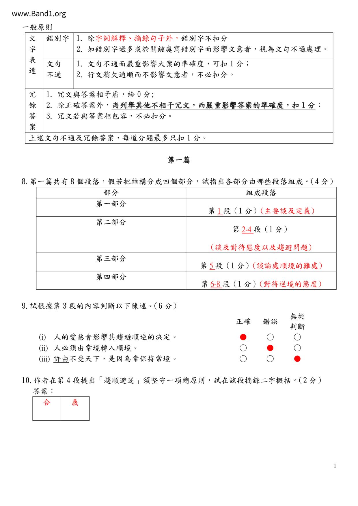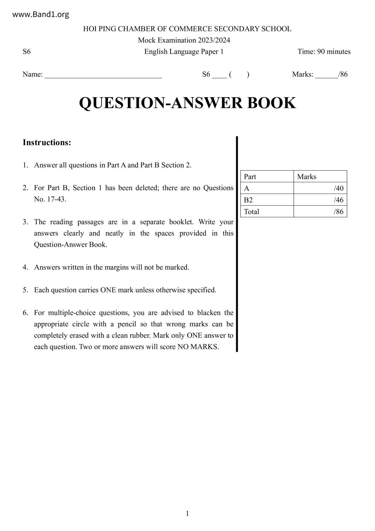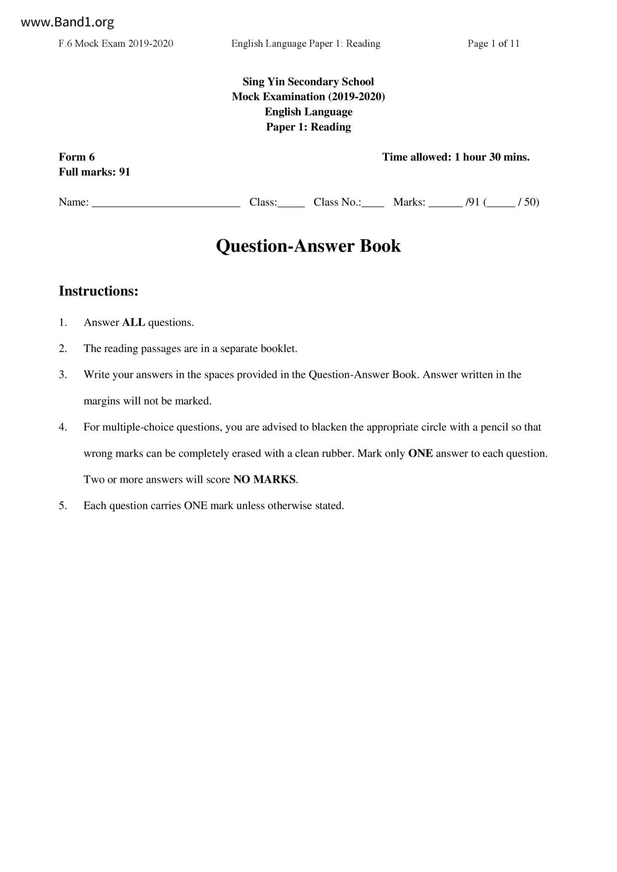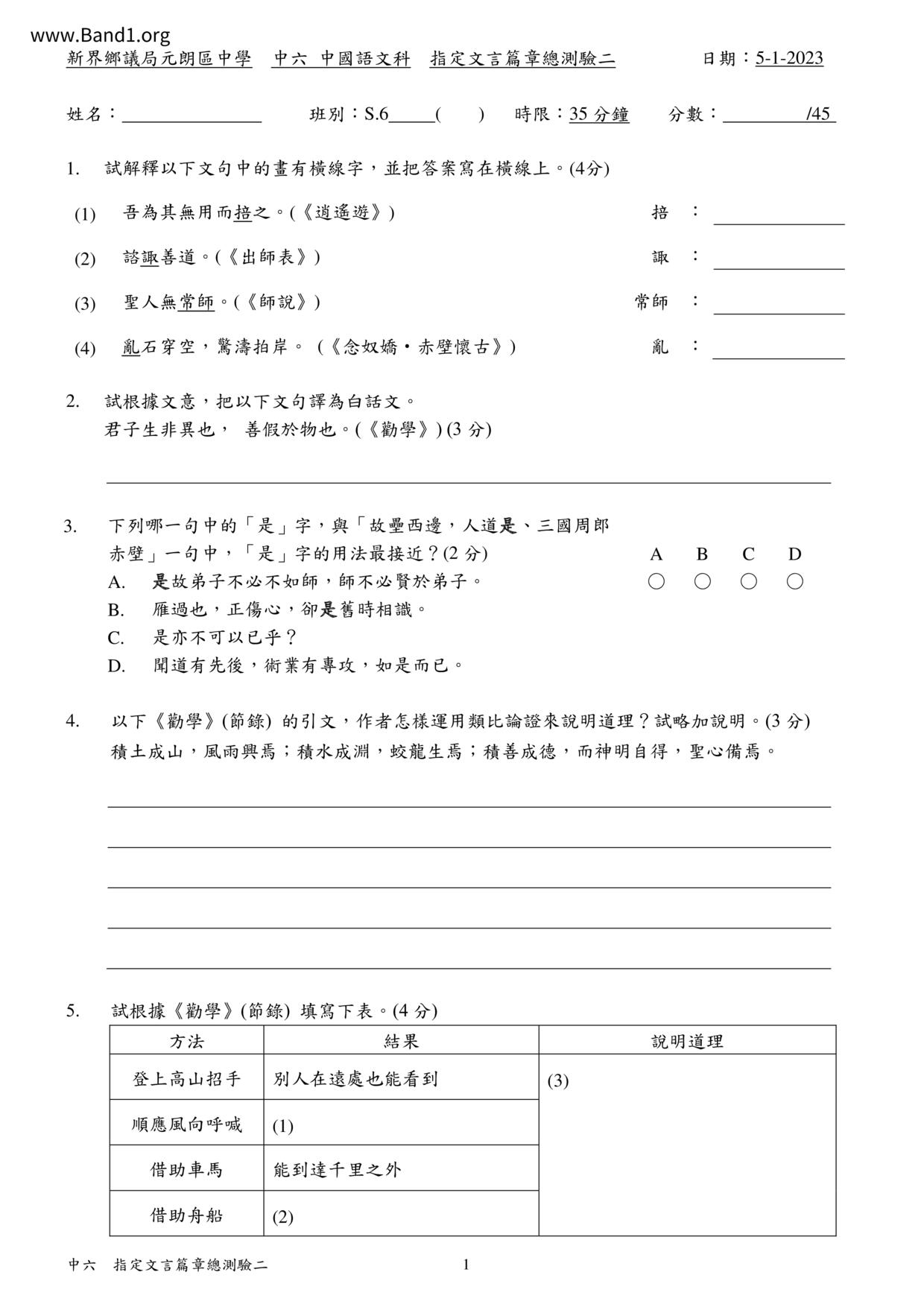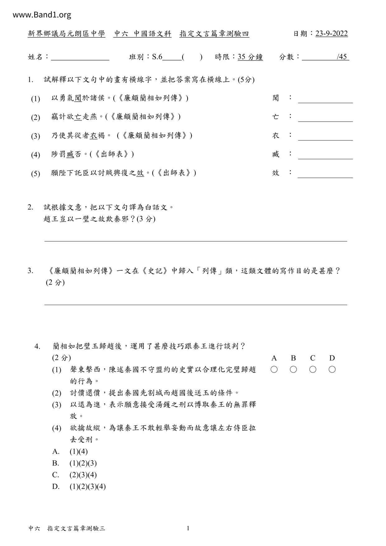 中六 中文 嗇色園主辦可譽中學暨可譽小學