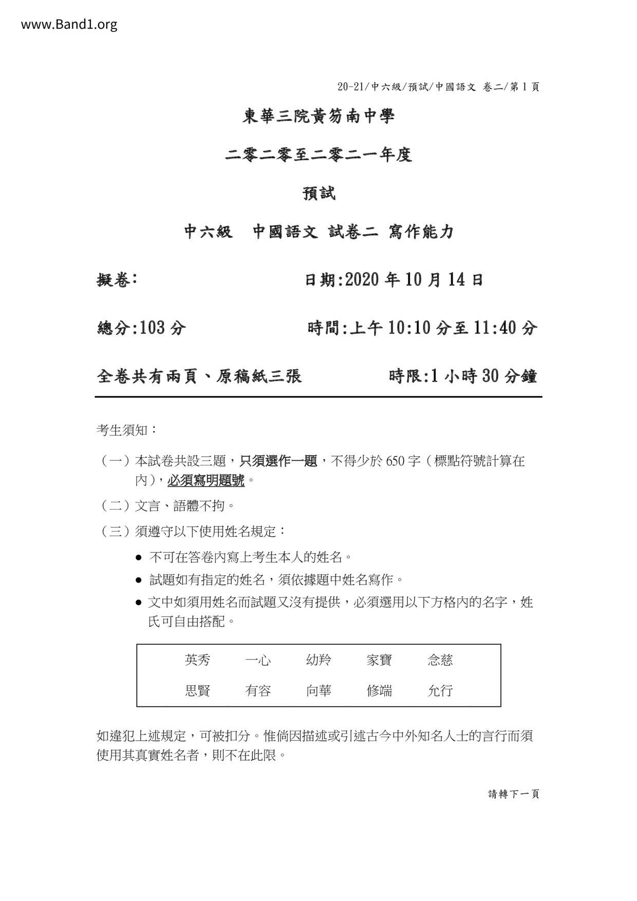 中六 英文 保良局甲子何玉清中學