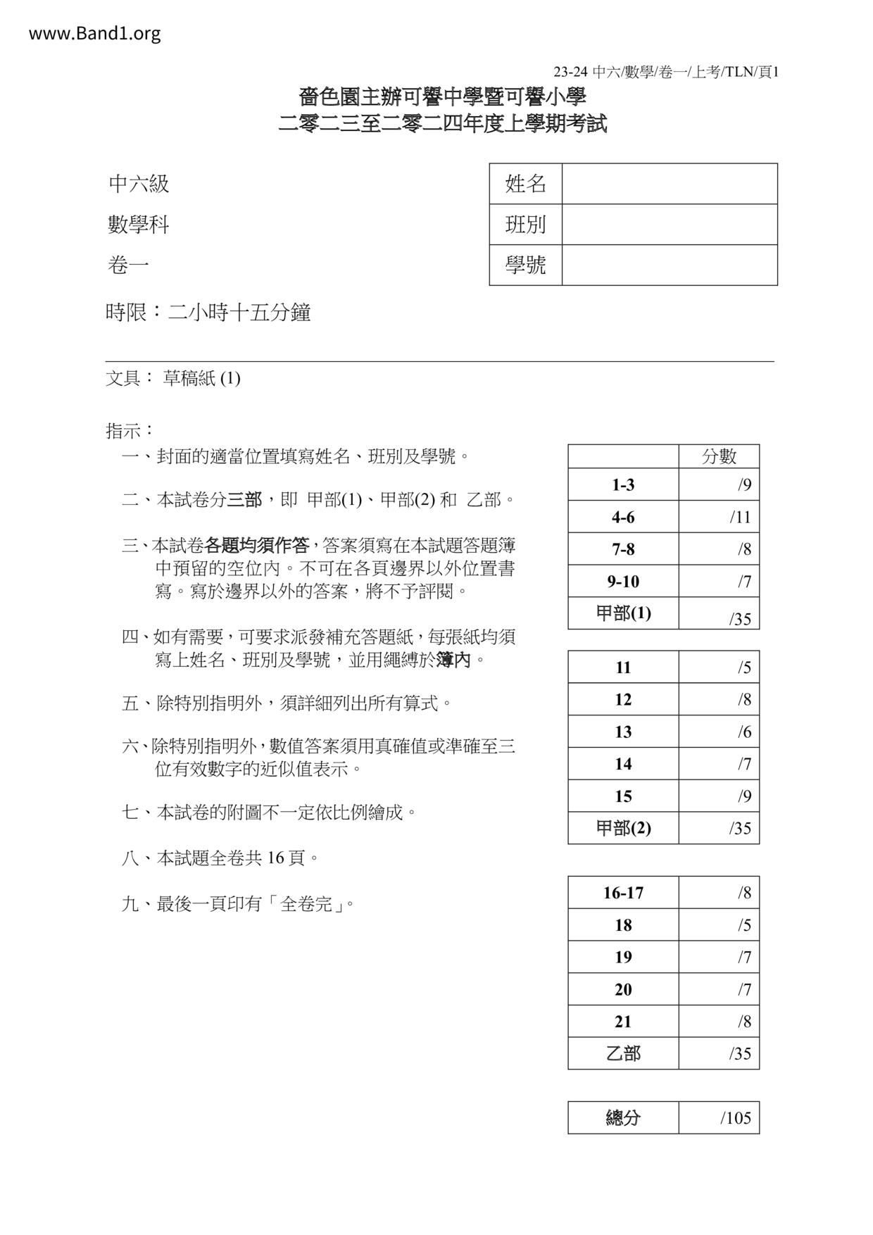中六 數學 可風中學(嗇色園主辦)