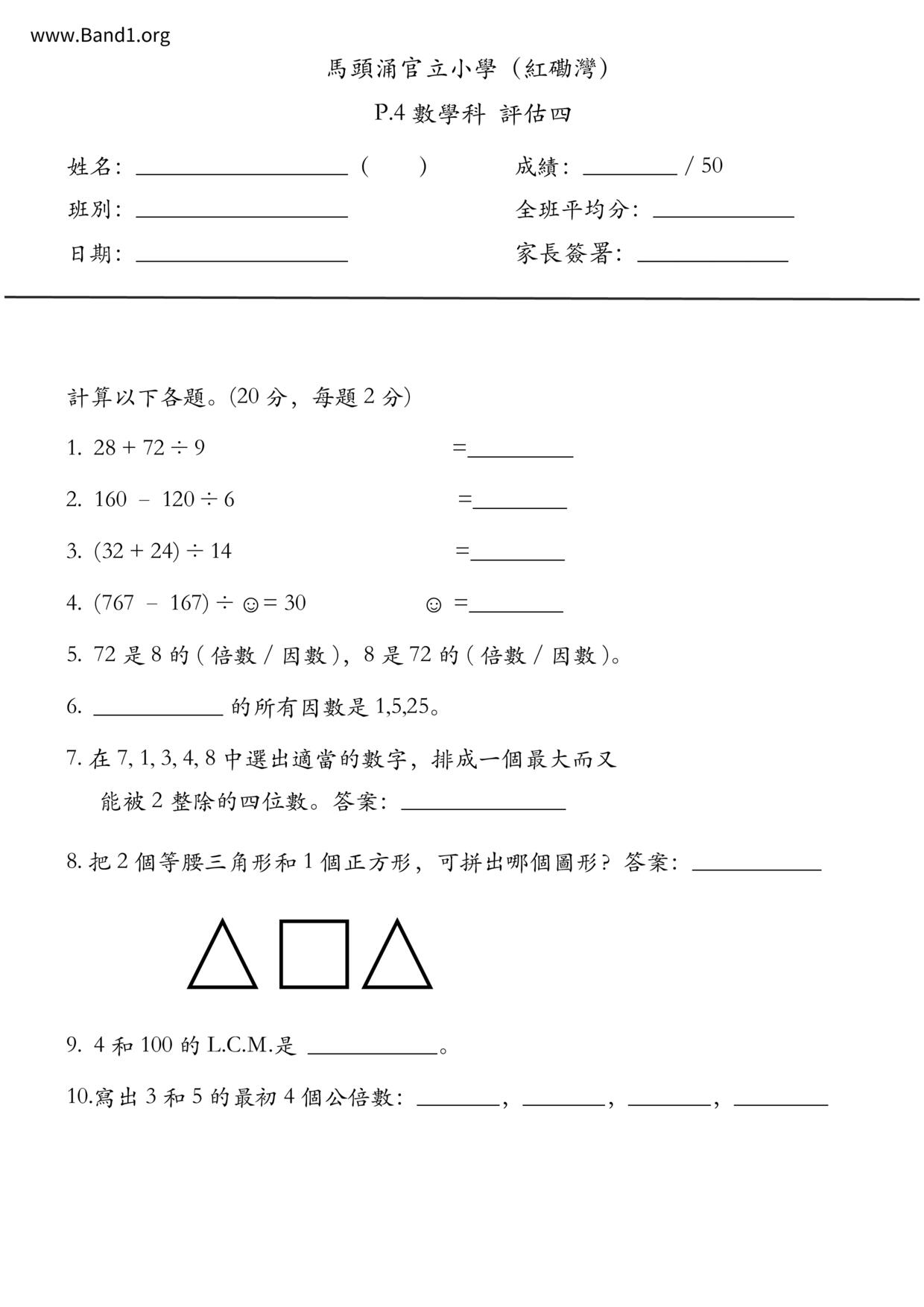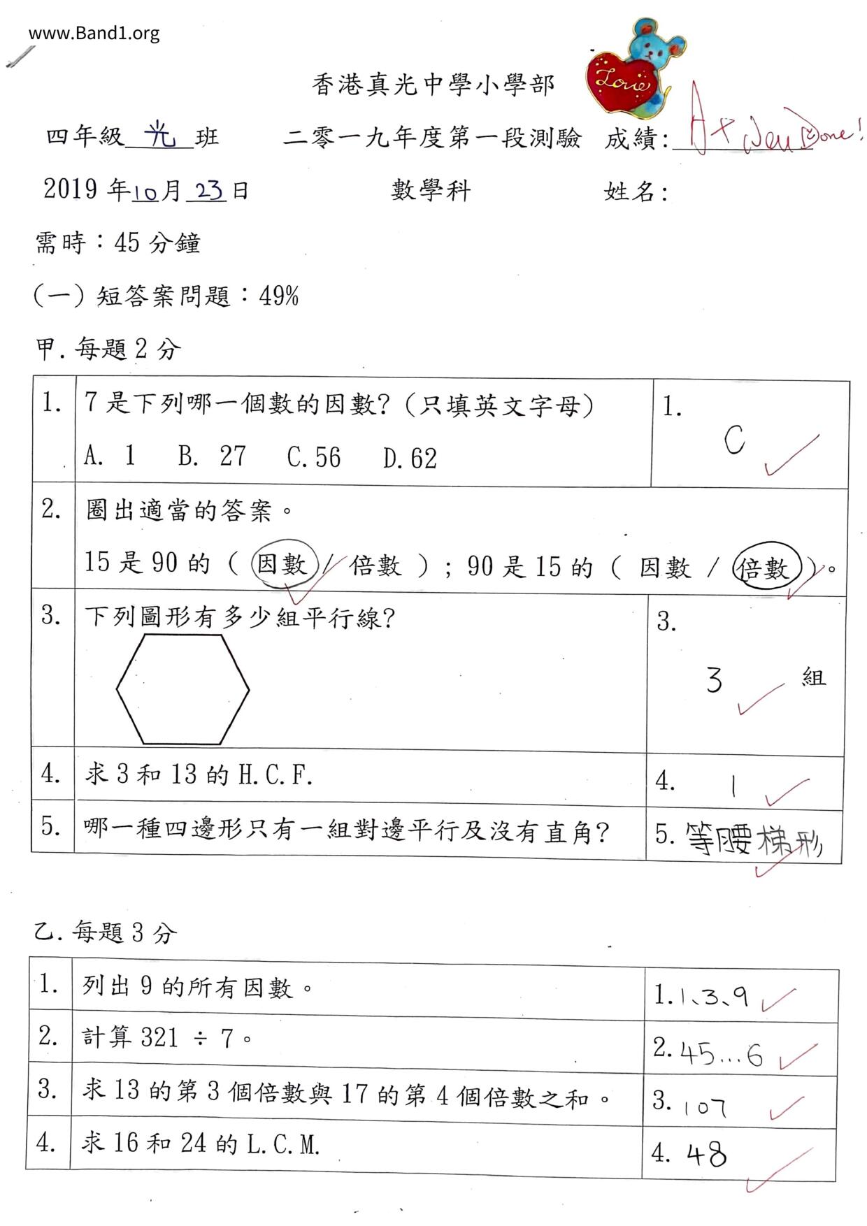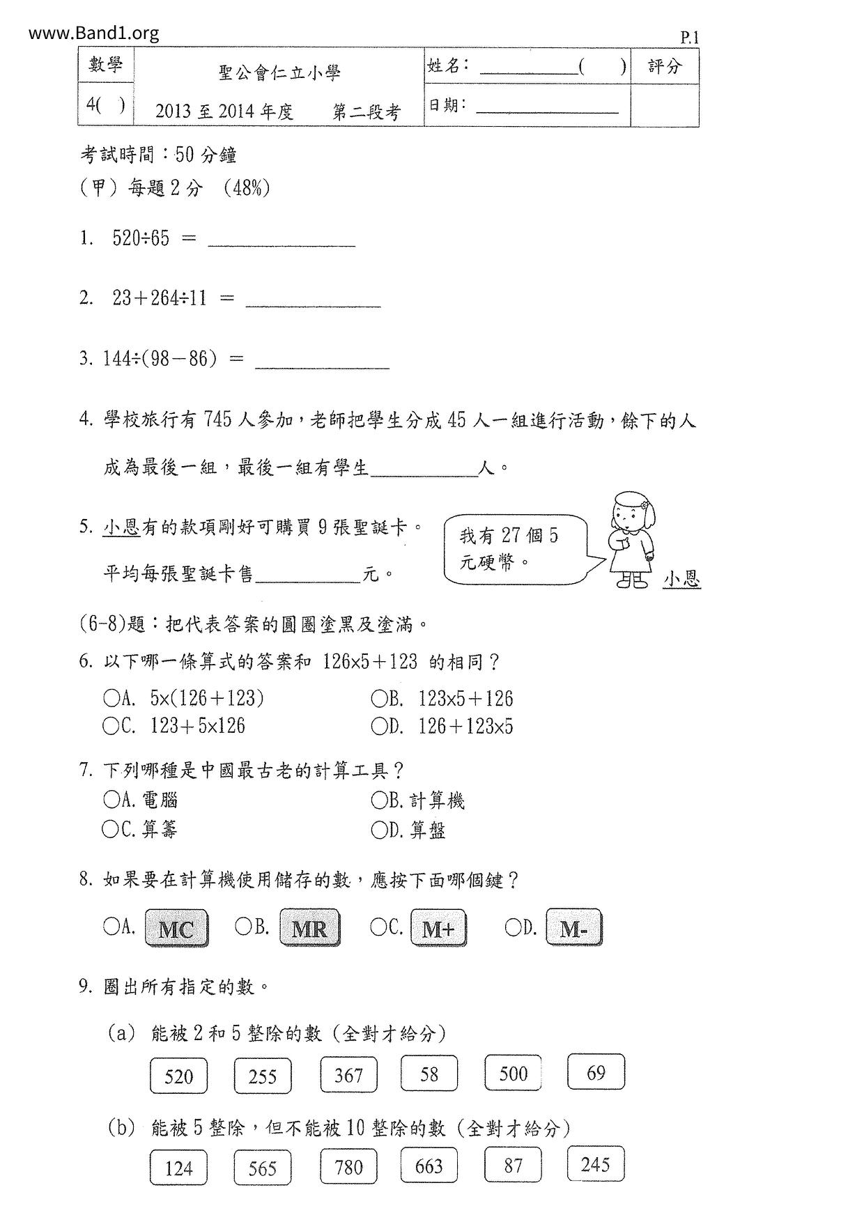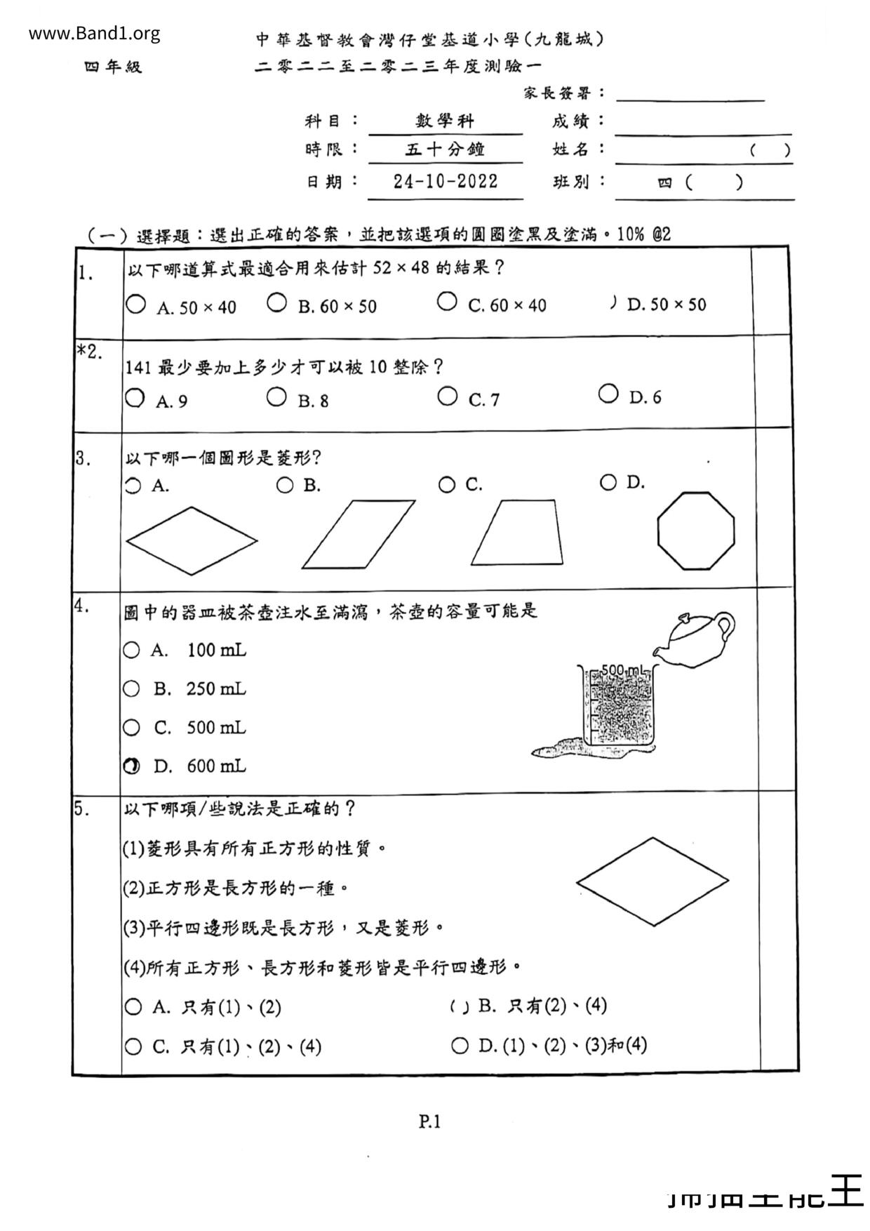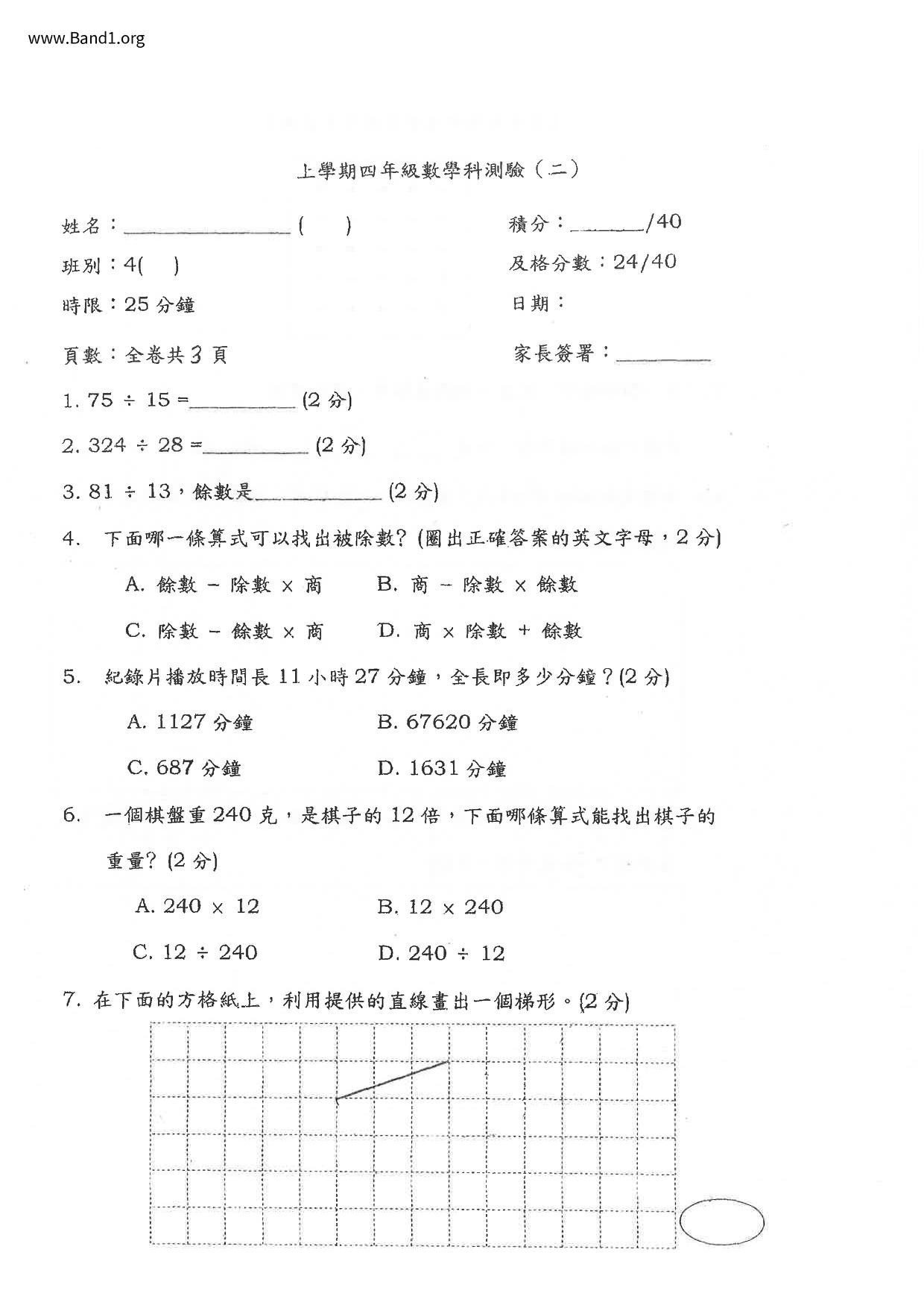小四 數學 中華基督教會灣仔堂基道小學(九龍城)