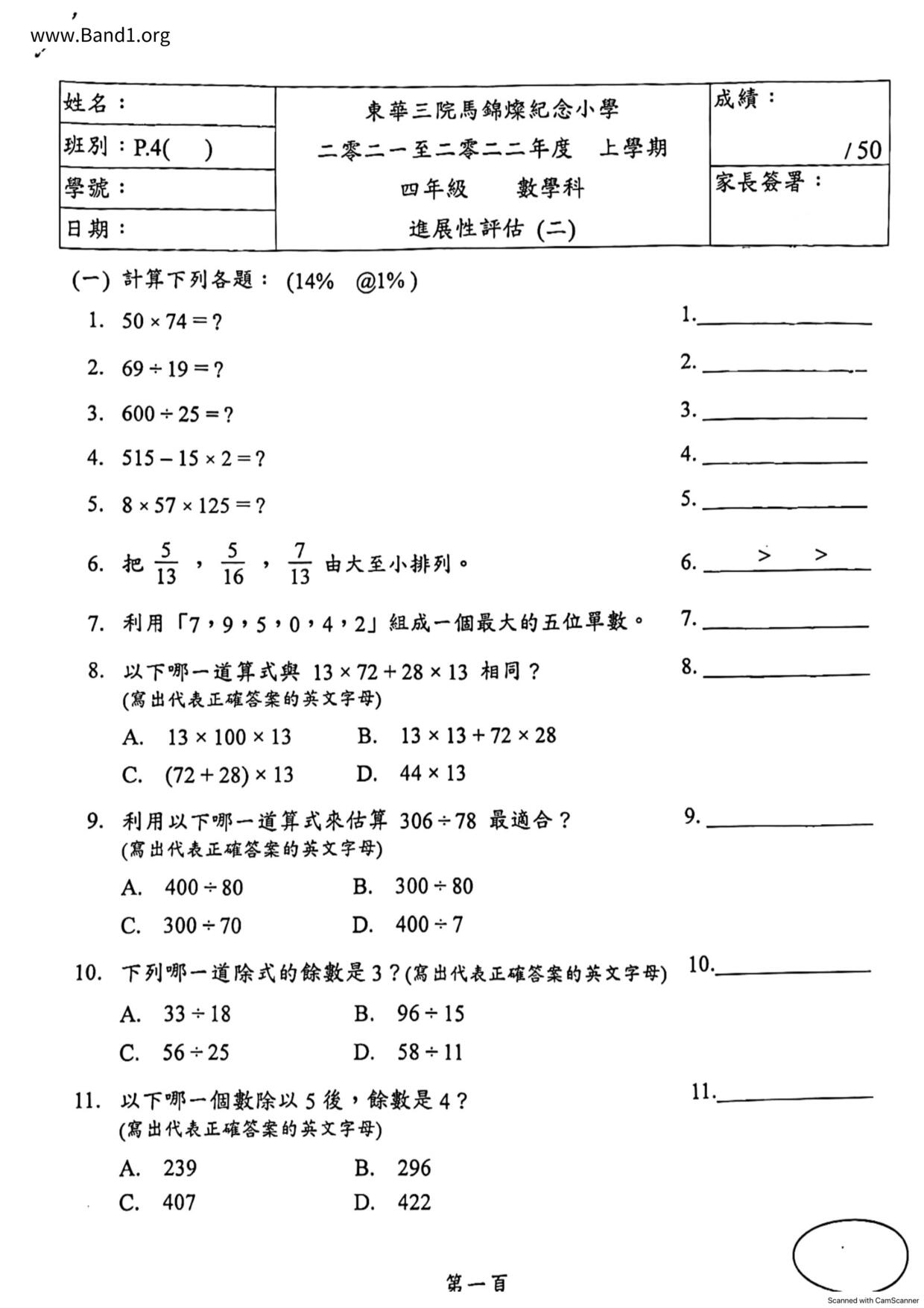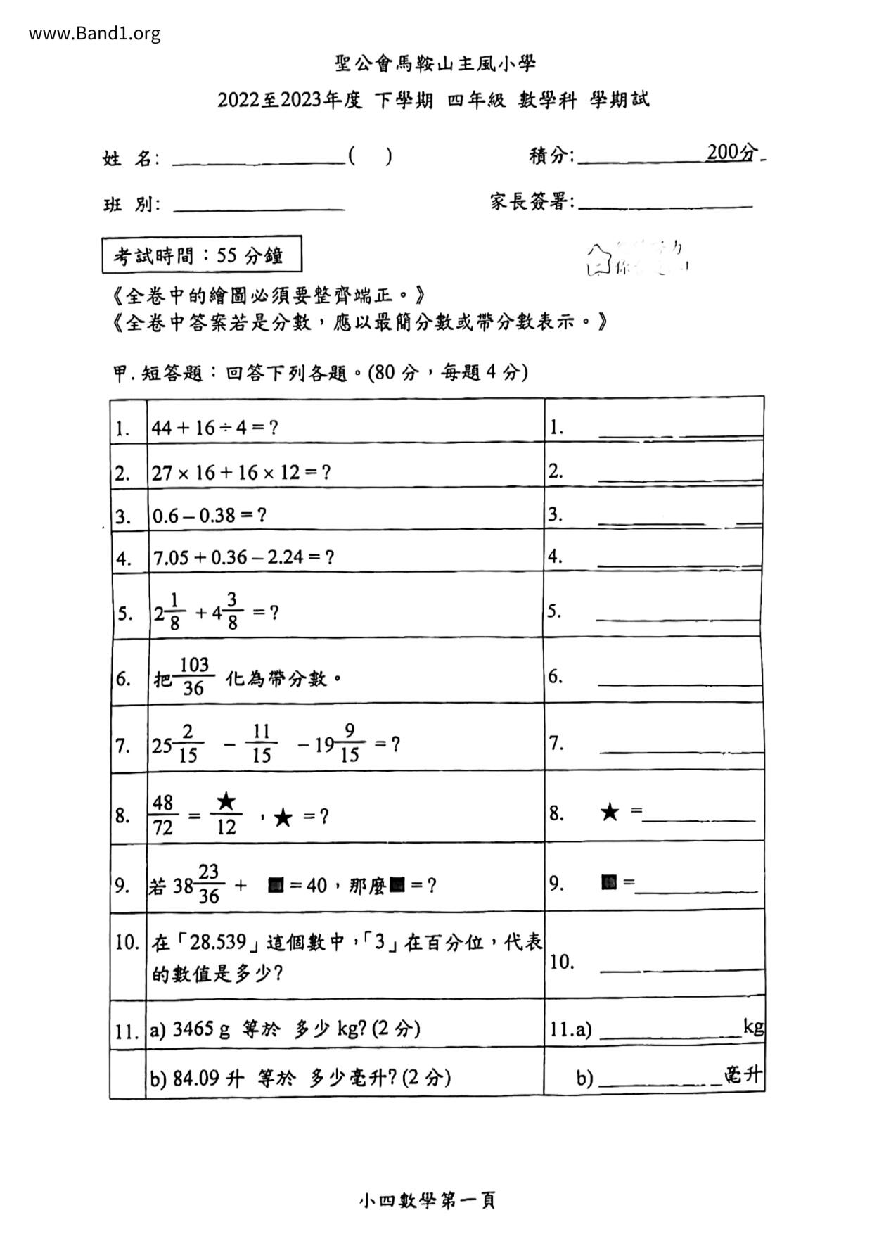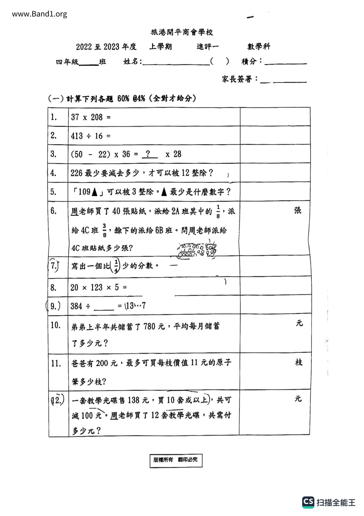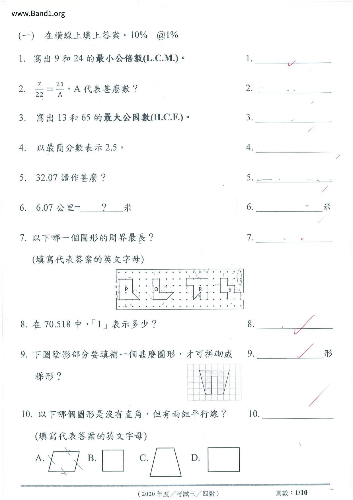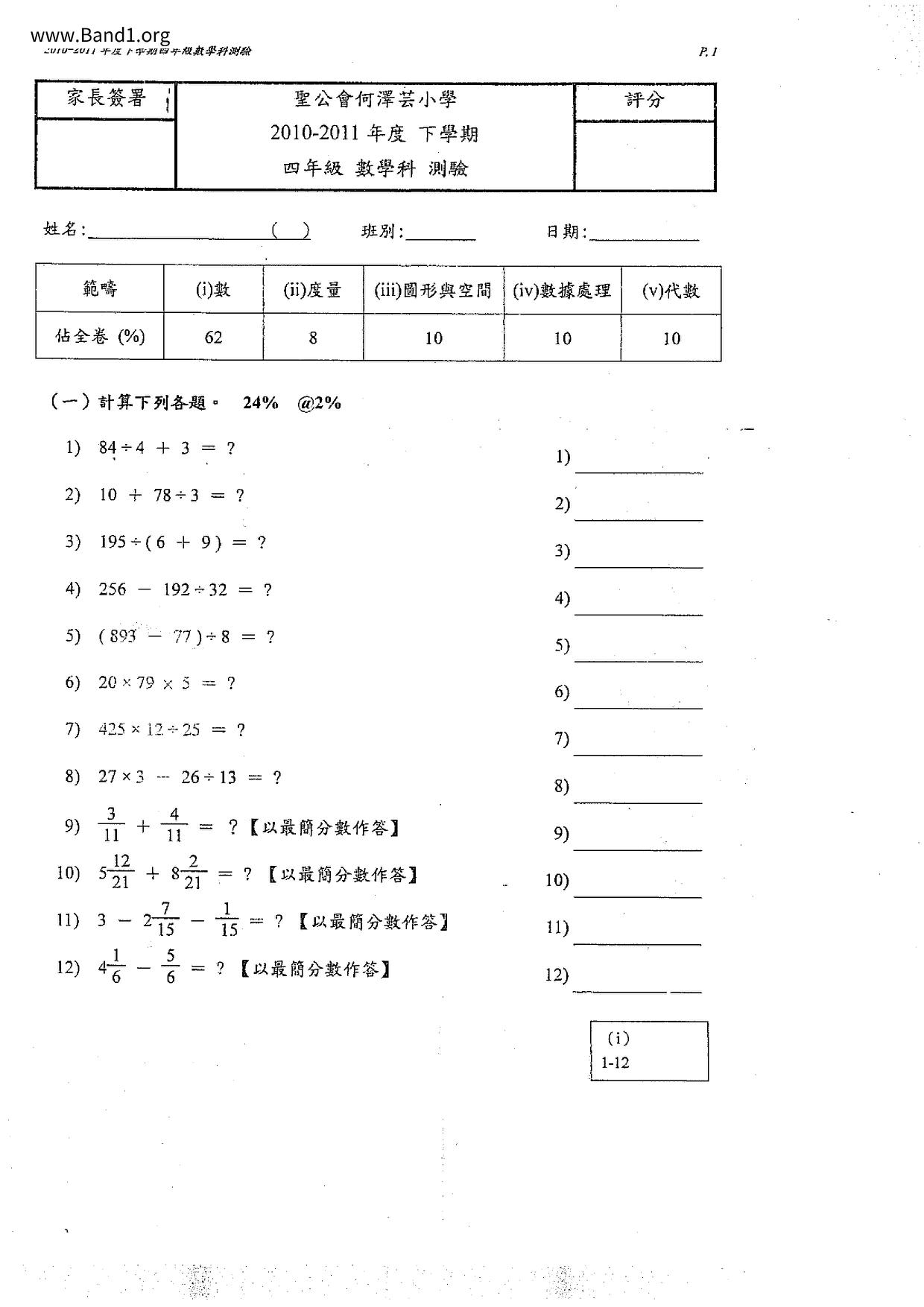 小四 數學 中華基督教會灣仔堂基道小學(九龍城)