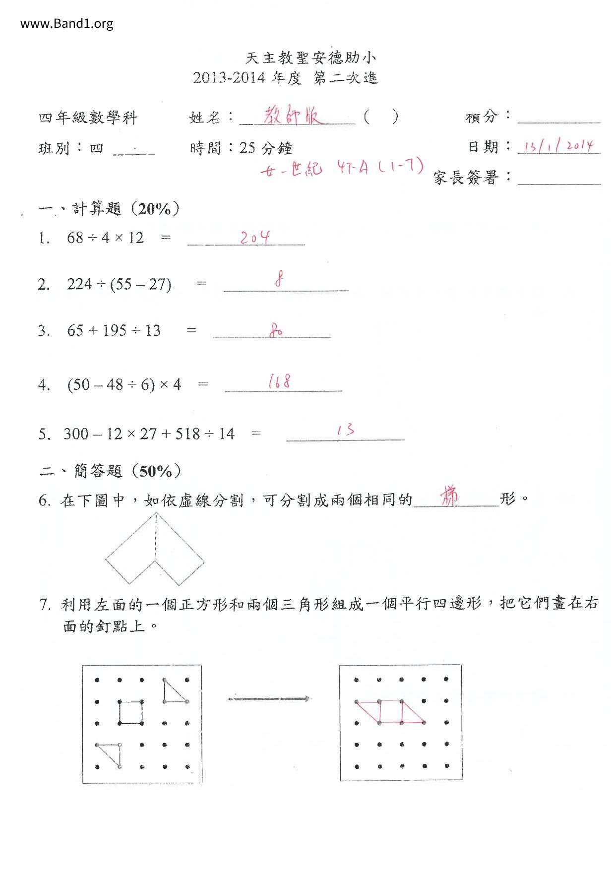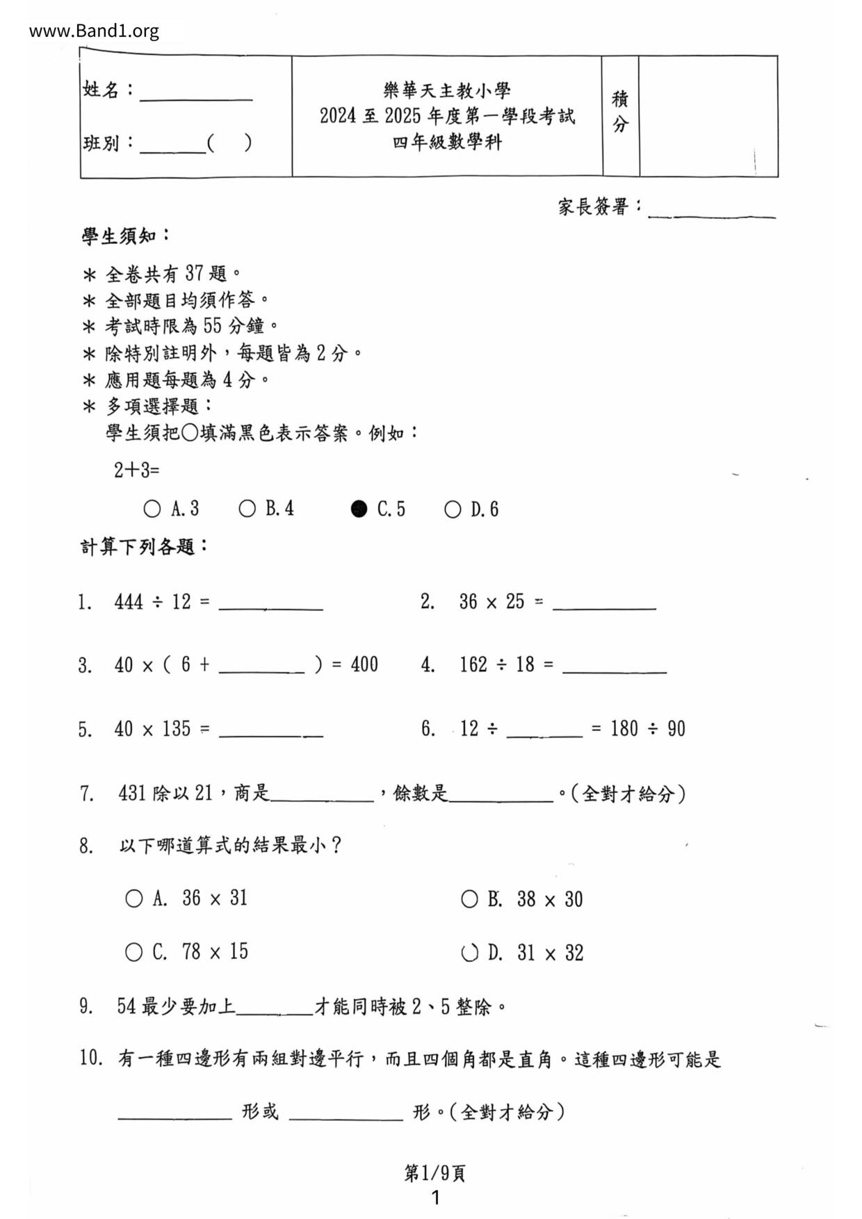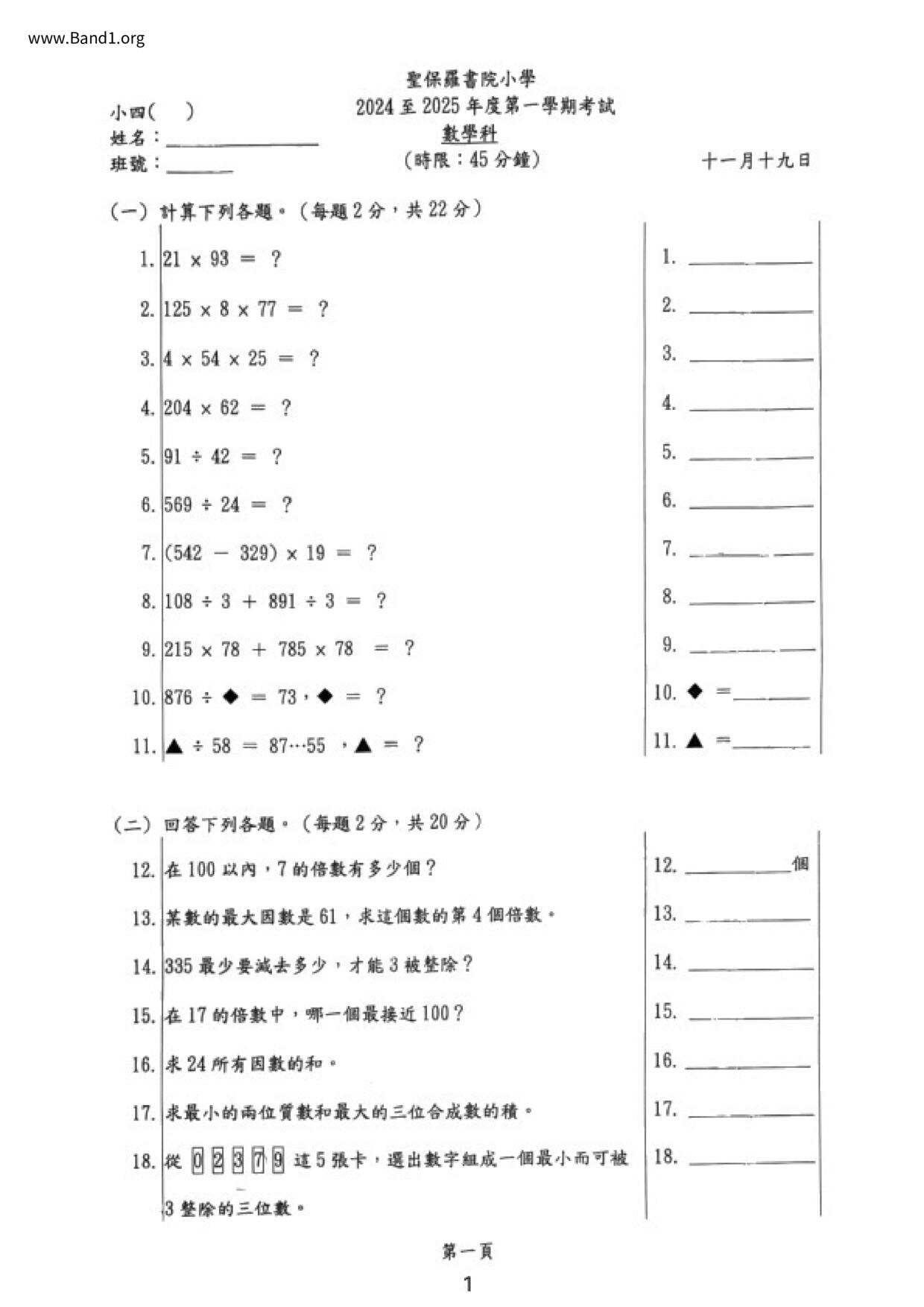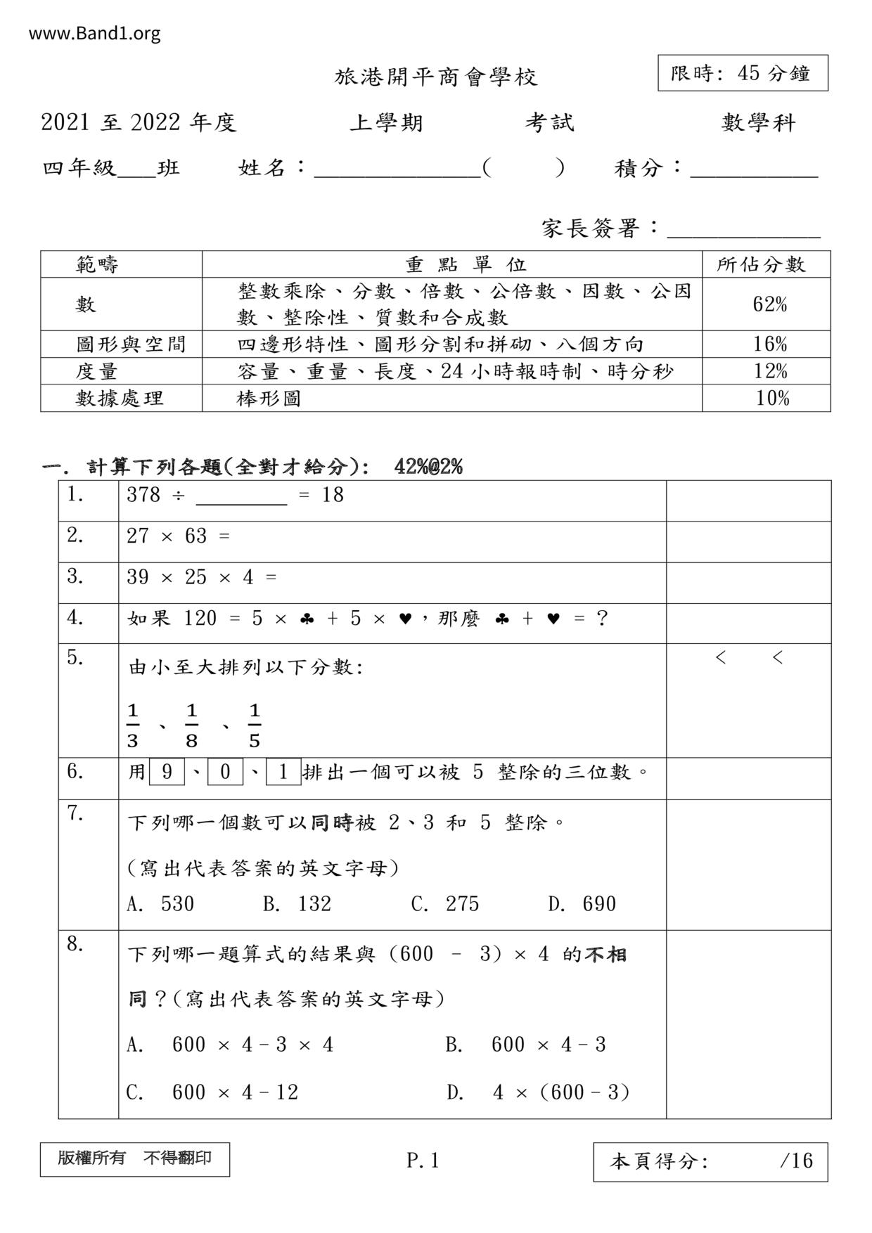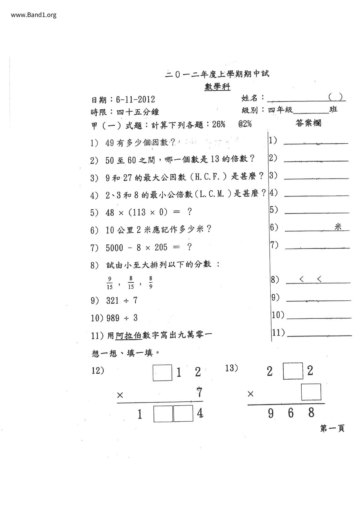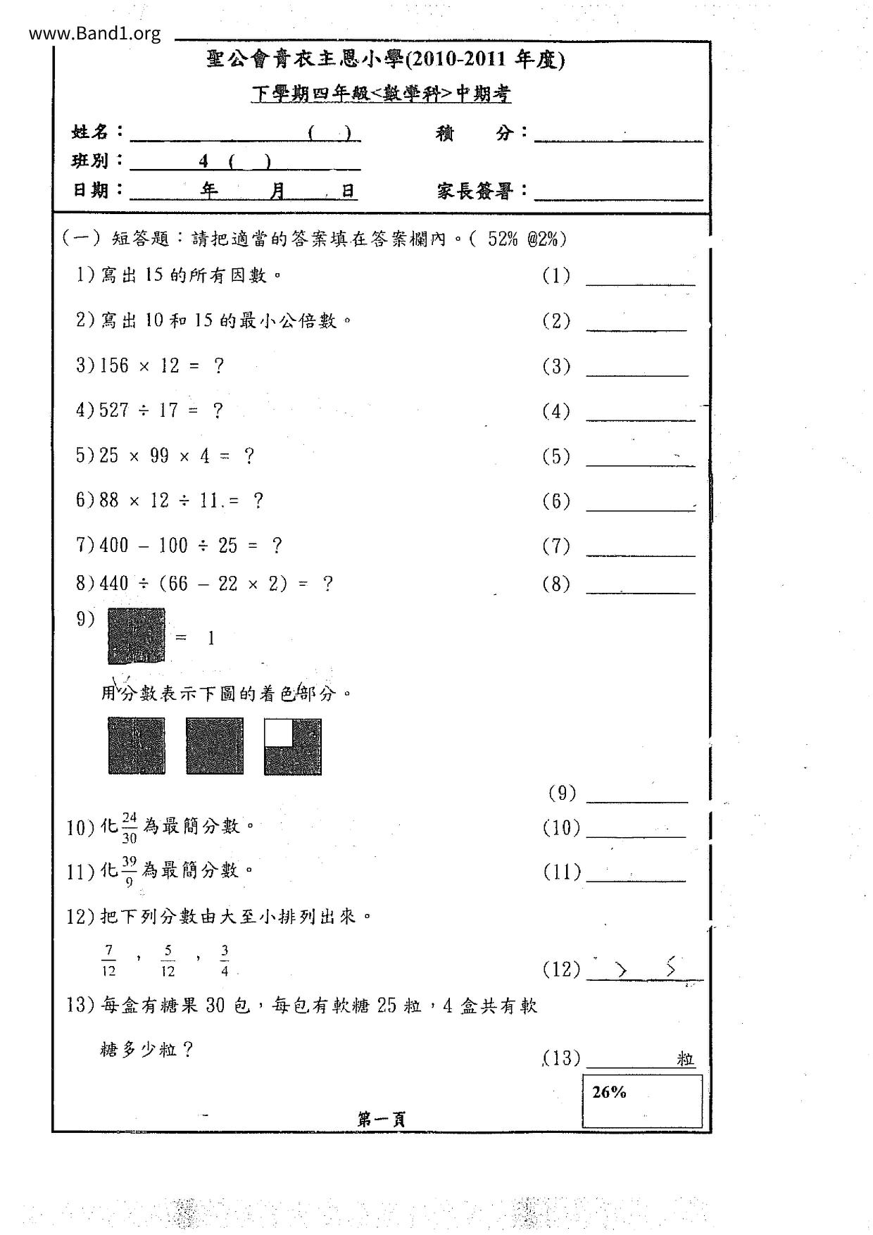 小四 數學 中華基督教會灣仔堂基道小學(九龍城)