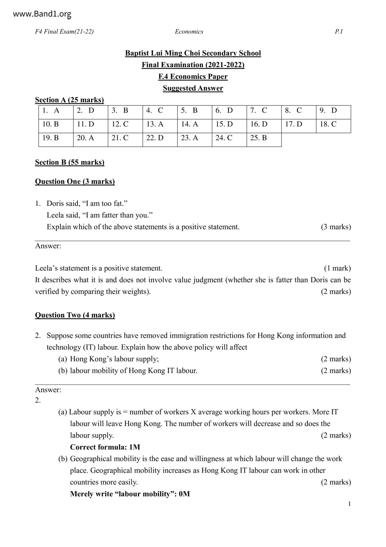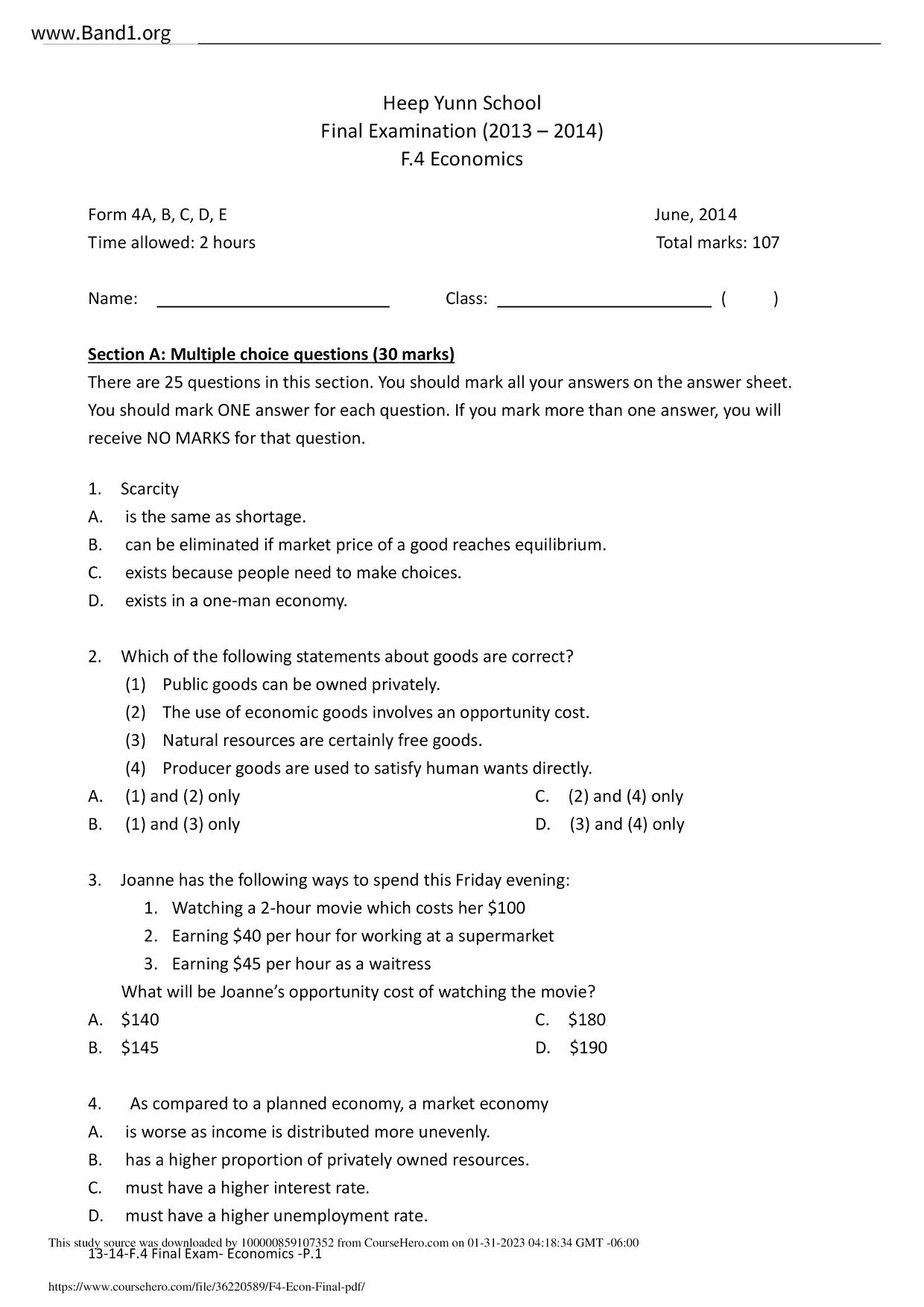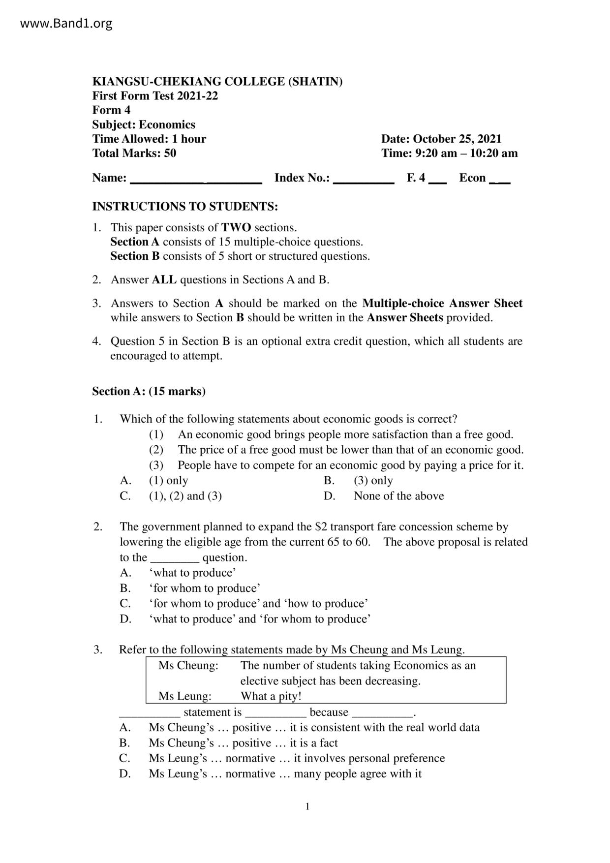 中六 經濟 華仁書院(九龍)