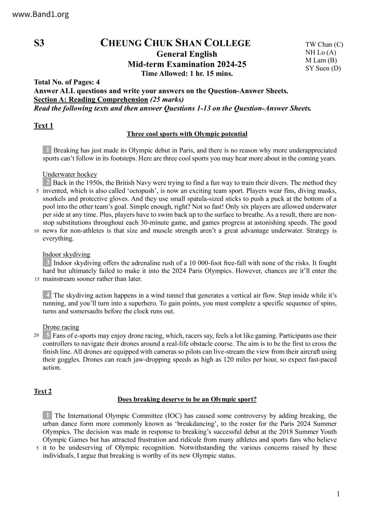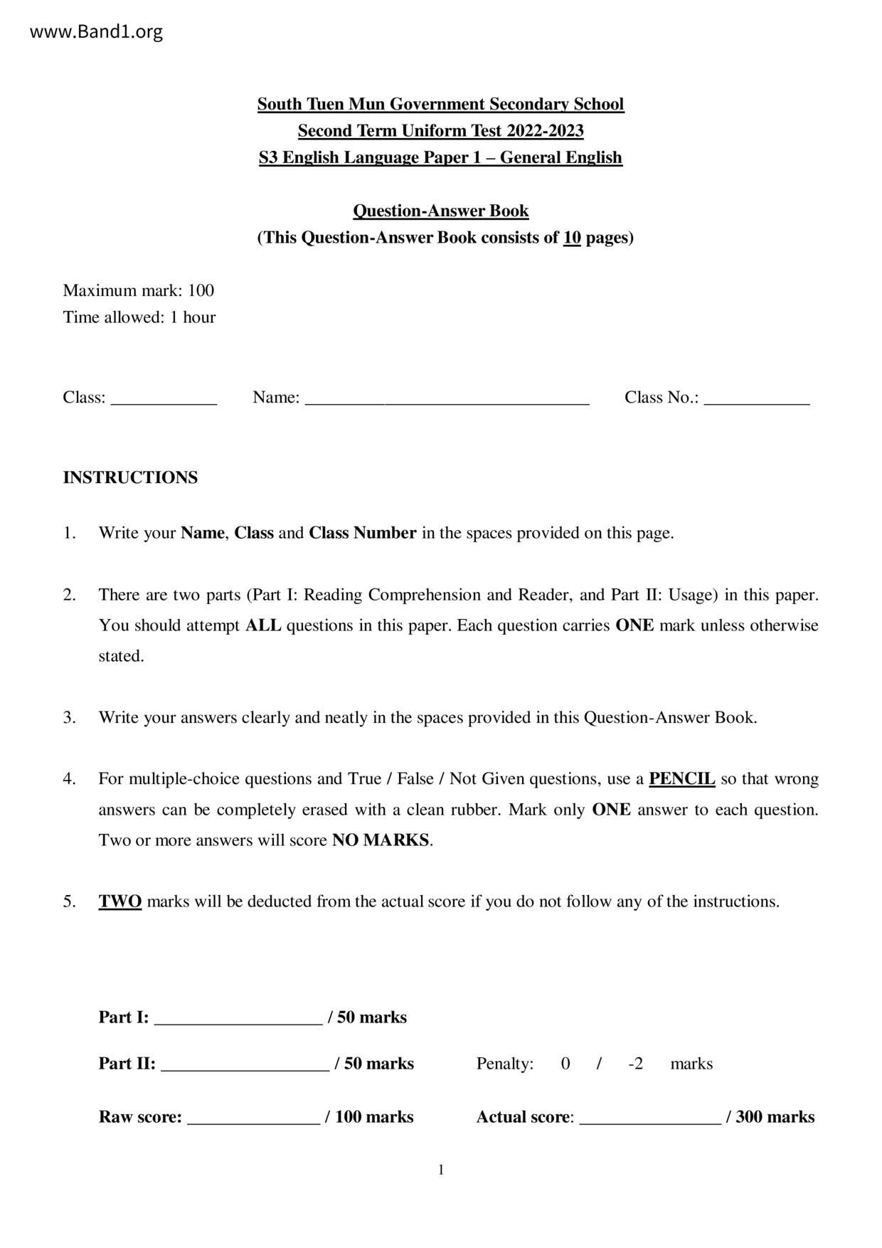中三 英文 南屯門官立中學