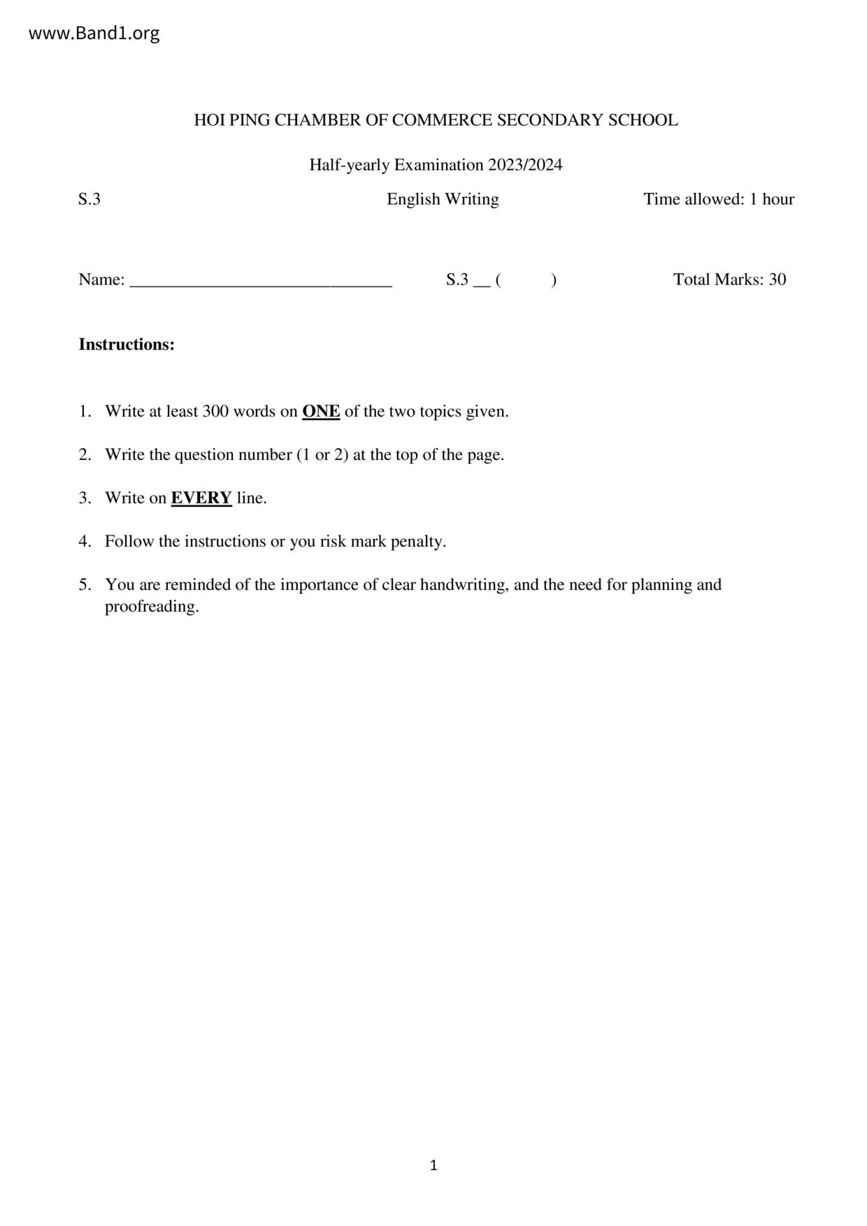 中三 英文 英皇書院