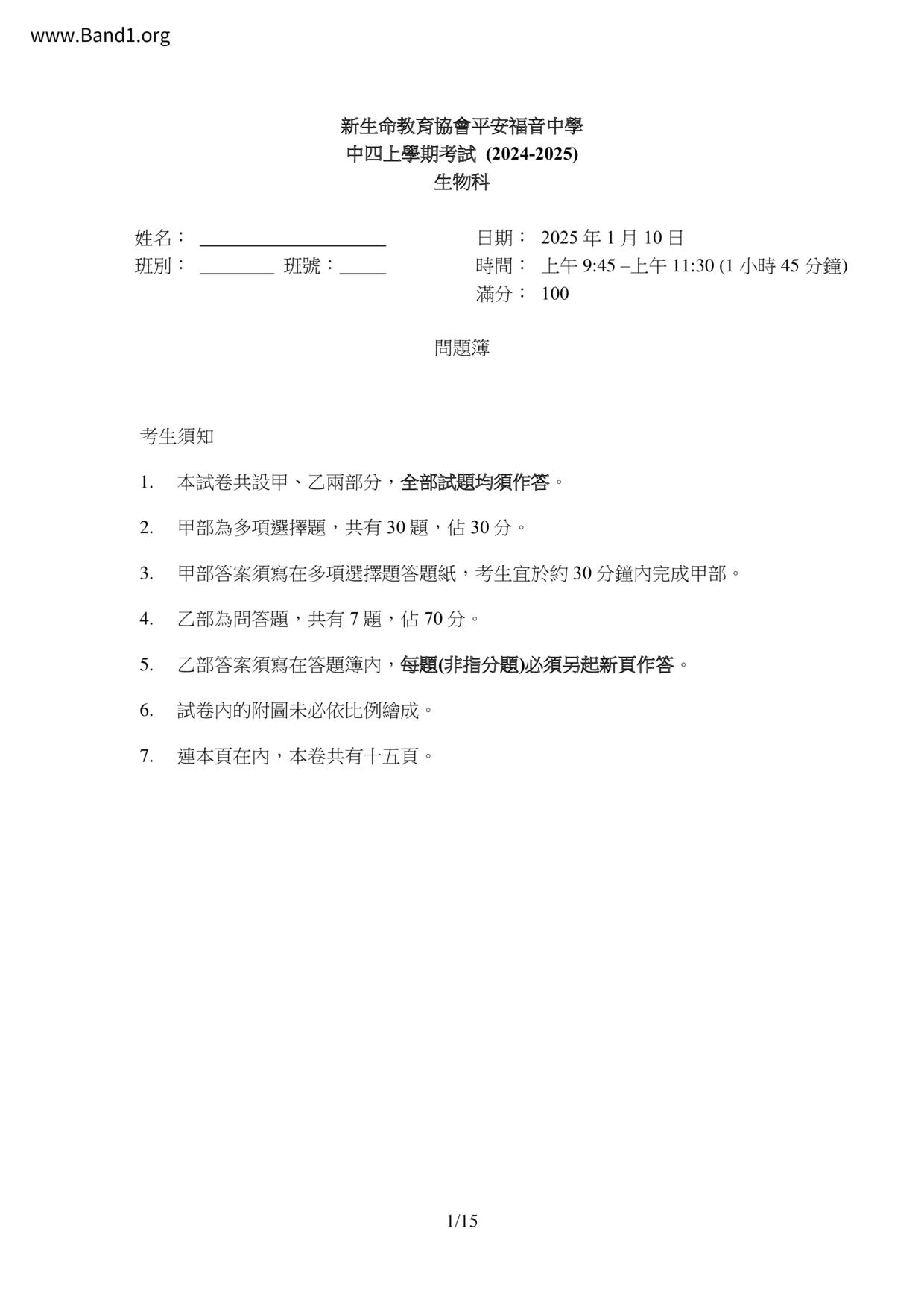 中四 生物 新生命教育協會平安福音中學