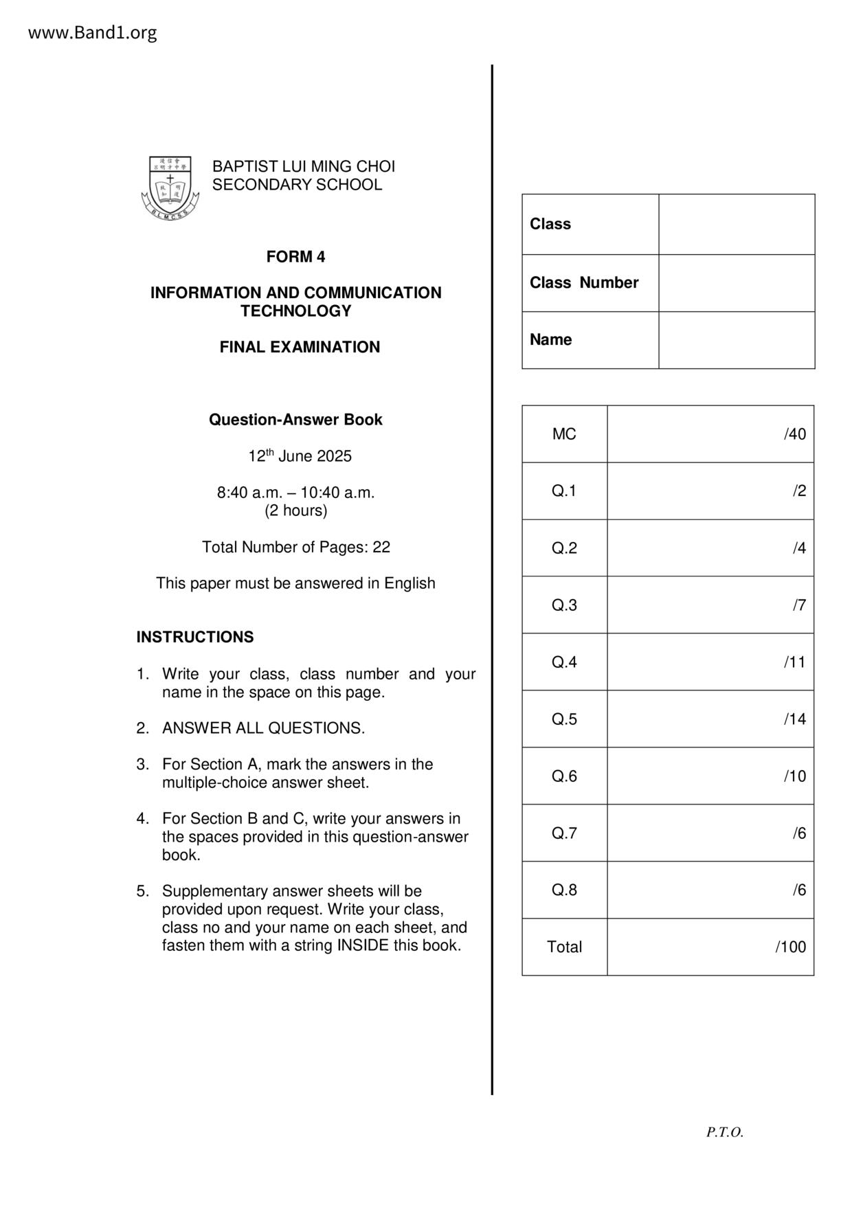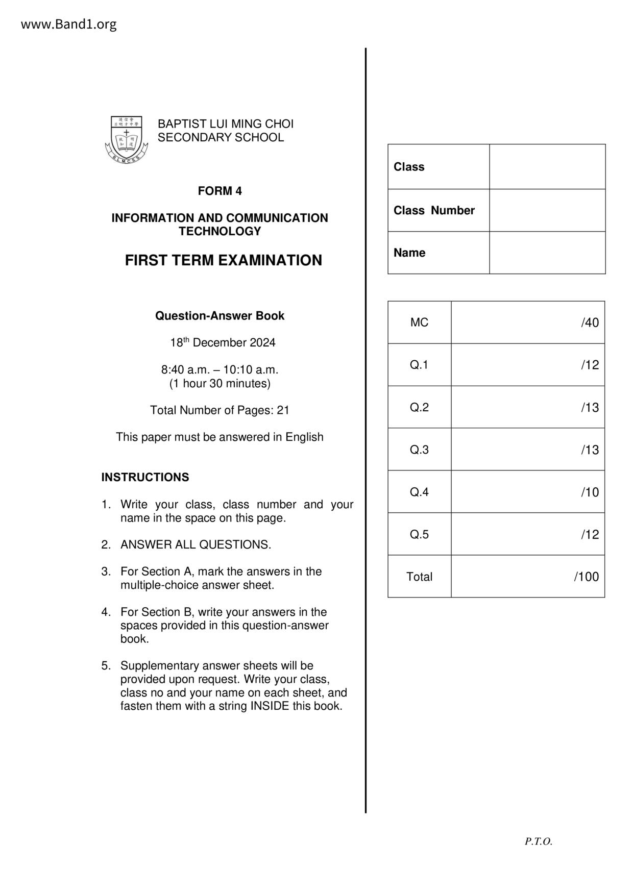 香港 中四 各科 (HK F4) 試卷 pdf