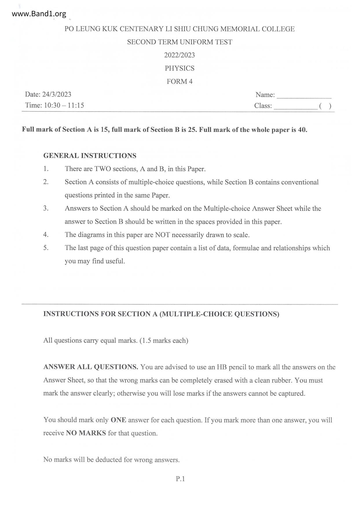 中四 物理 港大同學會書院