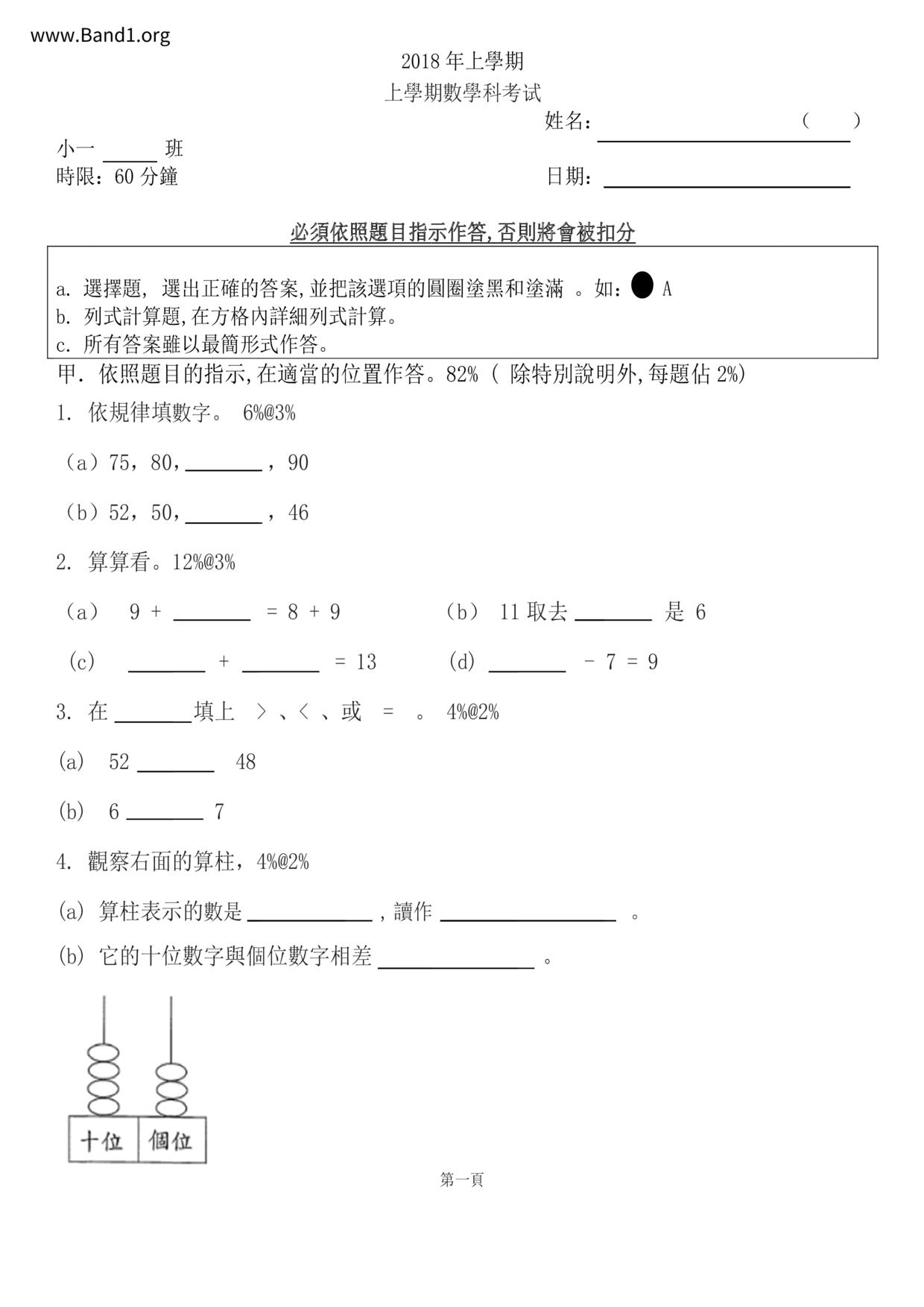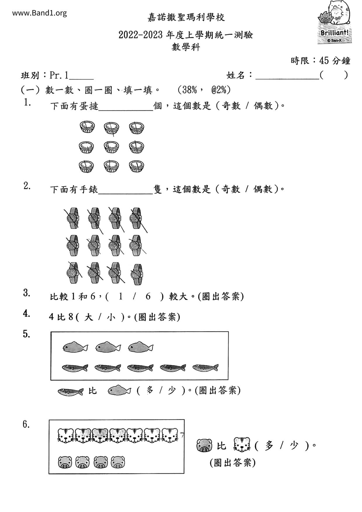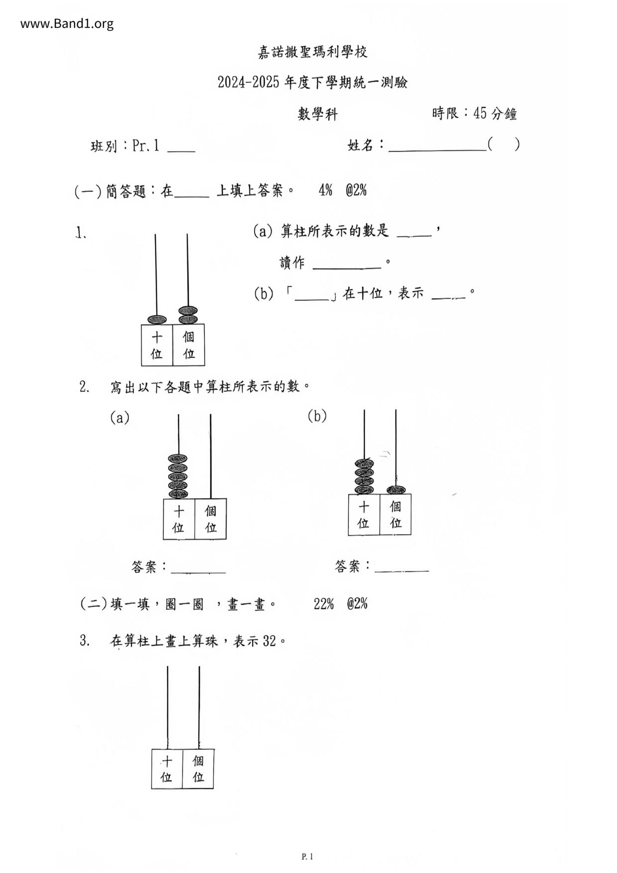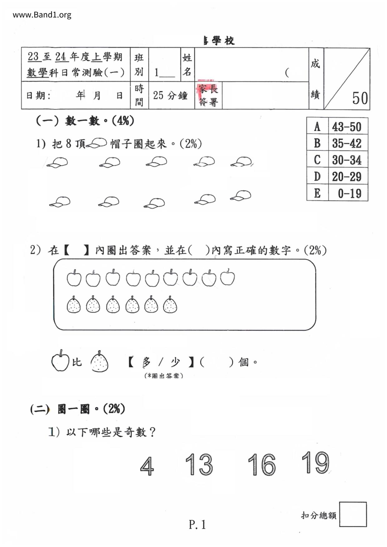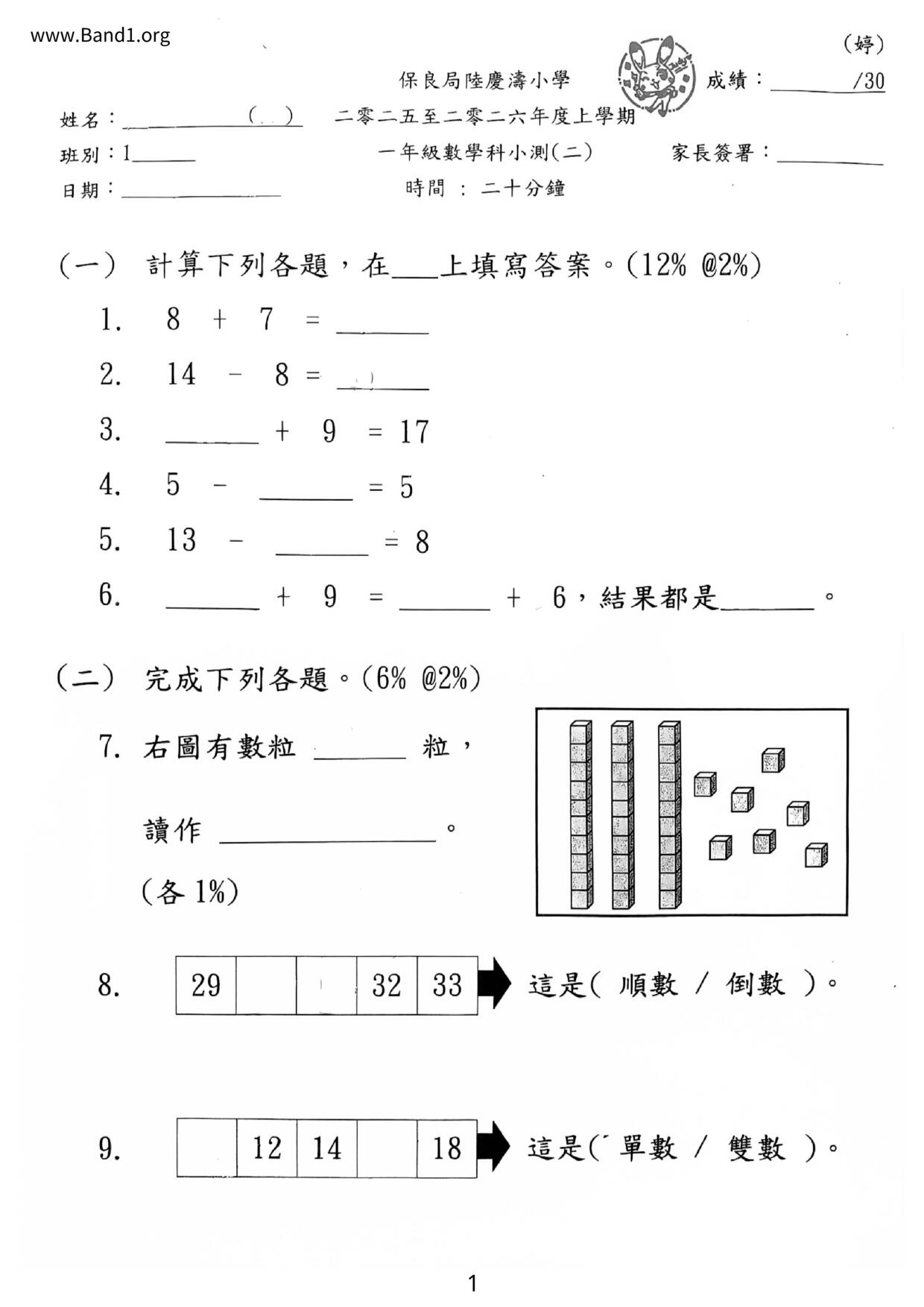 香港 小一 各科 (HK P1 maths) 試卷 pdf