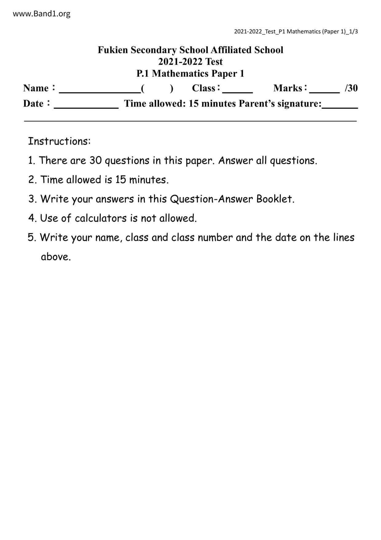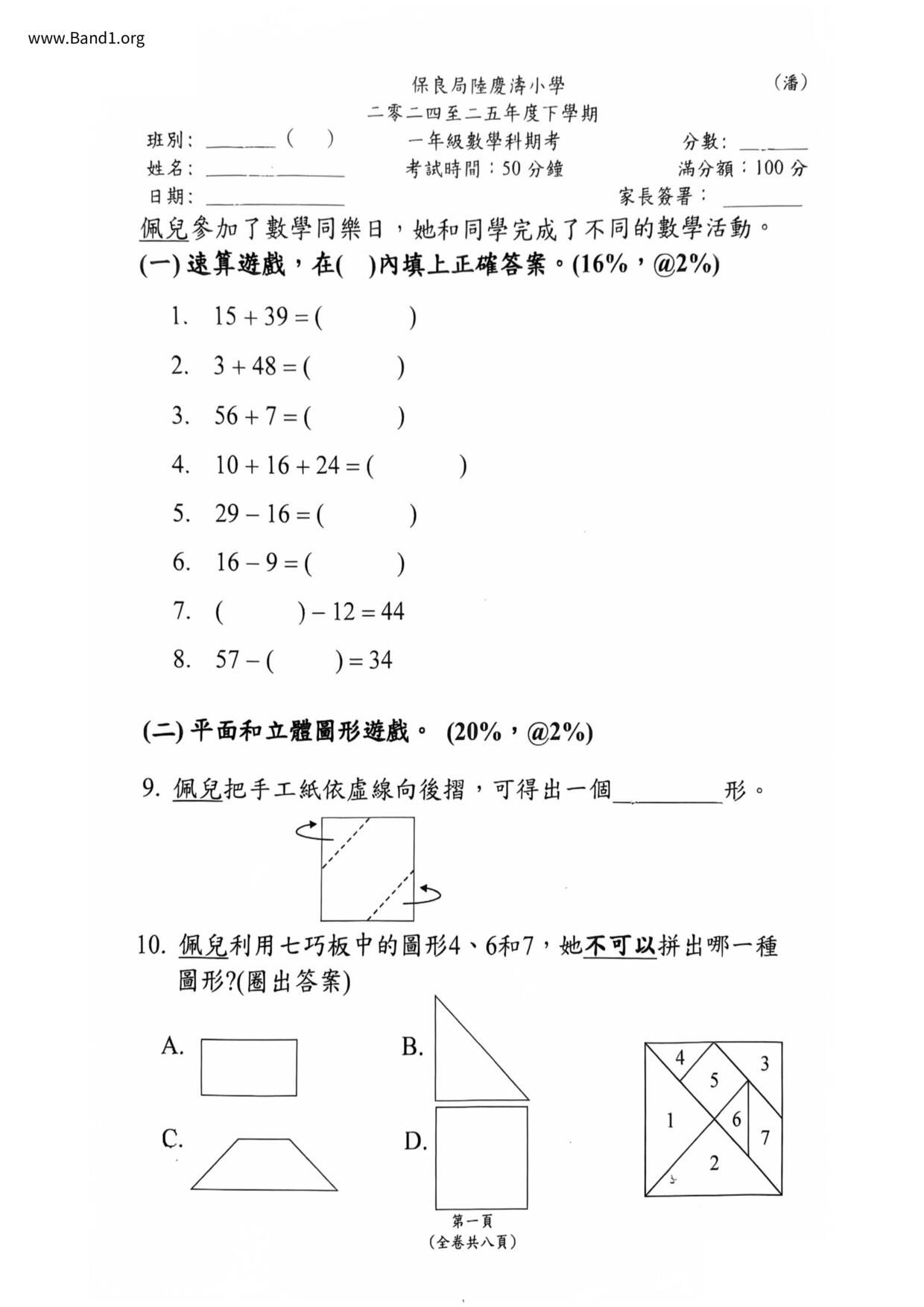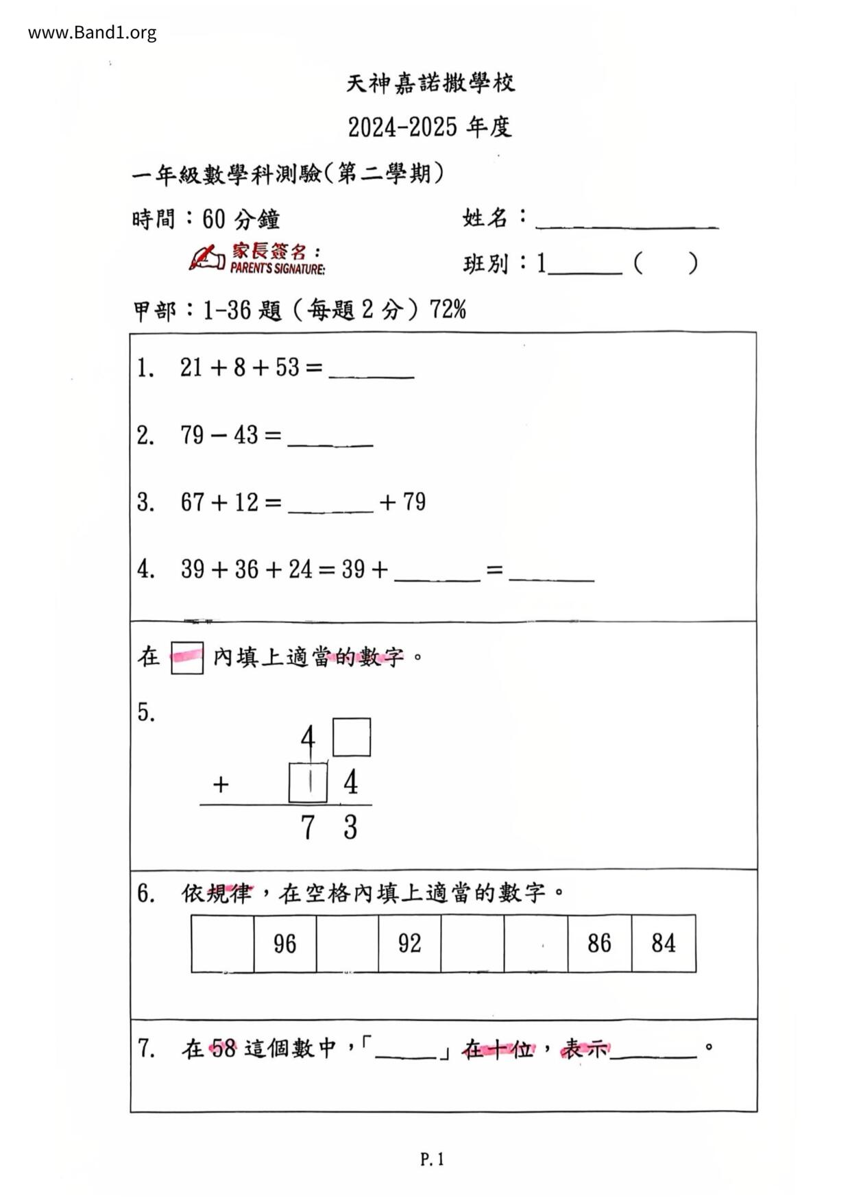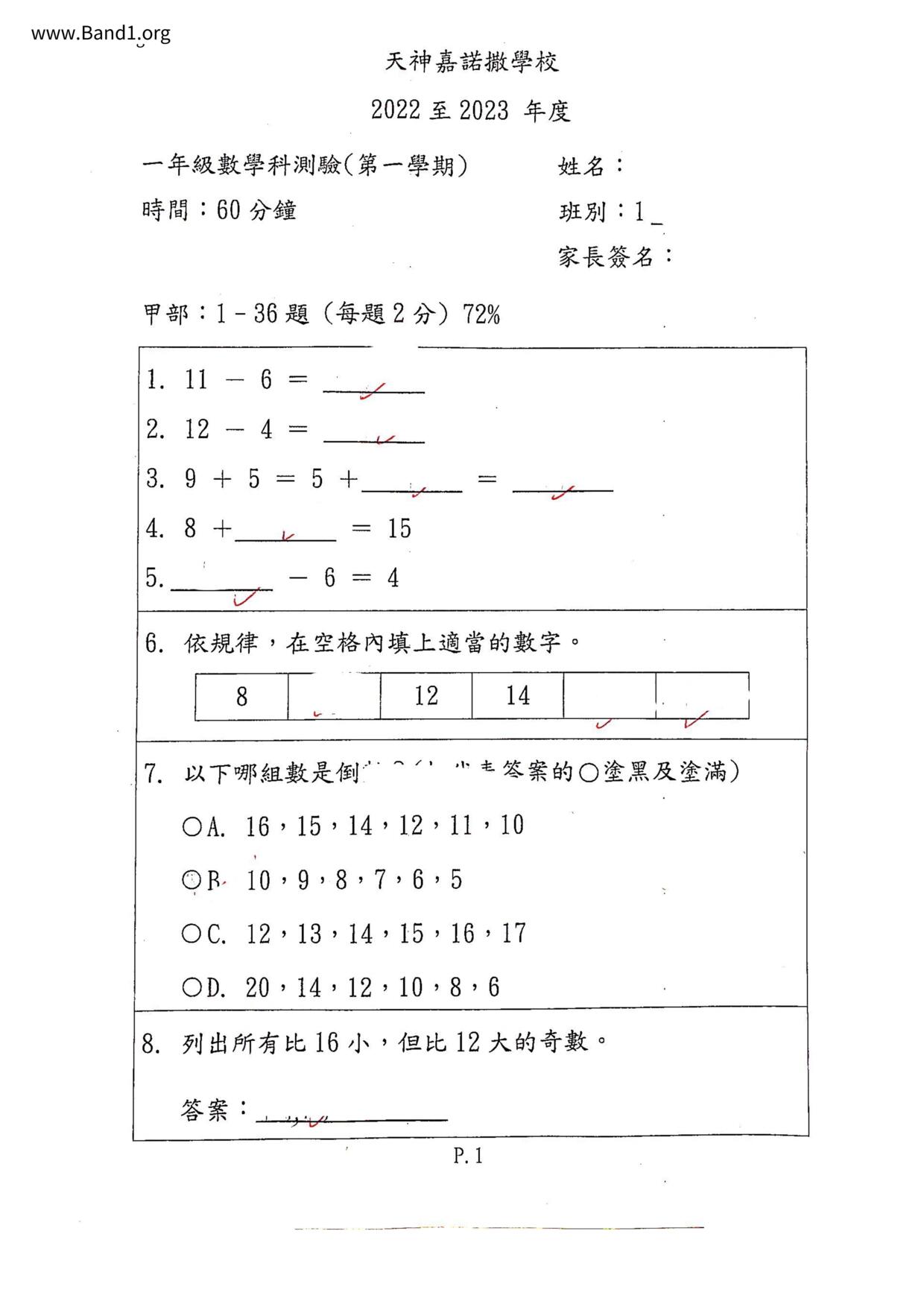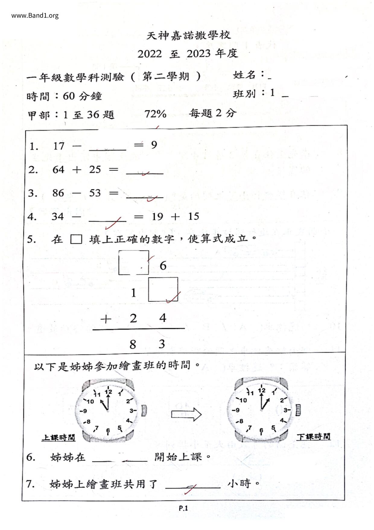 香港 小一 各科 (HK P1 maths) 試卷 pdf