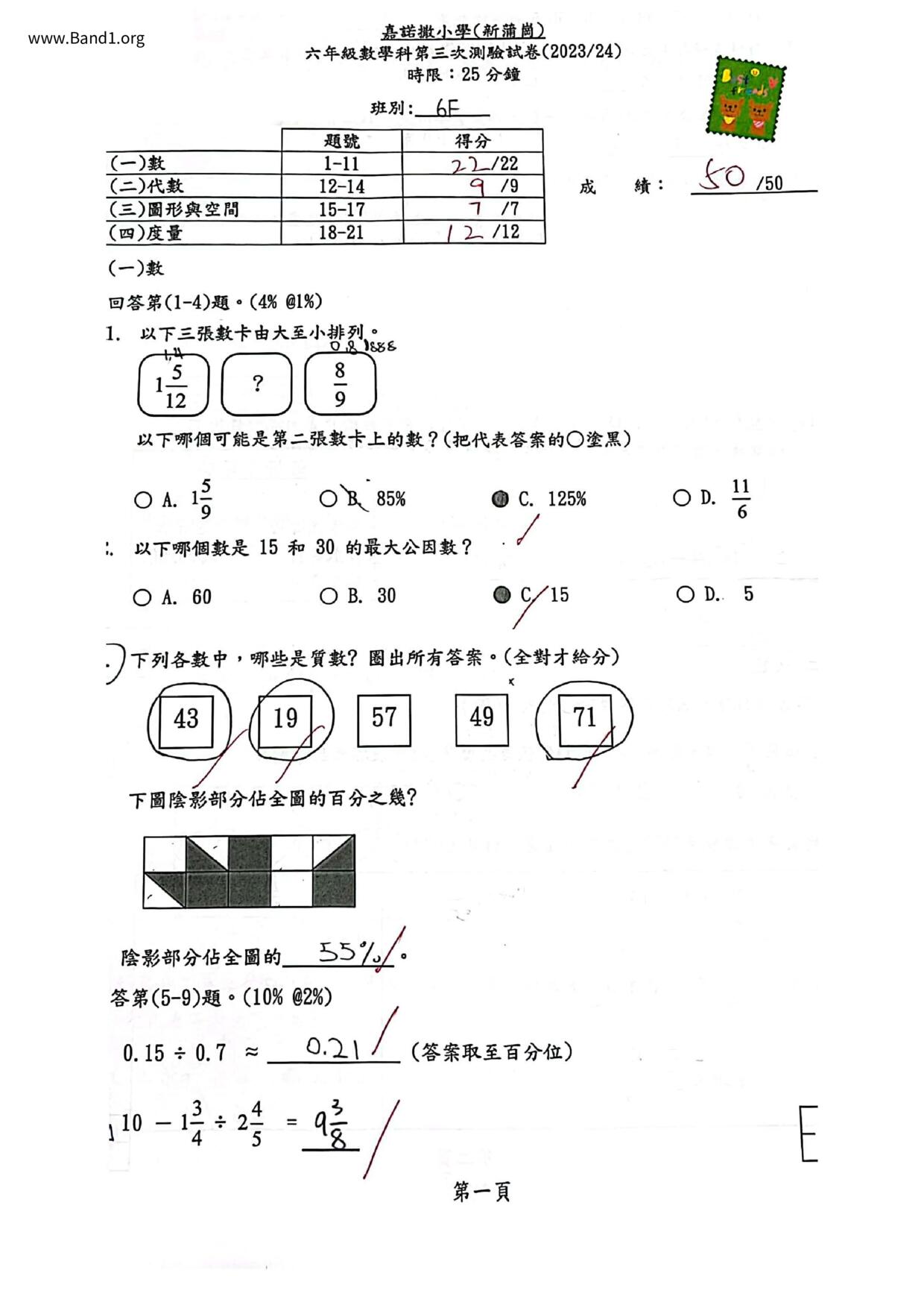 小六 數學 國際基督教優質音樂中學暨小學