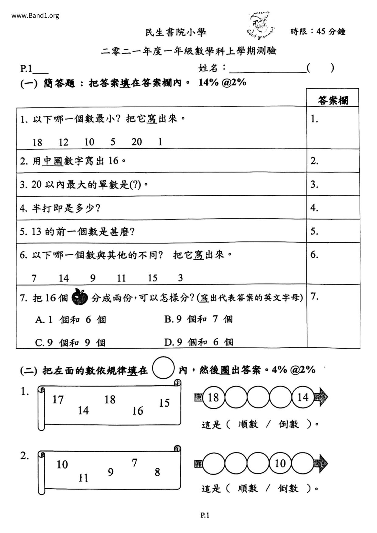 香港 中小學 數學 (HK p1 Maths) 試卷 pdf