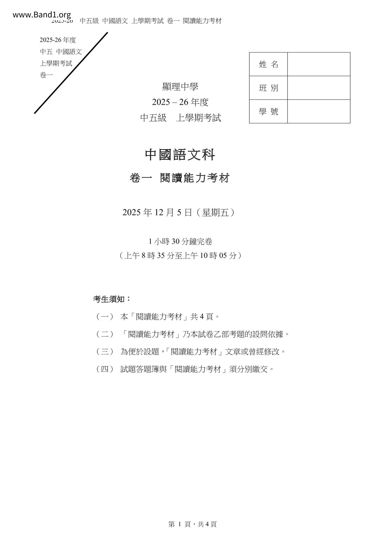 中五 中文 顯理中學