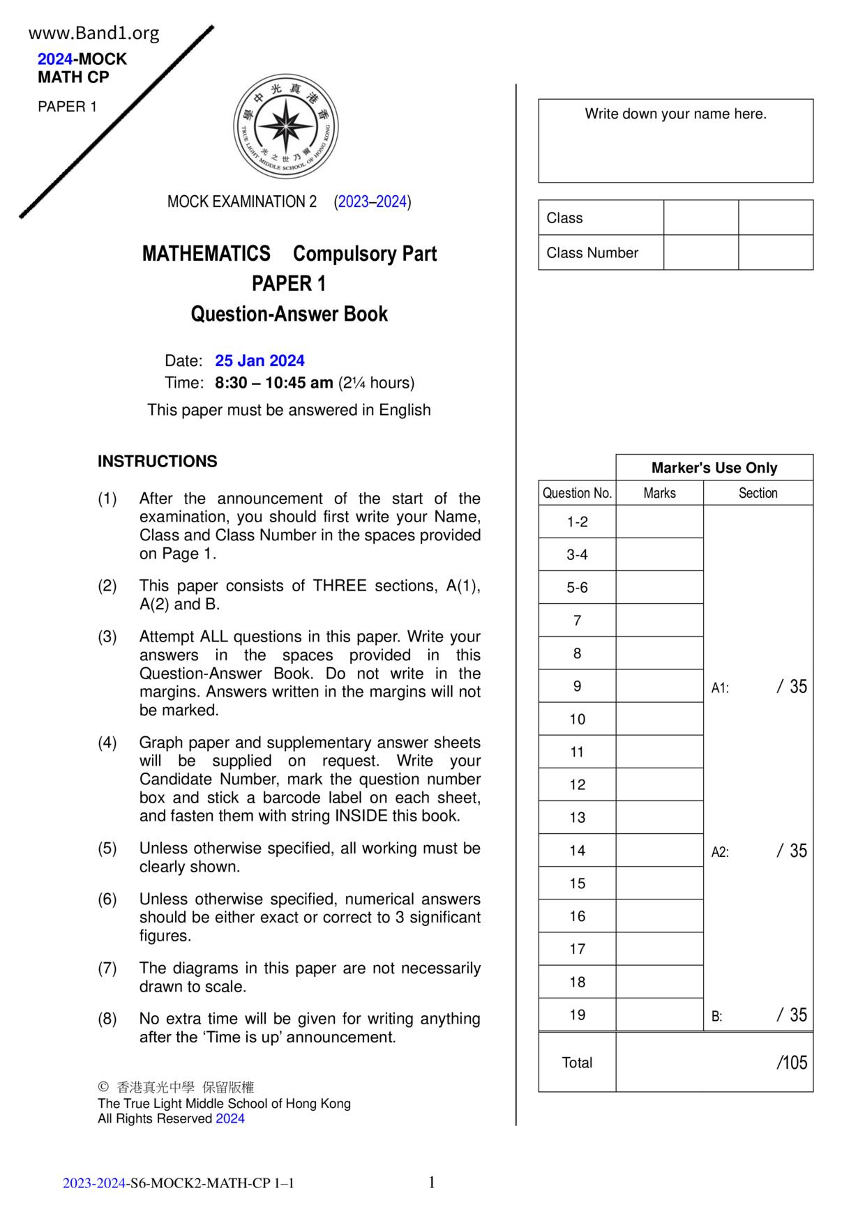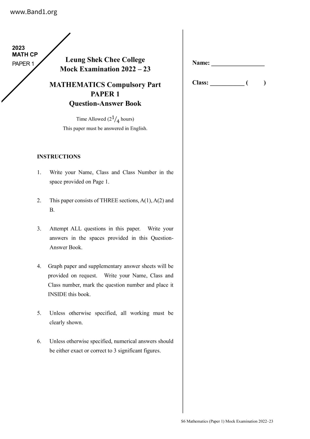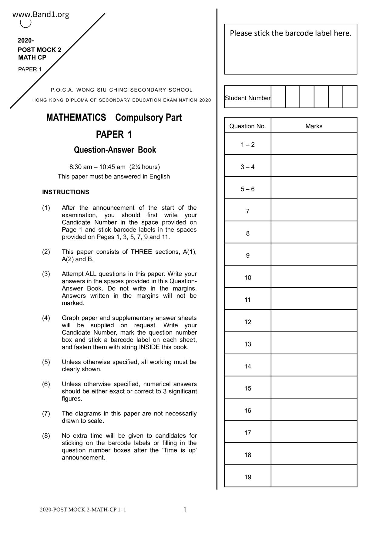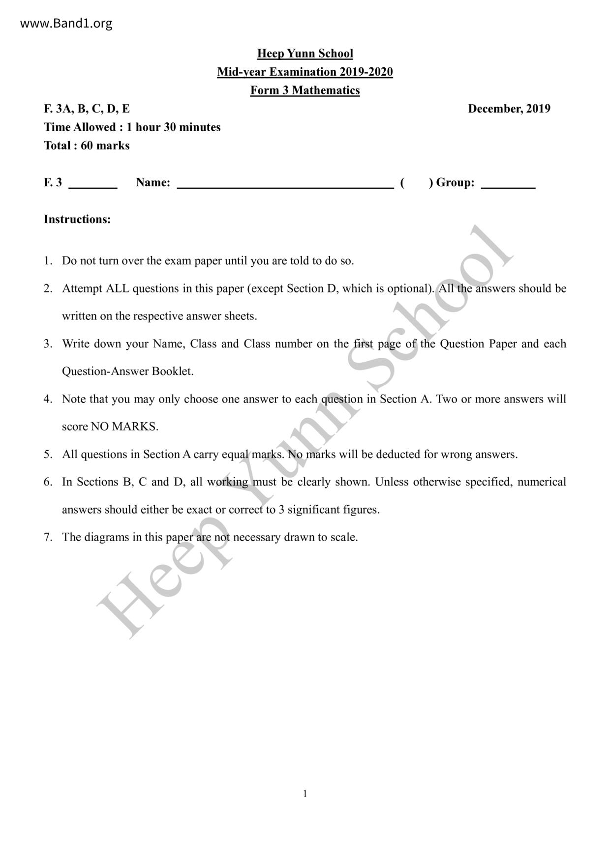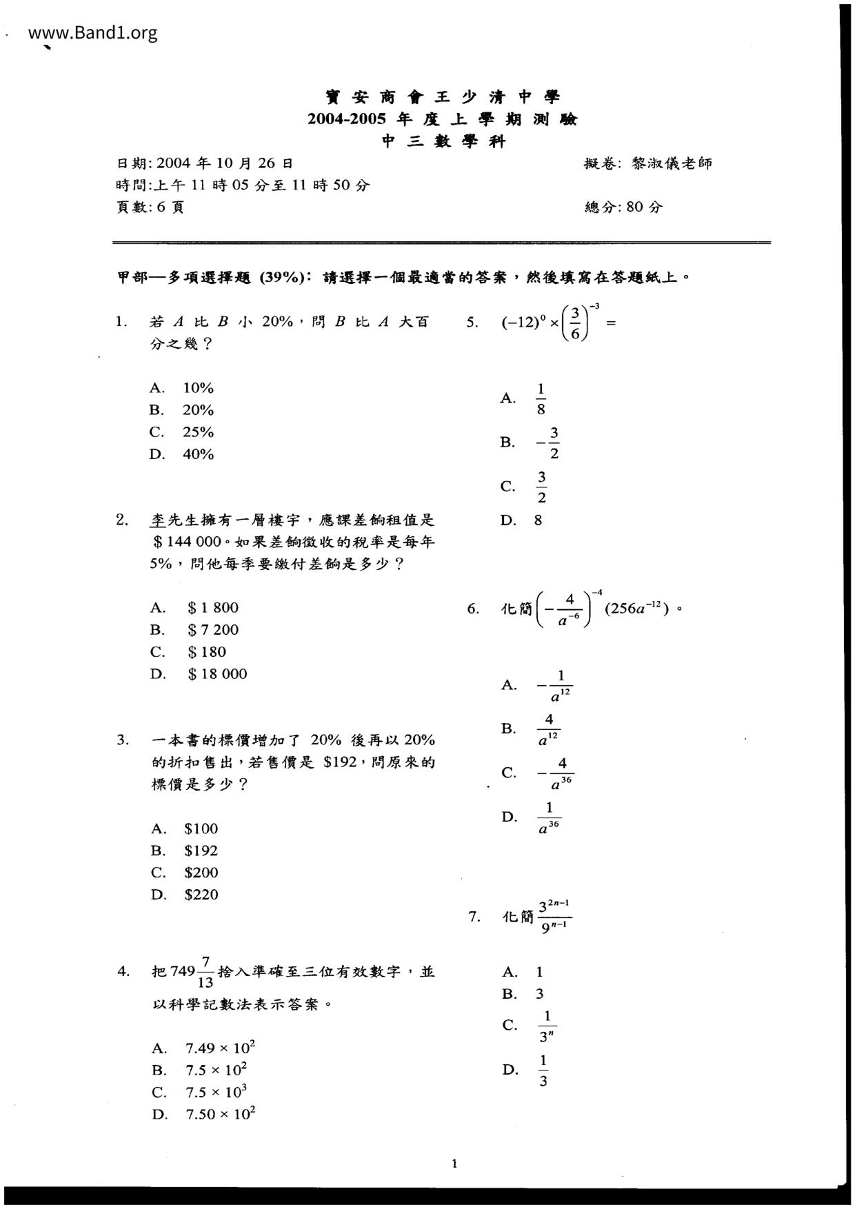 香港 中小學 數學 (HK Maths) 試卷 pdf