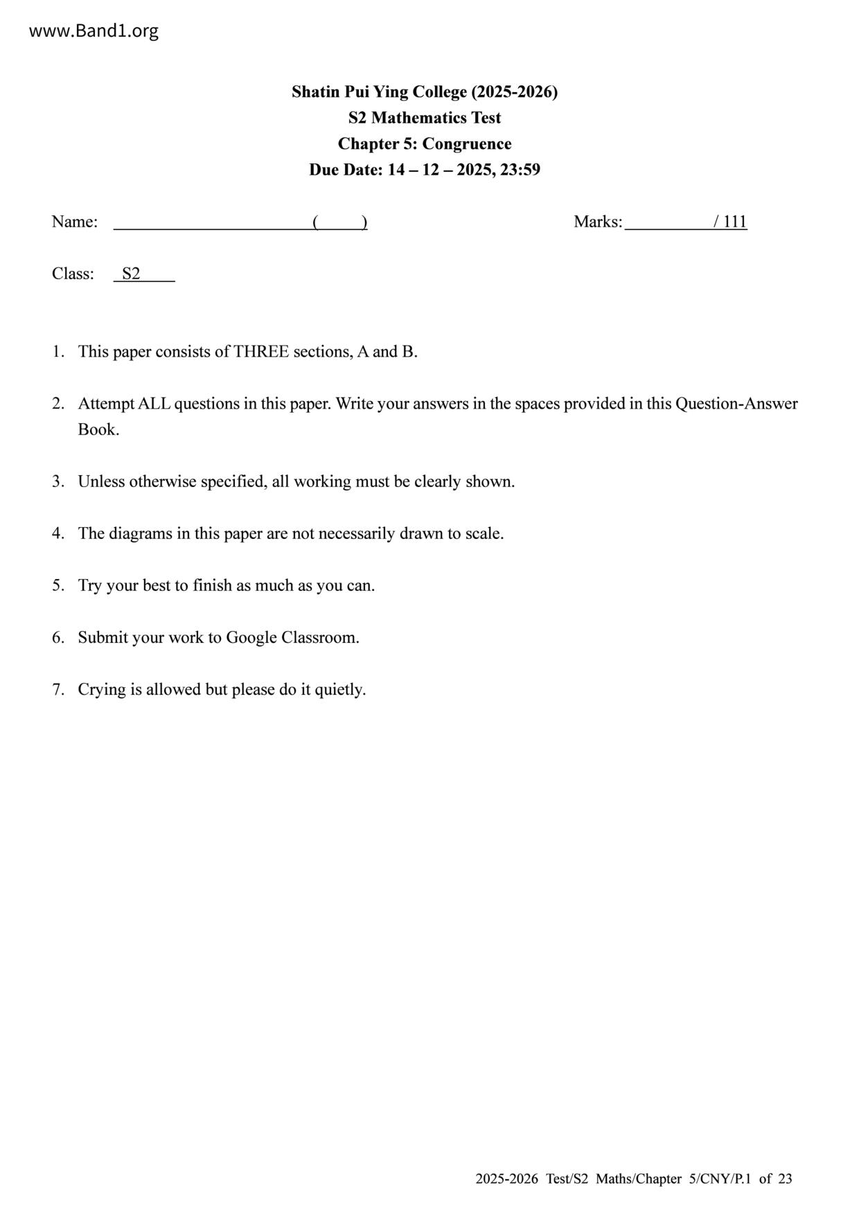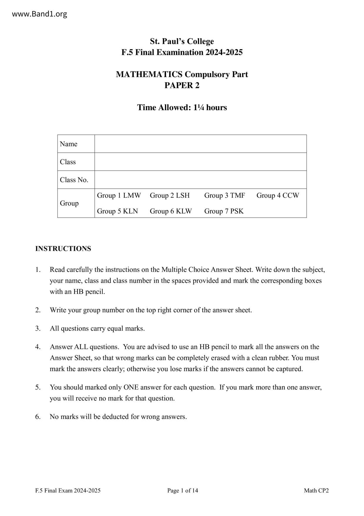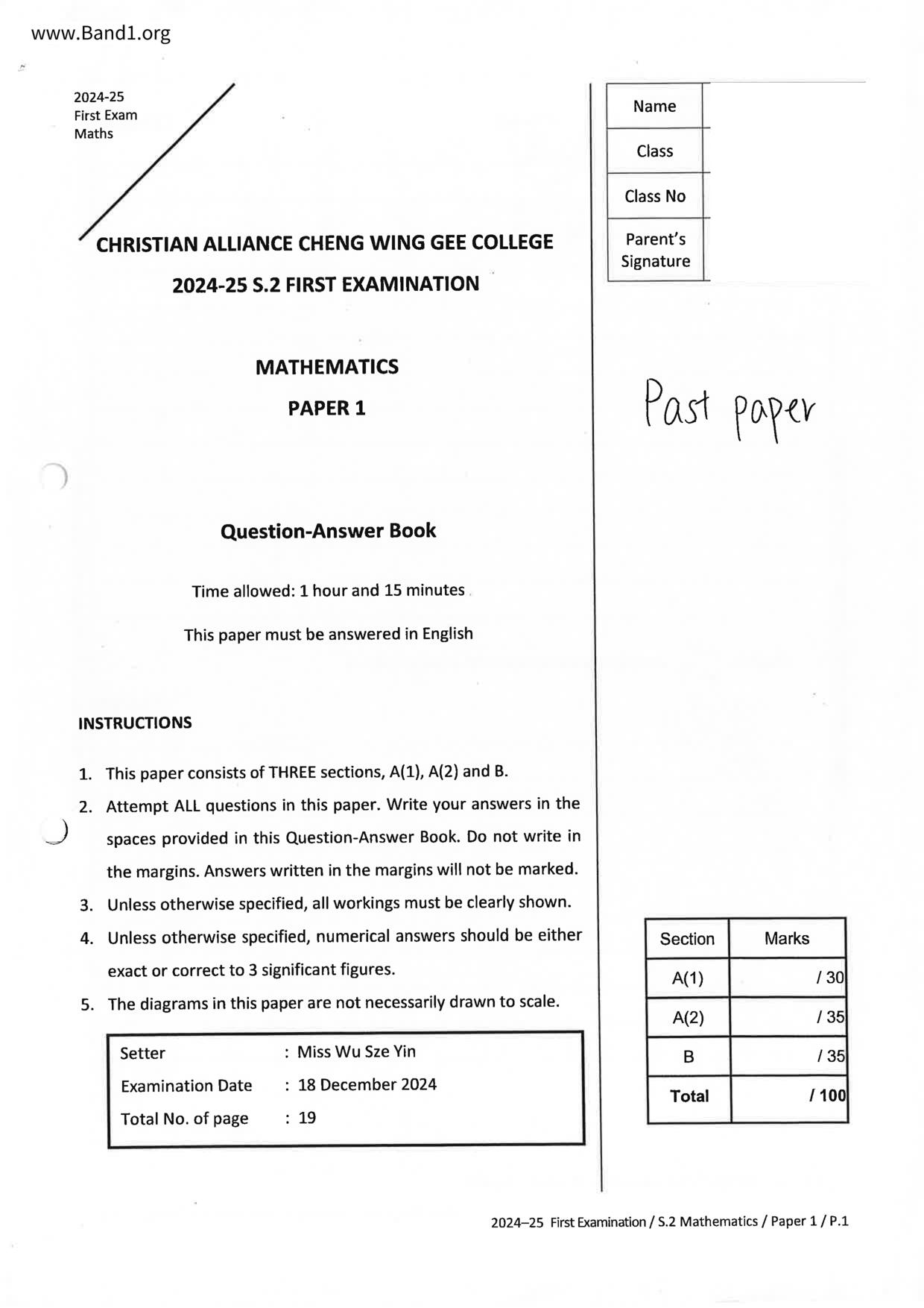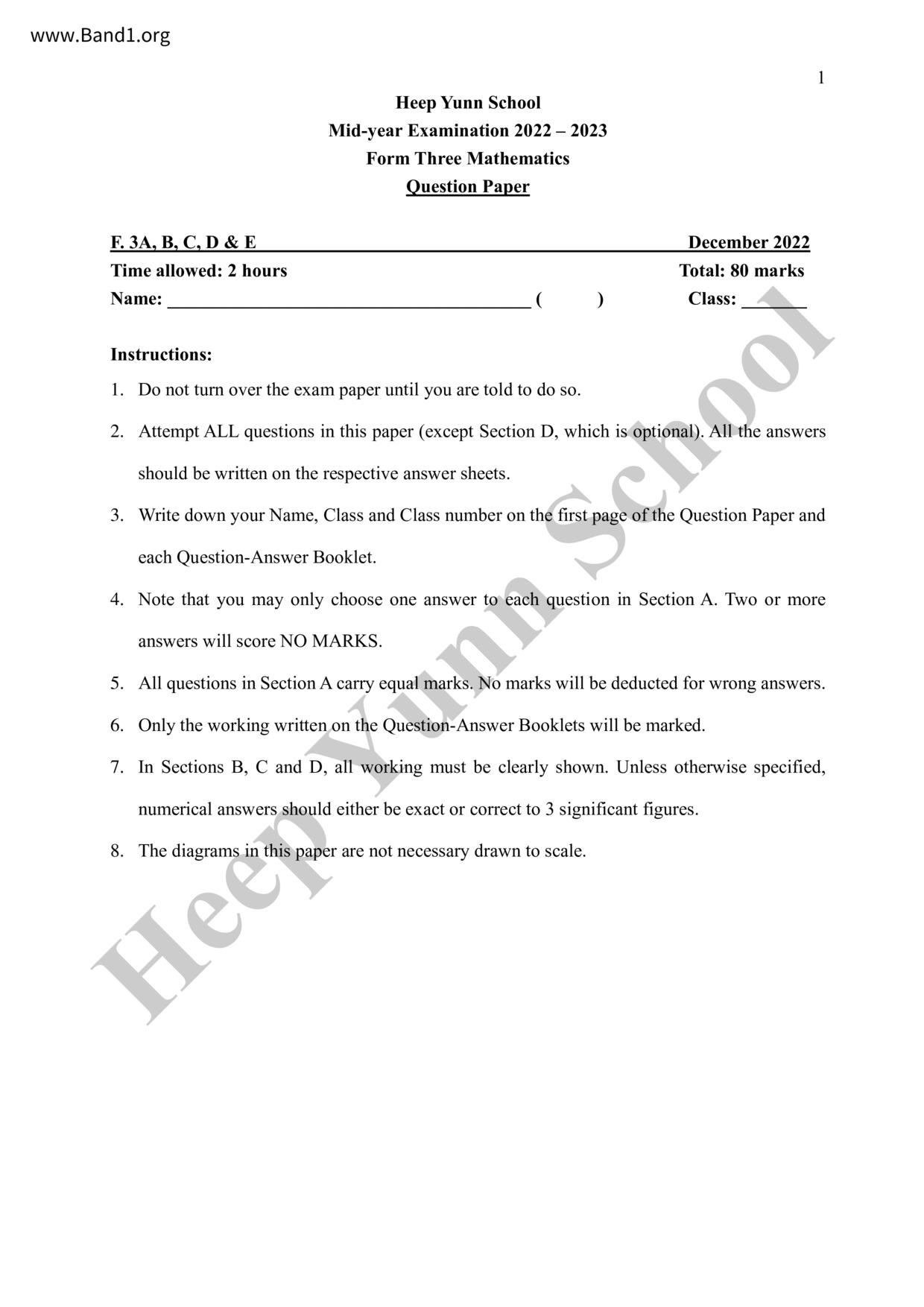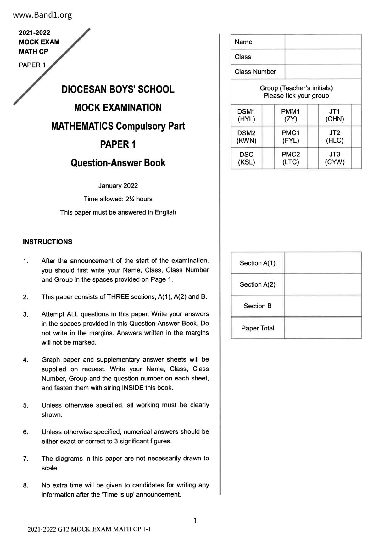香港 中小學 數學 (HK Maths) 試卷 pdf
