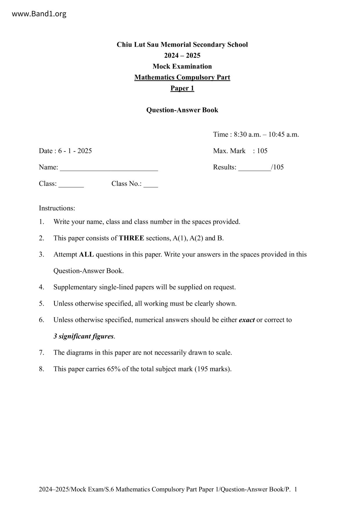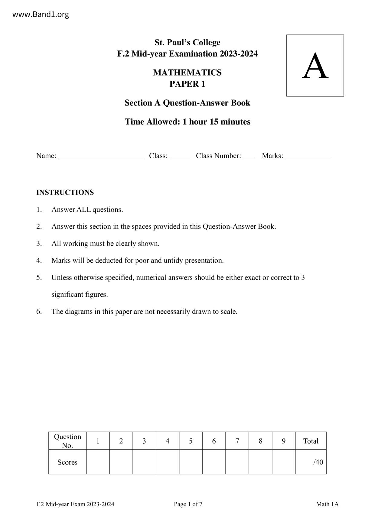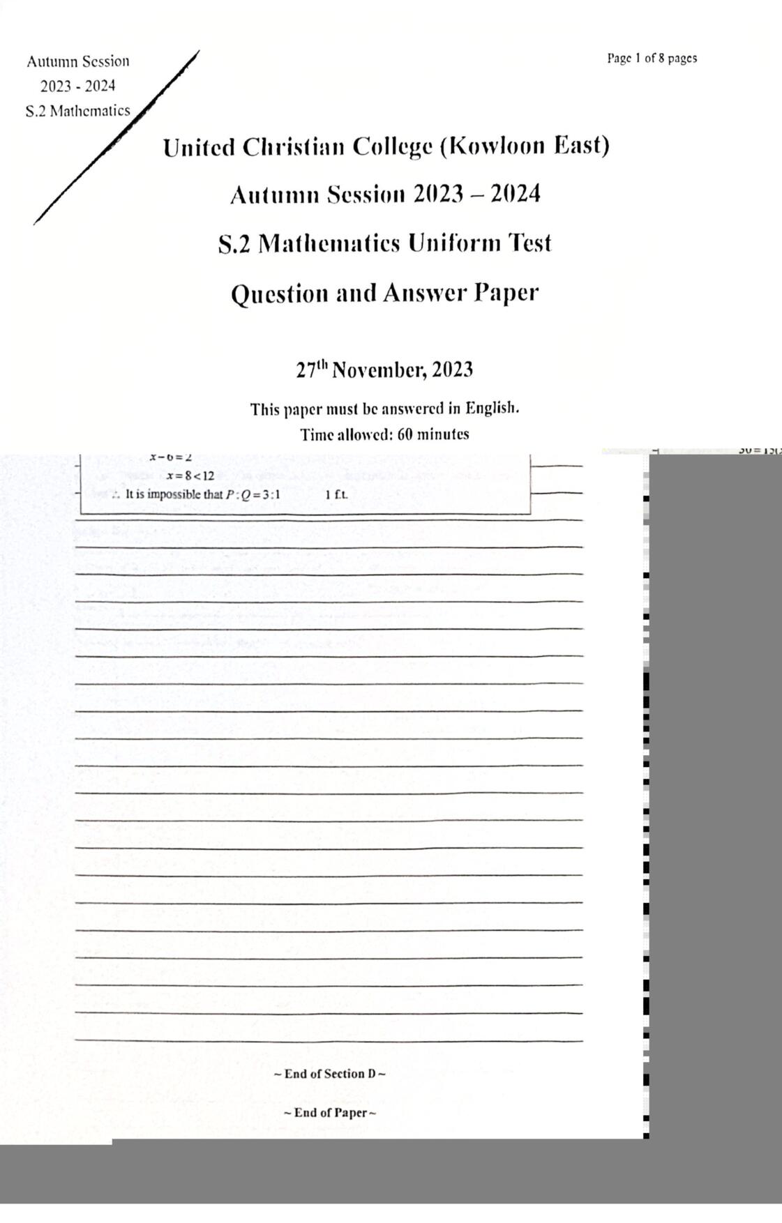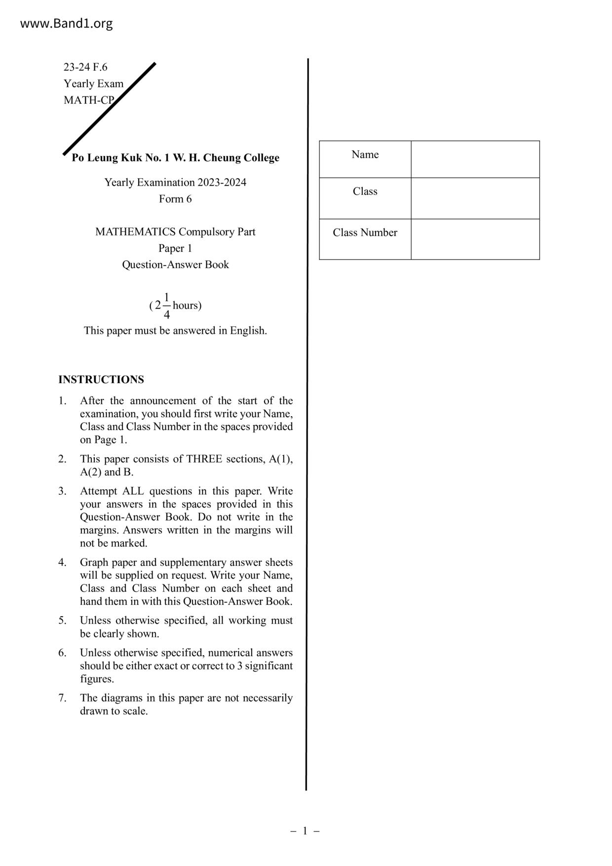 香港 中小學 數學 (HK Maths) 試卷 pdf