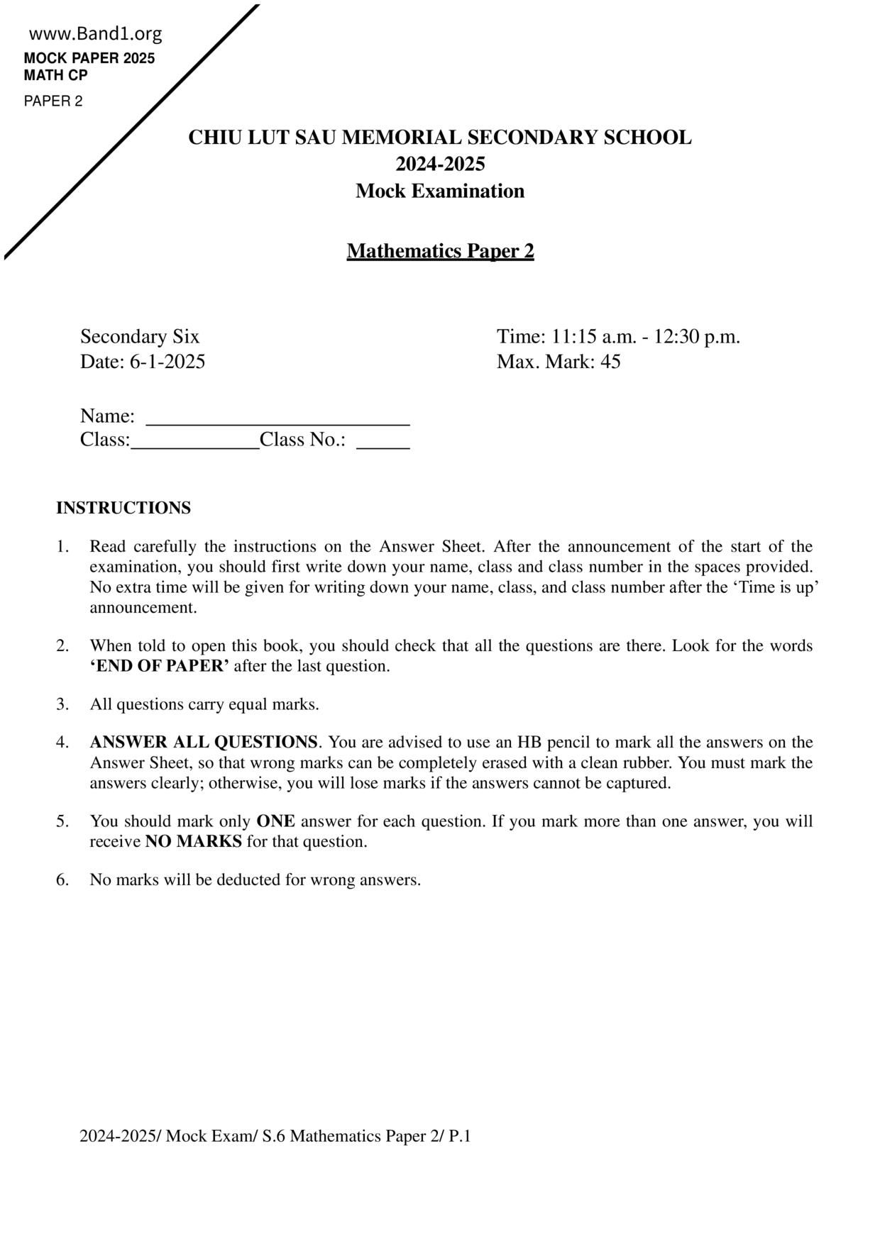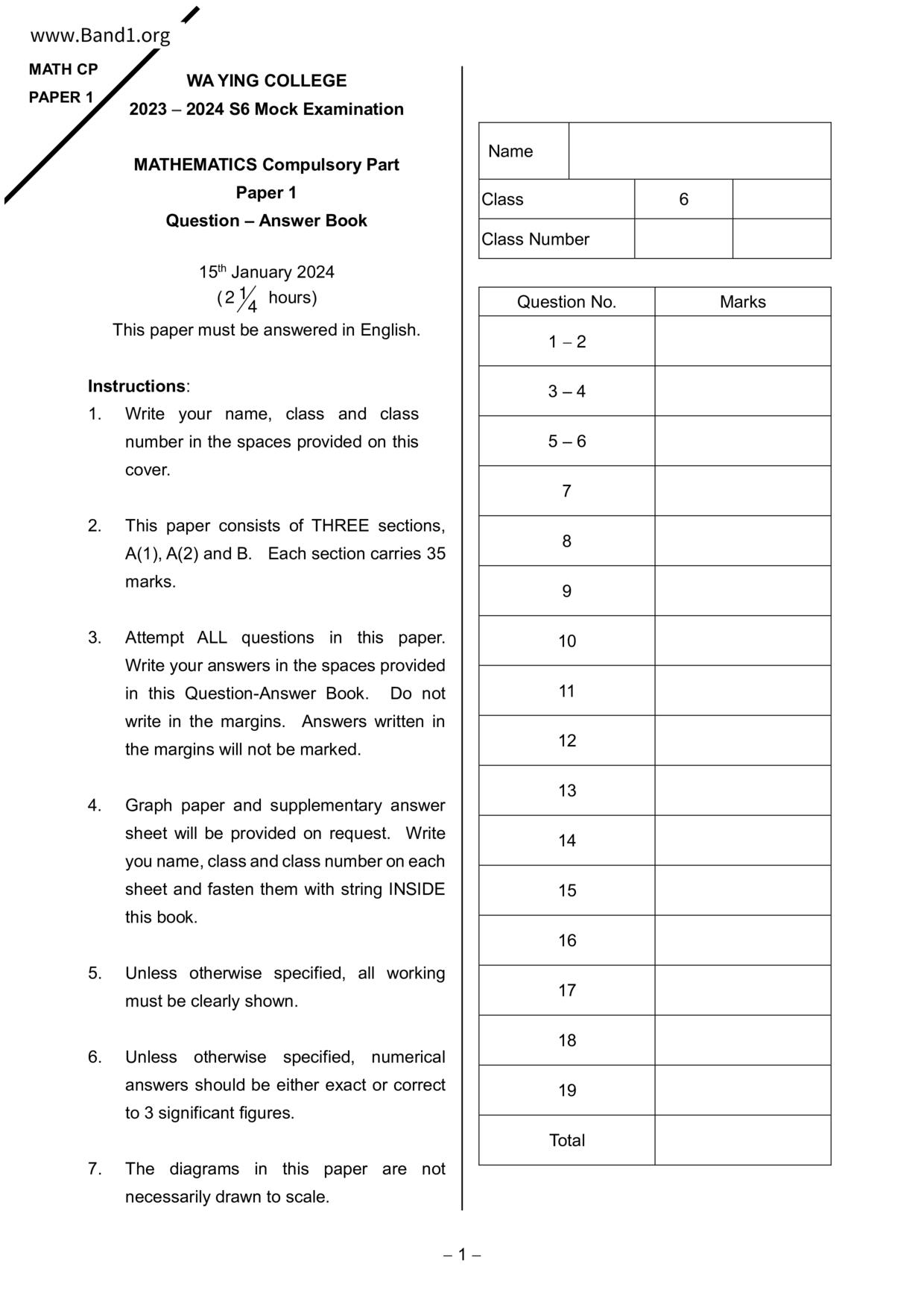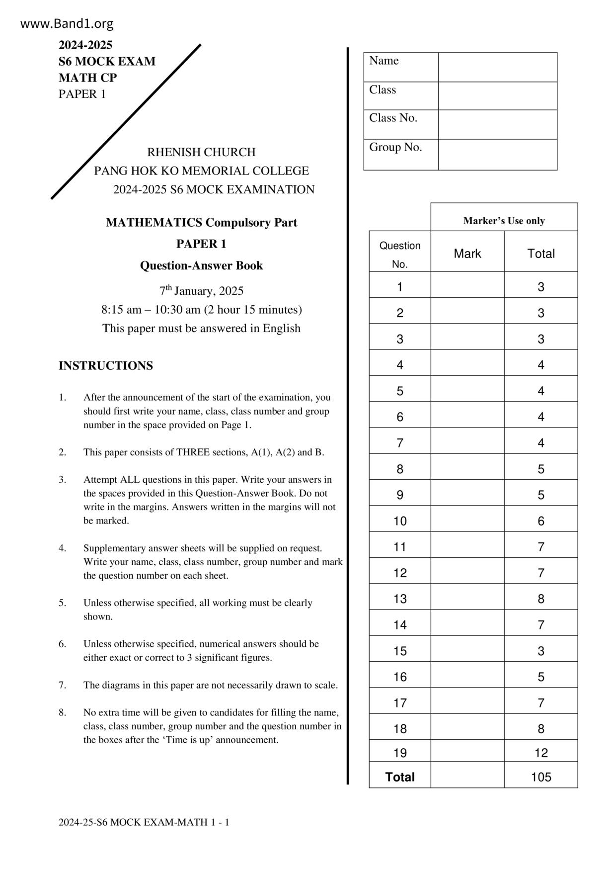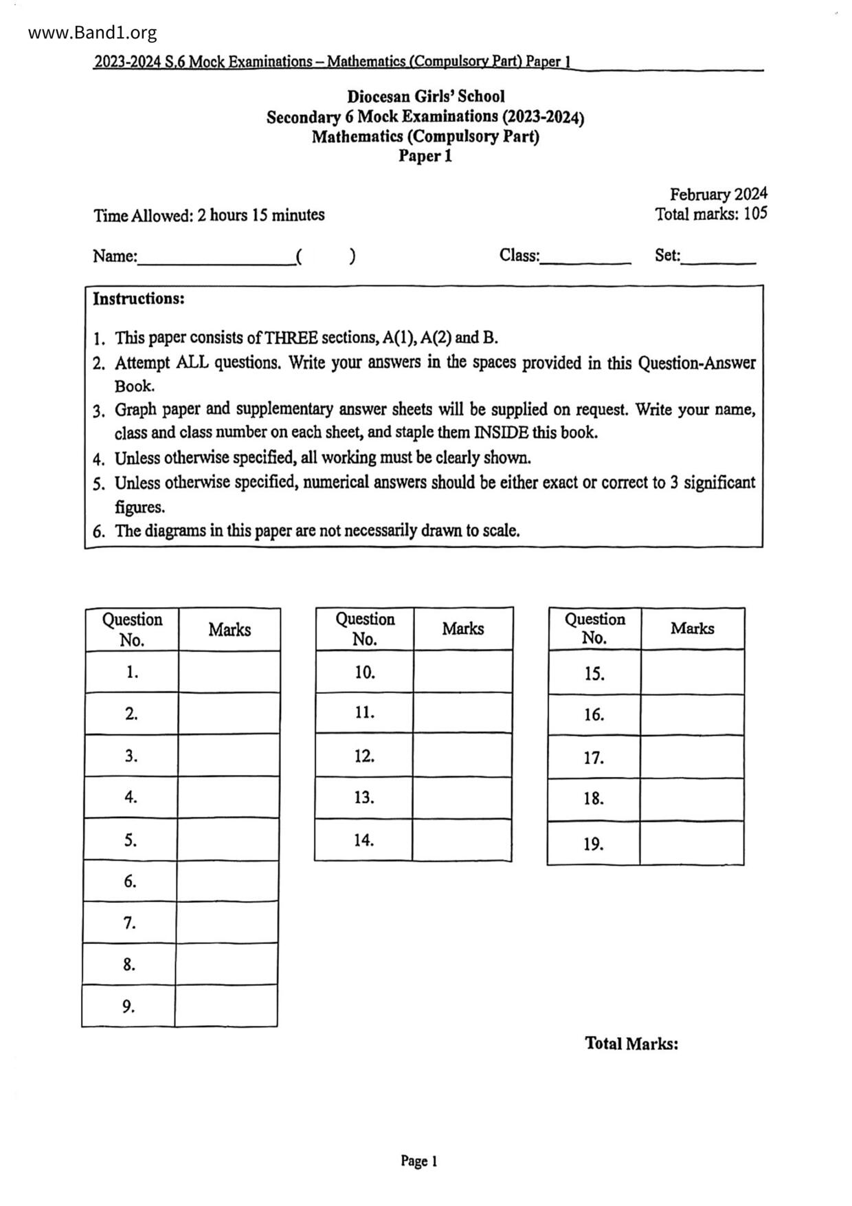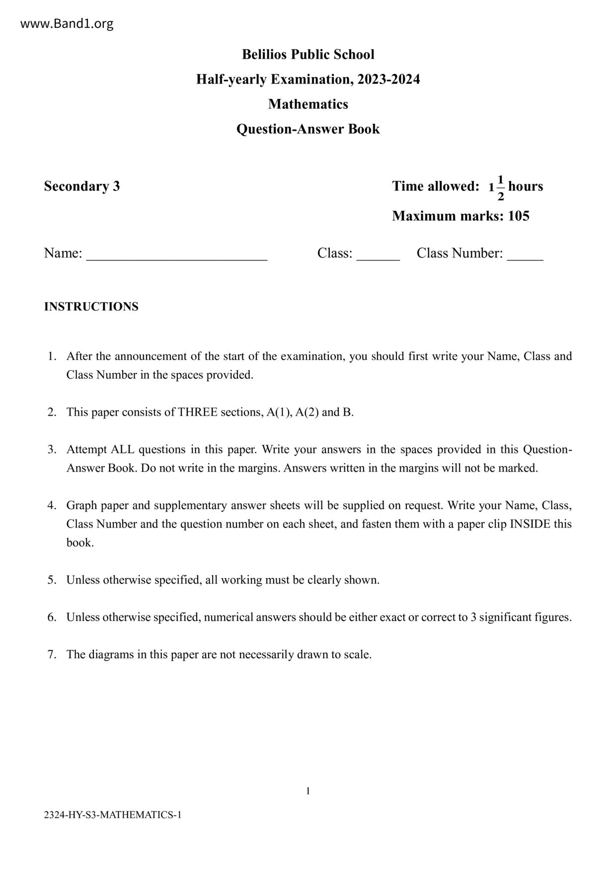 香港 中小學 數學 (HK Maths) 試卷 pdf