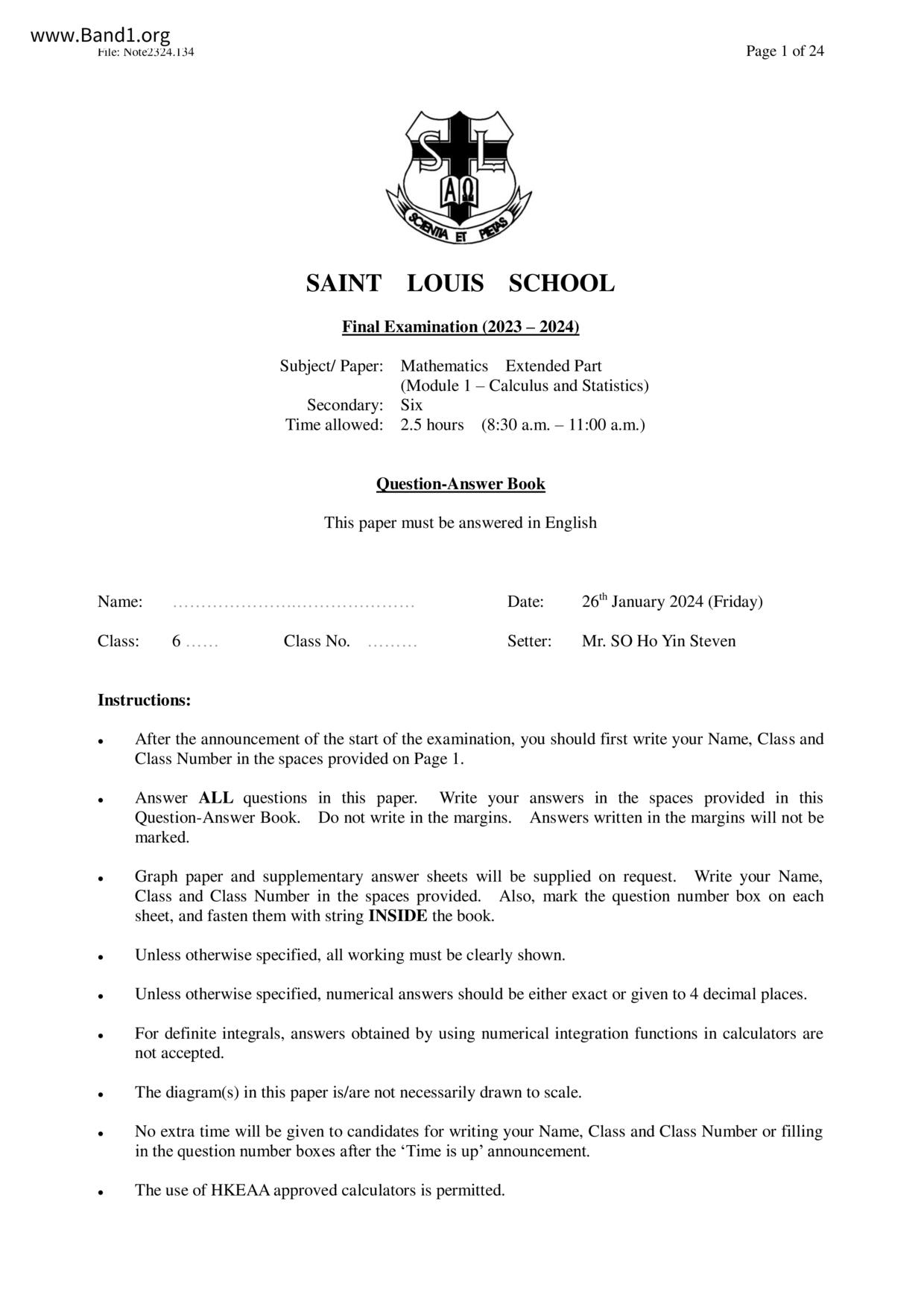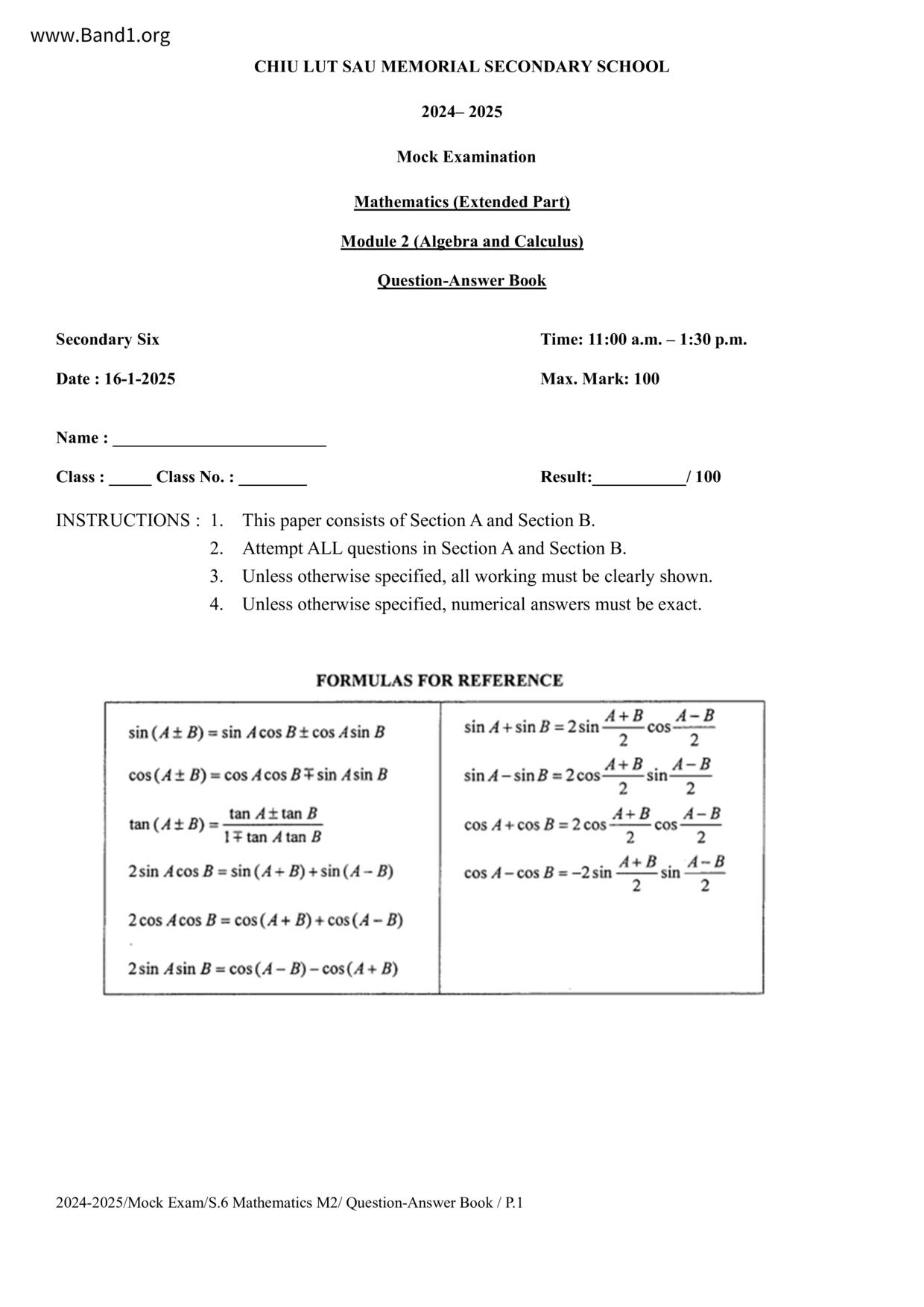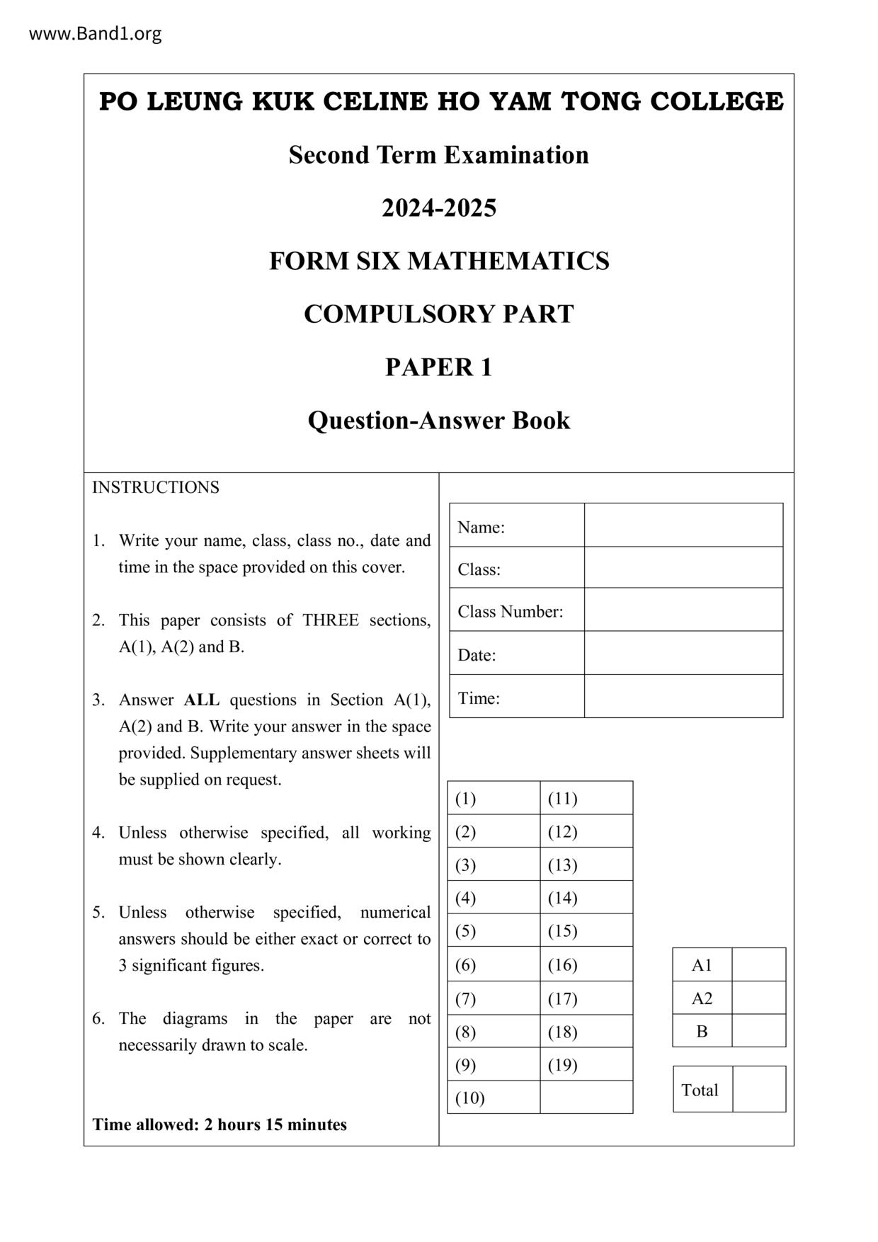 中六 數學 聖公會白約翰會督中學