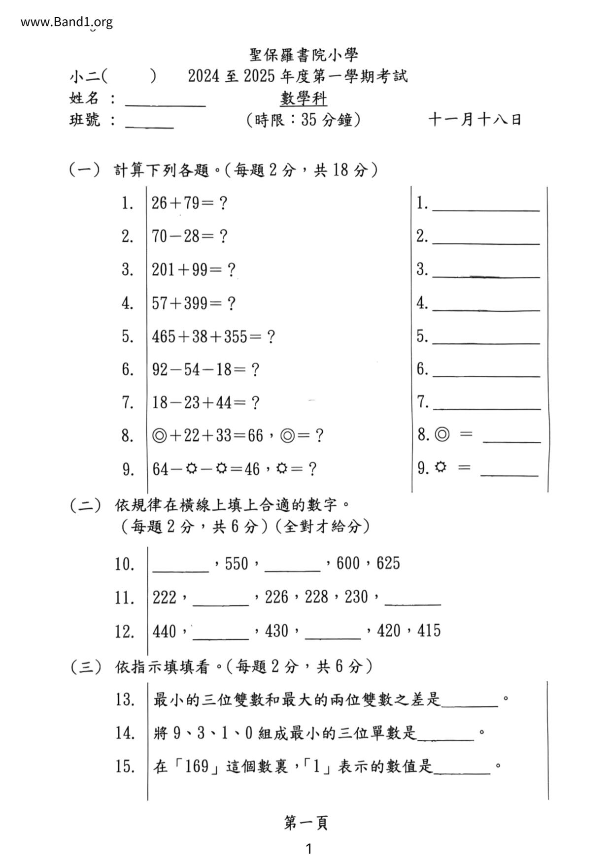 小一 數學 (P1 Maths)