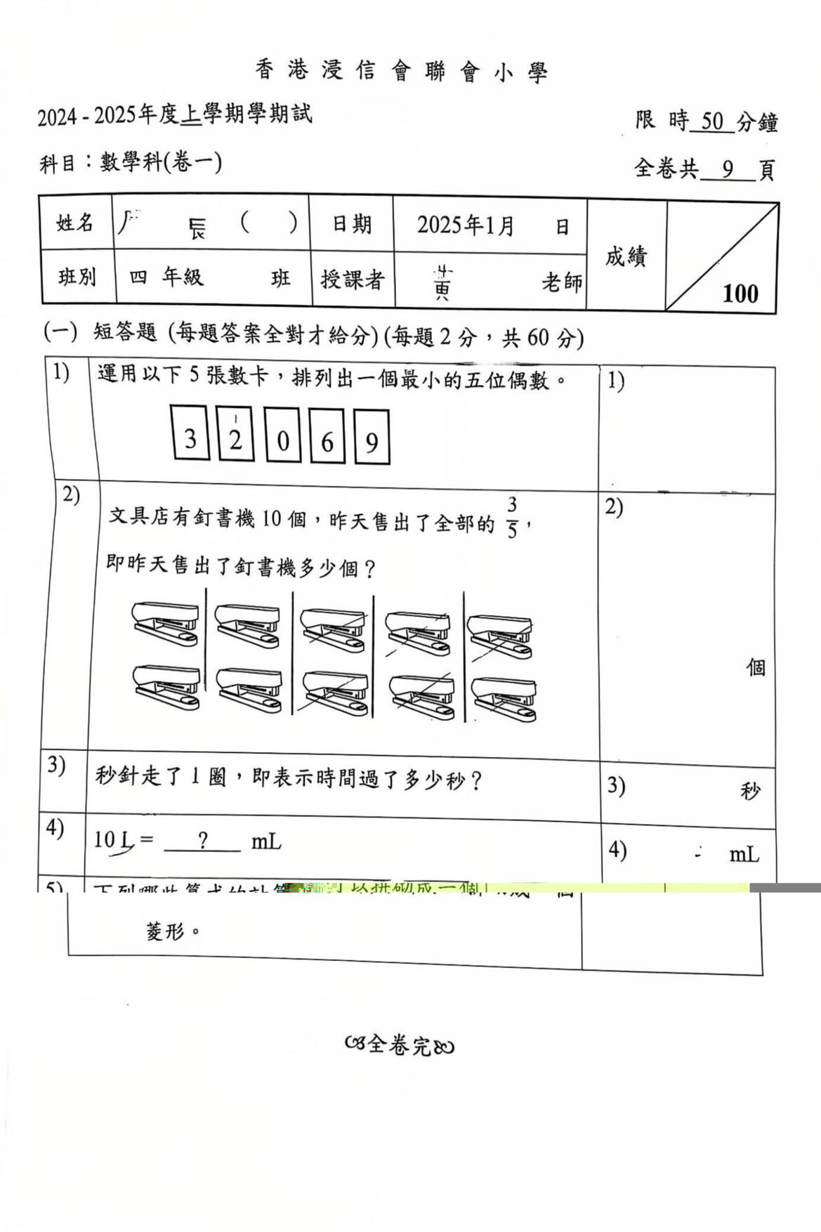 小四 數學 聖保祿學校