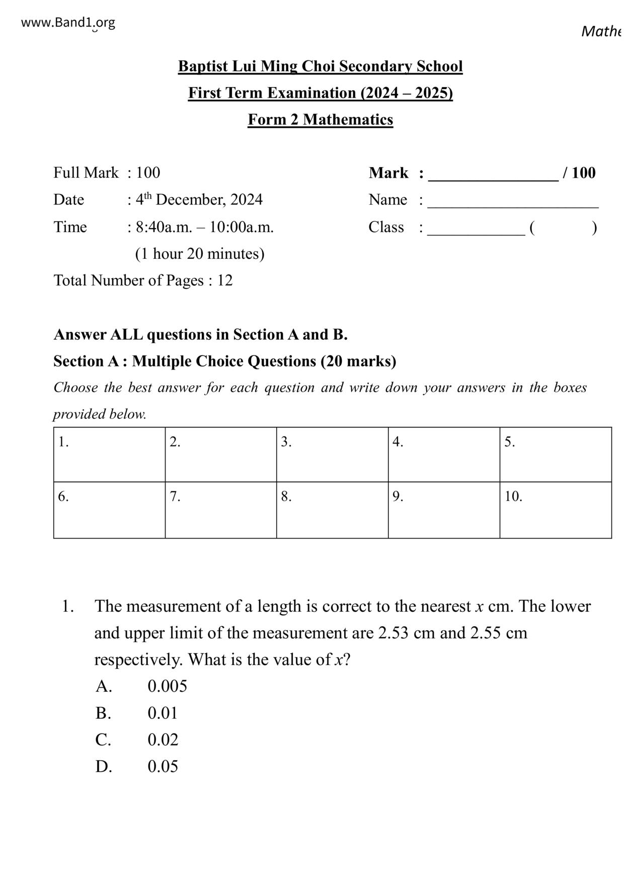 中一 數學 浸信會呂明才中學