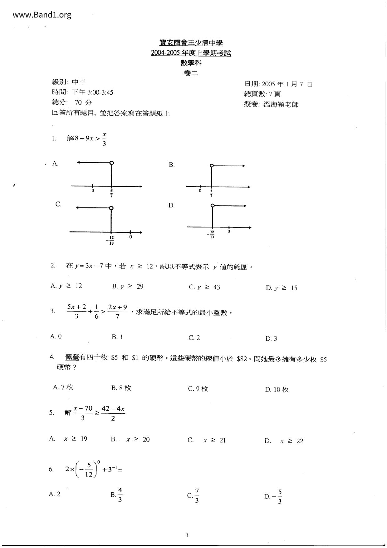 中六 數學 順利天主教中學