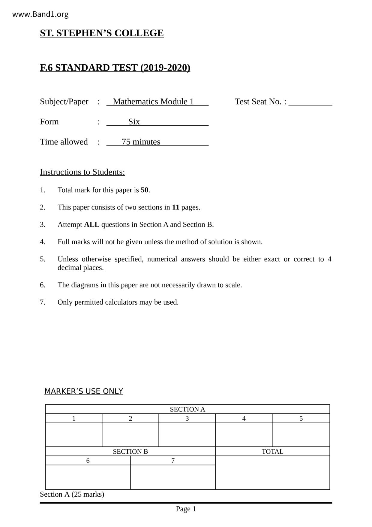 中六 數學 聖瑪加利男女英文中小學