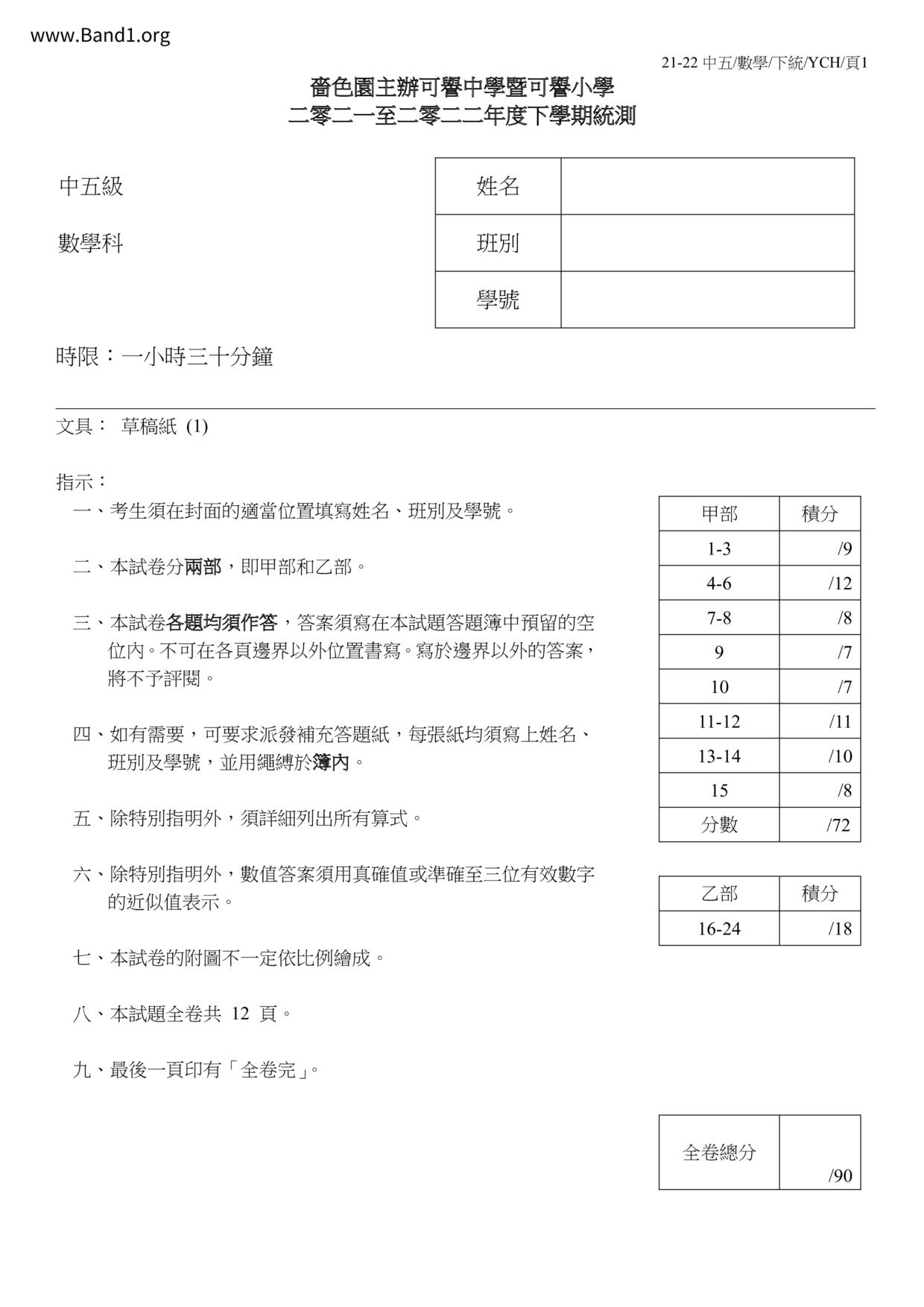 中五 數學 嗇色園主辦可譽中學暨可譽小學