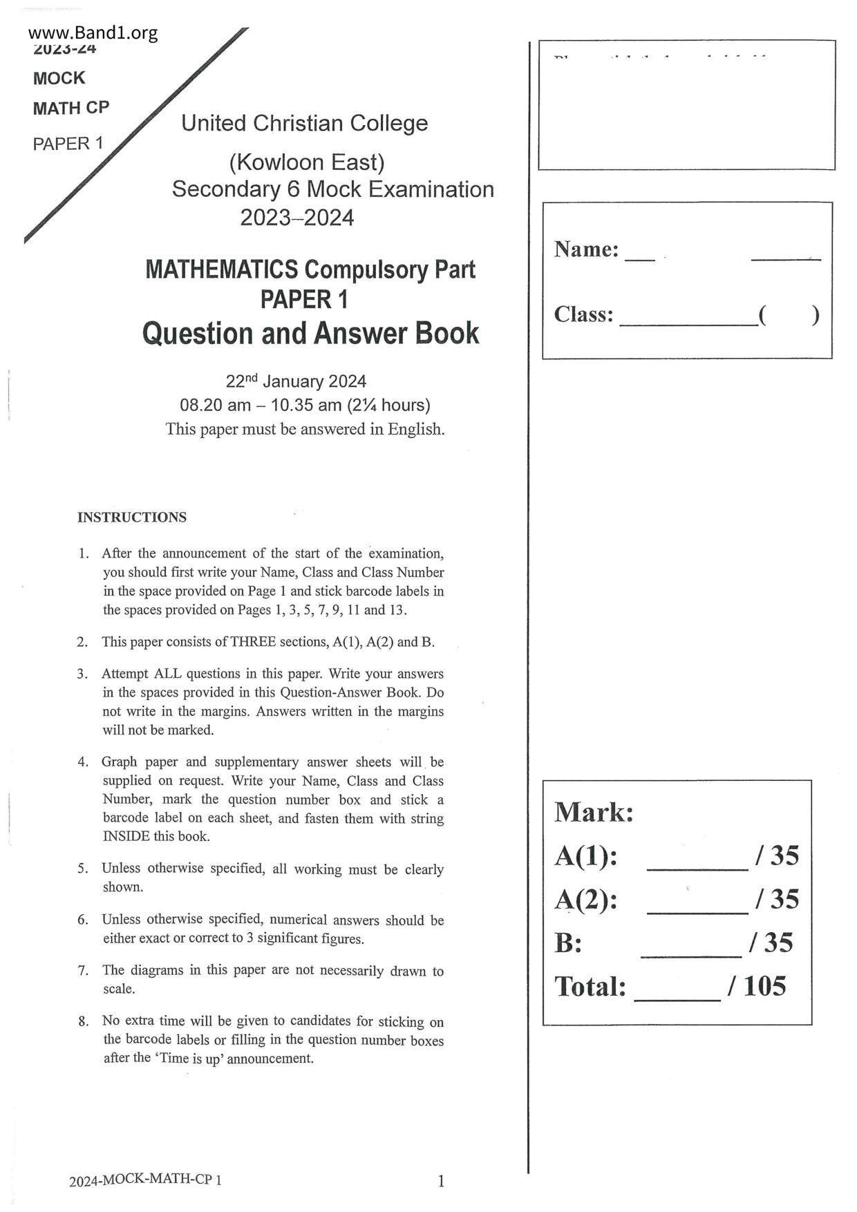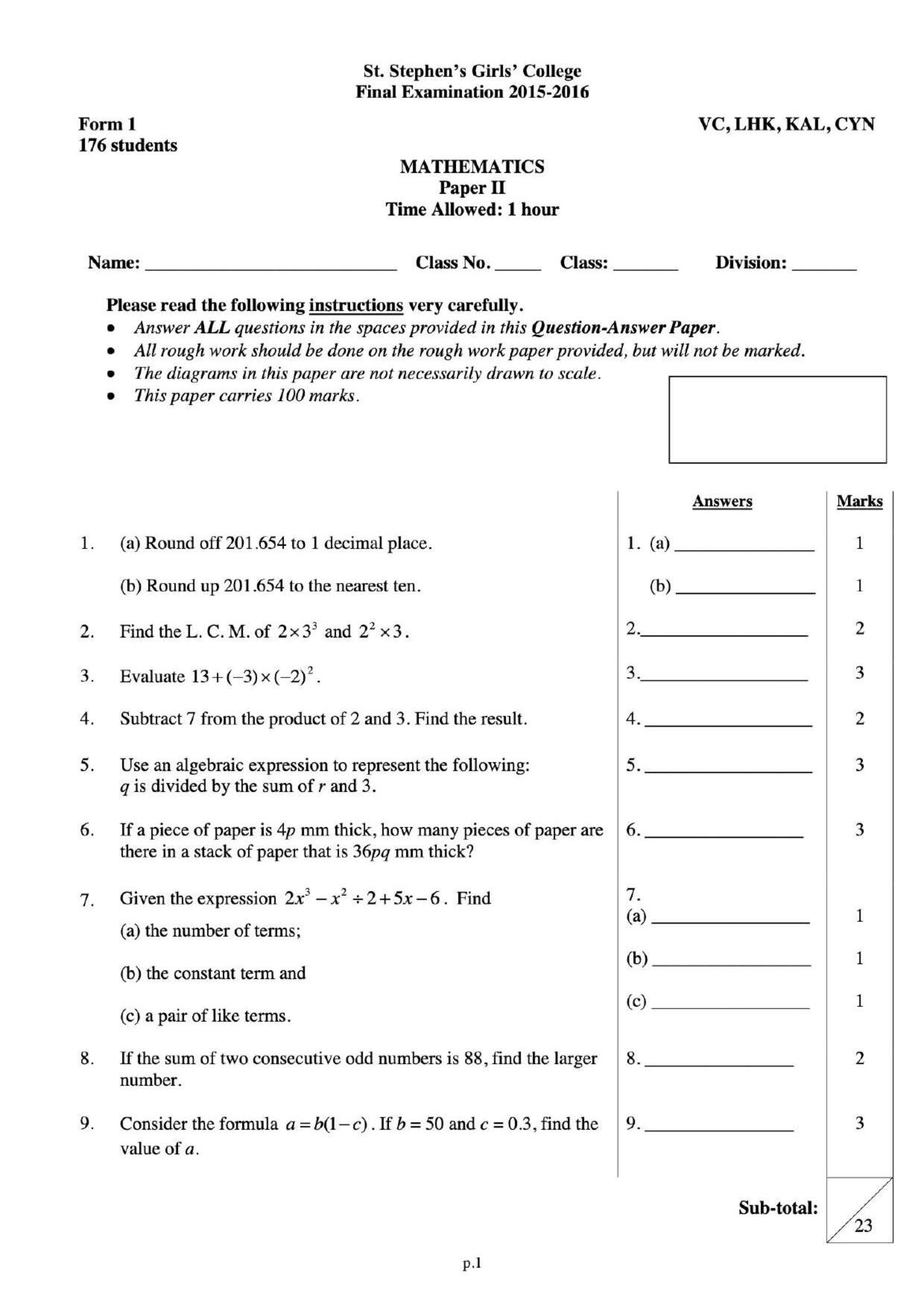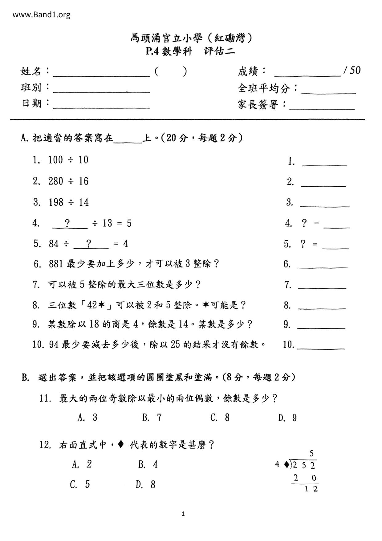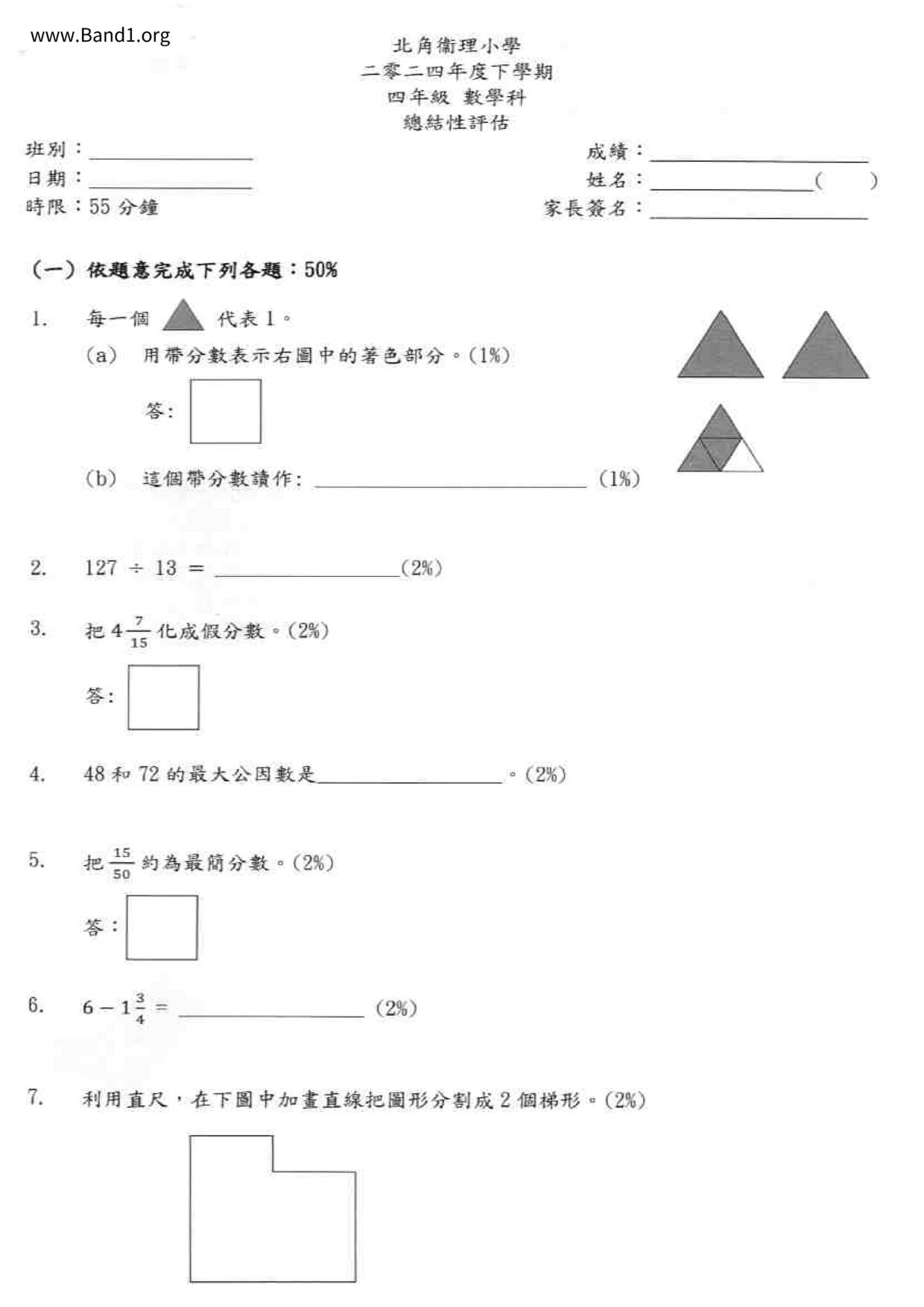 香港 中小學 數學 (HK Maths) 試卷 pdf